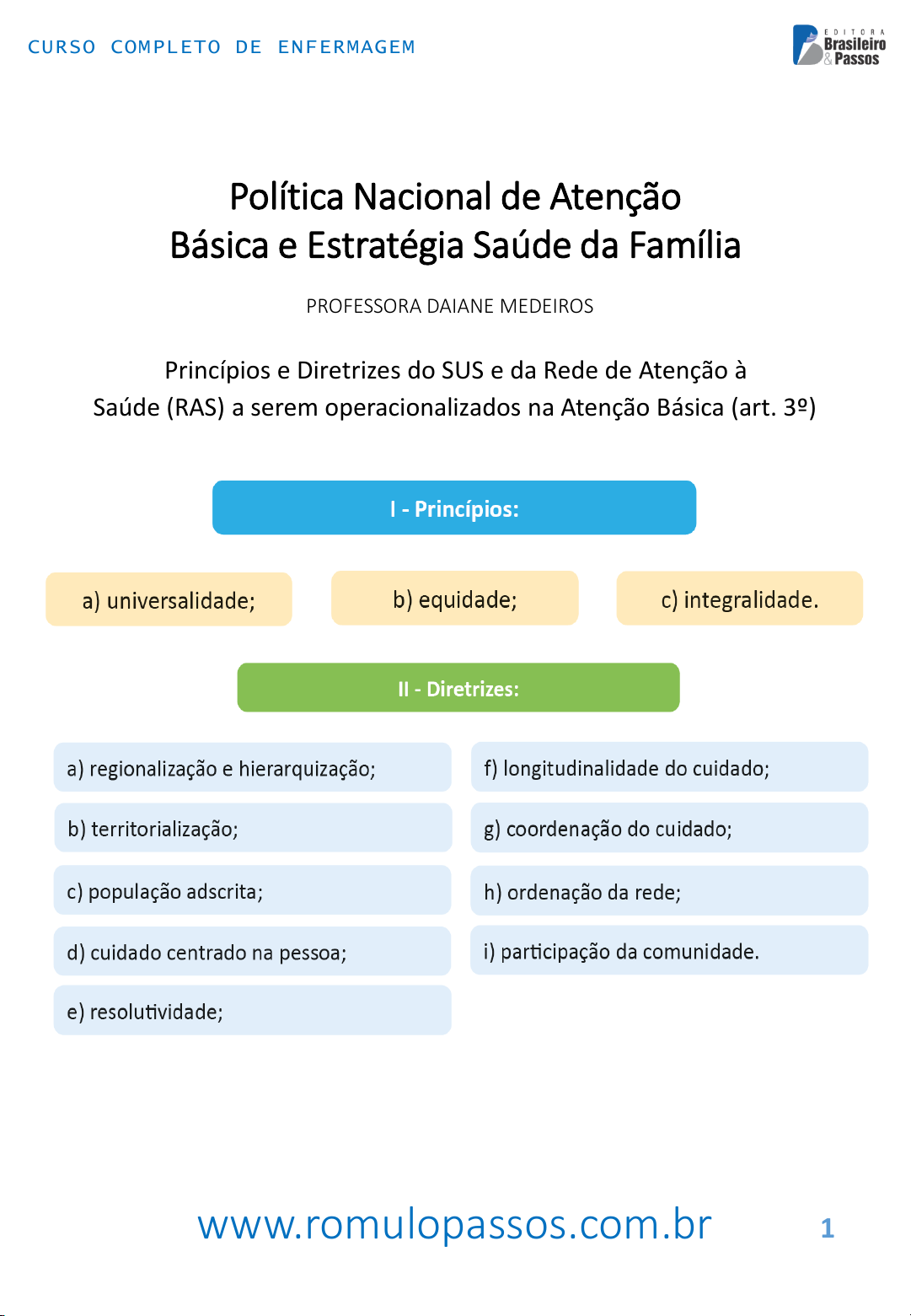 www.romulopassos.com.br CURSO COMPLETO DE ENFERMAGEM 1 PROFESSORA DAIANE MEDEIROS Política Nacional de Atenção Básica e Estratégia Saúde da Família Princípios e Diretrizes do SUS e da Rede de Atenção à Saúde (RAS) a serem operacionalizados na Atenção Básica (art. 3º) MARIA DAS NEVES MADEIRA DE SOUSA - 05152824302 www.romulopassos.com.br CURSO COMPLETO DE ENFERMAGEM 2 1. (Residência Multiprofissional/UNCISAL/2018) De acordo com a Portaria nº 2.436, de 21 de setembro de 2017, são consideradas diretrizes da Atenção Básica: a) Universalidade, Integralidade, Equidade, Controle Social, Hierarquização e Regionalização. b) Regionalização e Hierarquização; Territorialização e Adstrição; População Adscrita; Longitudinalidade do cuidado; Transversalidade; Dissociabilidade de gestão e Coordenação do cuidado e Controle Social. c) Hierarquização e redes de cuidado; Territorialização; População Adscrita; Longitudinalidade do cuidado; Transversalidade; Controle Social e Coordenação do cuidado. d) Regionalização e Hierarquização; Territorialização e Adstrição; População Adscrita; Longitudinalidade do cuidado; Coordenação do cuidado; Ordenação das redes e Participação da comunidade. e) Ter território adscrito; Coordenar a Integralidade e Equidade; Controle Social, Hierarquização e Regionalização. 2. (Prefeitura de Fortaleza-CE/IMPARH/IJF/2019) Ainda sobre a Política Nacional de Atenção Básica, analise as assertivas abaixo e marque com V as afirmativas que forem Verdadeiras e com F as que forem Falsas. ( ) Entende-se por território a unidade geográfica única, de construção descentralizada do SUS na execução das ações estratégicas destinadas à vigilância, promoção, prevenção, proteção e recuperação da saúde. ( ) A longitudinalidade do cuidado pressupõe a continuidade da relação de cuidado, com a construção de vínculo e responsabilização entre profissionais e usuários, acompanhando os efeitos das intervenções em saúde e de outros elementos na vida das pessoas. ( ) Apesar de não ser uma diretriz formal da atenção básica, a participação da comunidade deve ser incentivada, considerando a importância desta para ampliar a autonomia das pessoas e coletividades do território. ( ) É papel da atenção básica elaborar, acompanhar e organizar o fluxo dos usuários entre os pontos de atenção das RAS. Assinale a alternativa correta, de cima para baixo. a) F, F, V, V. b) V, V, F, V. c) V, F, F, F. d) F, V, V, F. 3. (Residência em Enfermagem em Saúde da Família/UNIRIO/2022) A Política Nacional de Atenção Básica tem como princípio a oferta do cuidado, reconhecendo as diferenças nas condições de vida e saúde e de acordo com as necessidades das pessoas, com estratégias que permitam minimizar desigualdades, evitar exclusão social de grupos que possam vir a sofrer estigmatização ou discriminação, de maneira que impacte na autonomia e na situação de saúde. Trata-se, nesse caso, do princípio de: a) equidade. c) resolutividade. b) integralidade. d) intersetorialidade. De acordo com a Portaria do MS nº 2.436/2017, o princípio da equidade é definido da seguinte forma: ofertar o cuidado, reconhecendo as diferenças nas condições de vida e saúde e de acordo com as necessidades das pessoas, considerando que o direito à saúde passa pelas diferenciações sociais e deve atender à diversidade. MARIA DAS NEVES MADEIRA DE SOUSA - 05152824302 www.romulopassos.com.br CURSO COMPLETO DE ENFERMAGEM 3 4. (Residência Multiprofissional e em Área Profissional da Saúde/ENARE /AOCP/2022) A Política Nacional de Atenção Básica (PNAB) tem na Saúde da Família sua estratégia prioritária para expansão e consolidação da Atenção Básica, sendo uma de suas diretrizes: a) a indivisibilidade do cuidado. d) a população adscrita. b) o apoio ambulatorial. e) a gestão de apoio à infraestrutura. c) as ações solidárias. 5. (Residência Multiprofissional em Saúde/UNIRIO/2022) No que diz respeito às diretrizes da Atenção Básica, pode-se dizer que a continuidade da relação de cuidado, com construção de vínculo e responsabilização entre profissionais e usuários ao longo do tempo e de modo permanente e consistente, acompanhando os efeitos das intervenções em saúde e de outros elementos na vida das pessoas, denomina-se: a) ordenar as redes de saúde. c) longitudinalidade do cuidado. b) cuidado centrado na pessoa. d) resolutividade da atenção básica. Ordenar as redes é reconhecer as necessidades de saúde da população sob sua responsabilidade, organizando as necessidades desta população com relação aos outros pontos de atenção à saúde, contribuindo para que o planejamento das ações, assim como a programação dos serviços de saúde, parta das necessidades de saúde das pessoas. 6. (RESMULTI-CE/2020) A Política Nacional de Atenção Básica (PNAB) é resultado da experiência acumulada por um conjunto de atores envolvidos historicamente com o desenvolvimento e a consolidação do Sistema Único de Saúde (SUS), como movimentos sociais, população, trabalhadores e gestores das três esferas de governo. Qual item apresenta uma diretriz da PNAB e sua correta definição? a) Coordenar o cuidado: reconhecer as necessidades de saúde da população sob sua responsabilidade, organizando as necessidades desta população em relação aos outros pontos de atenção à saúde. b) Territorialização e Adscrição: permitir o planejamento, a programação centralizada e o desenvolvimento de ações globais, com impacto na situação, nos condicionantes e determinantes da saúde das pessoas e coletividades. c) Cuidado Centrado na Pessoa: O cuidado é construído com as pessoas, de acordo com suas necessidades e potencialidades na busca de uma vida independente e plena. A família, a comunidade e outras formas de coletividade são elementos relevantes. d) Integralidade: É o conjunto d