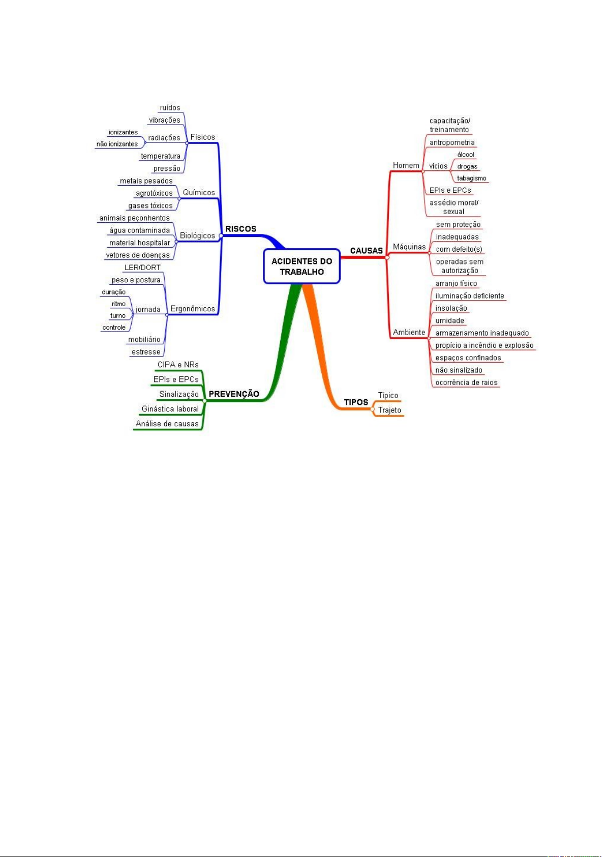 MAPA MENTAL DOS ACIDENTES DO TRABALHO Os acidentes do trabalho não podem ser caracterizados como um fenômeno ambiental já que, ao contrário dos demais temas abordados até aqui, não extrapolam os limites físicos da empresa, ou seja, afetam apenas o homem e não a Natureza. Fazem exceção os acidentes em que produtos químicos extravasam para o meio ambiente; produtos biológicos são misturados aos efluentes das indústrias; e raios destroem árvores em tempestades. Entretanto, como este assunto é o tema principal do nosso site, incluímos este mapa mental para fechar a série. 10.1 - RISCOS Os riscos de acidentes do trabalho podem ser reunidos em 4 grandes grupos: físicos, químicos, biológicos e ergonômicos. 10.1.1 - Físicos. Os riscos de natureza física são os seguintes: a) ruídos - trânsito, máquinas, aviões a jato, motores, explosões, etc.; b) vibrações - britadeiras, tratores, prensas e outras máquinas; c) radiações - ionizantes (raios X e outros) e não ionizantes; d) temperatura - fornos, motores, trabalhos ao ar livre; e e) pressão - mergulho e câmeras hiperbáricas. 10.1.2 - Químicos. Os riscos de natureza química, entre outros, são: a) metais pesados - Ba, Zn, Pb, Cd, Hg, etc. dos efluentes industriais; b) agrotóxicos - resíduos de embalagens de produtos usados na lavoura; e c) gases tóxicos - CO, CO2, CH4 e outros dos veículos, chaminés, lixo, etc. 10.1.3 - Biológicos. Os riscos de natureza biológica são os seguintes: a) animais peçonhentos - cobras, aranhas, escorpiões, abelhas, etc.; b) água contaminada - que contem germes patogênicos; c) material hospitalar - sangue, urina, fezes, vísceras, seringas, etc; e d) vetores de doenças - moscas, baratas, ratos, mosquitos e outros. 10.1.3 - Ergonômicos. Riscos ergonômicos estão relacionados à estrutura músculo-esquelética e psicológica do trabalhador e sua adequação à máquina, mobiliário, posto, jornada e condições de trabalho. Alguns exemplos são: a) LER (lesões por esforços repetitivos) / DORT (doenças osteo-musculares relacionadas ao trabalho); b) Peso e postura incompatíveis com o biotipo e tarefa, respectivamente; c) Jornada (duração, ritmo, turno e controle rígido); d) Mobiliário incompatível, ausente ou desnecessário, no trabalho; e e) Estresse provocado por causas imediatas ou distantes. 10.2 - PREVENÇÃO 10.2.1 - CIPA e NRs. A comissão interna de prevenção de acidentes (CIPA) e as Normas Regulamentadoras do MTE (NRs) são instruções normativas que devem ser seguidas pelas empresas regidas pela CLT. 10.2.2 - EPIs e EPCs. Os equipamentos de proteção individual (EPIs) e os equipamentos de proteção coletiva (EPCs), como dizem os nomes, servem para proteger os operários dos riscos de acidentes iminentes. 10.2.3 - Sinalização. Foi desenvolvida vasta gama de sinais gráficos para alertar os trabalhadores e visitantes dos perigos de acidentes; desde faixas coloridas e reflexivas, até pictogramas em embalagens de agrotóxicos. 10.2.4 - Ginástica laboral. Uma série de exercícios podem ser praticados antes, durante e após a jornada de trabalho, com vistas à melhor disposição para o trabalho, alívio das tensões e relaxamento muscular. 10.2.5 - Análise de causas. Existe uma série de procedimentos investigativos das causas de acidentes, que objetivam evitar que ocorram novamente essas interrupções indesejáveis do trabalho, perdas materiais e até de vidas humanas. 10.3 - CAUSAS Praticamente todas as causas dos acidentes de trabalho estão relacionadas ao homem, às máquinas e ao ambiente. 10.3.1 - Homem a) capacitação/treinamento inadequados; b) antropometria (medidas do corpo incompatíveis com máquina ou tarefa); c) vícios (álcool, drogas e tabagismo) interferindo nas tarefas e atitudes; d) EPIs e EPCs ausentes ou inadequados à tarefa que está sendo executada; e e) Assédio moral/sexual no ambiente de trabalho pode levar ao estresse. 10.3.2 - Máquinas e equipamentos a) utilizados sem a devida proteção contra possíveis acidentes ou quebra; b) inadequadas ao tipo de tarefa que está sendo executada; c) com defeito(s); e d) operadas sem autorização. 10.3.3 - Ambiente laboral a) arranjo físico ou lay out incompatível com a tarefa; b) iluminação deficiente; c) insolação excessiva ou por tempo prolongado; d) umidade elevada ou frio intenso; e) armazenamento dos produtos inadequado; f) propício a incêndio e explosão; g) espaços confinados (tanques, silos, bueiros e assemelhados); h) não sinalizado ou feito de forma imprópria; e i) ocorrência de raios (trabalho ao ar livre, sob tempestade). 10.4 - TIPOS Todos os acidentes do trabalho podem ser reunidos em apenas 2 tipos: 10.4.1 - Típico. Aquele que ocorre na empresa, por conta dos riscos e causas acima apontados. 10.4.2 - Trajeto. Aquele que ocorre durante o percurso casa-trabalho e vice-versa e, em geral, a bordo de um veículo. image1.jpeg