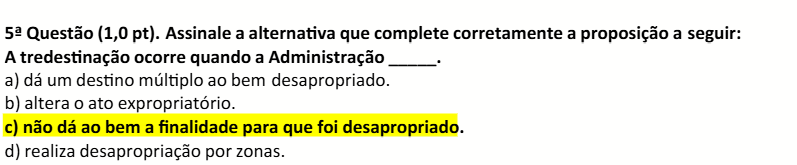 Questão (1,0 pt). Assinale a alternativa que complete corretamente a proposição a seguir: A tredestinação ocorre quando a Administração a) dá um destino múltiplo ao bem desapropriado. b) altera O ato expropriatório. c) não dá ao bem a finalidade para que foi desapropriado. d) realiza desapropriação por zonas.