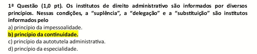 Questão (1,0 pt). Os institutos de direito administrativo são informados por diversos princípios. Nessas condições, a "suplência", a "delegação" e a "substituição" são institutos informados pelo a) princípio da impessoalidade. b) princípio da continuidade. c) princípio da autotutela administrativa. d) princípio da especialidade.