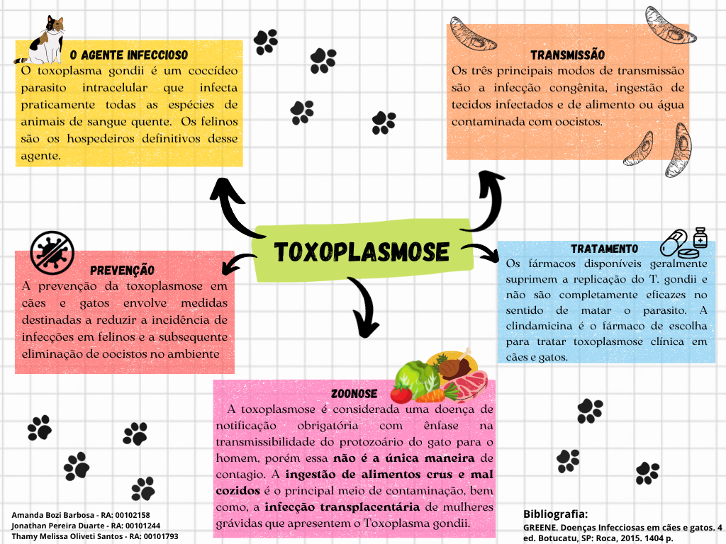 0 AGENTE INFECCIOSO TRANSMISSÃO toxoplasma gondii é um coccídeo Os três principais modos de transmissão parasito intracelular que infecta são a infecção congênita, ingestão de praticamente todas as espécies de tecidos infectados e de alimento ou água animais de sangue quente. Os felinos contaminada com oocistos. são os hospedeiros definitivos desse agente. TOXOPLASMOSE TRATAMENTO PREVENÇÃO Os fármacos disponíveis geralmente suprimem a replicação do T. gondii e A prevenção da toxoplasmose em não são completamente eficazes no cães e gatos envolve medidas sentido de matar O parasito. A destinadas a reduzir a incidência de clindamicina é fármaco de escolha infecções em felinos e a subsequente para tratar toxoplasmose clínica em eliminação de oocistos no ambiente cães e gatos. ZOONOSE A toxoplasmose é considerada uma doença de notificação obrigatória com ênfase na transmissibilidade do protozoário do gato para homem, porém essa não é a única maneira de contagio. A ingestão de alimentos crus e mal cozidos é principal meio de contaminação, bem como, a infecção transplacentária de mulheres Amanda Bozi Barbosa RA: 00102158 Bibliografia: Jonathan Pereira Duarte RA: 00101244 grávidas que apresentem Toxoplasma gondii. GREENE. Doenças Infecciosas em e gatos. 4 Thamy Melissa Oliveti Santos RA: 00101793 ed. Botucatu, SP: Roca, 2015. 1404 p.