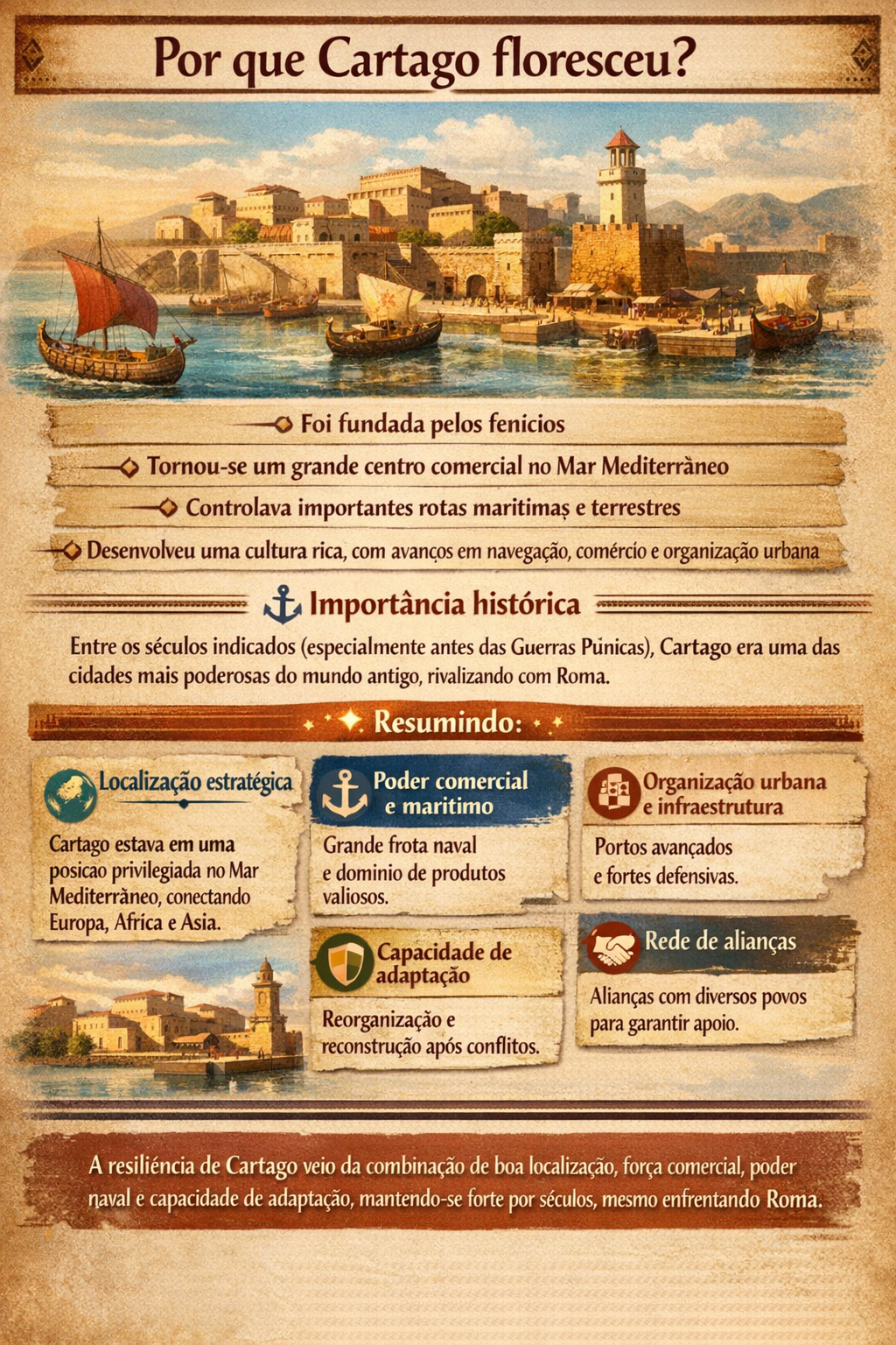 Por que Cartago floresceu? Foi fundada pelos fenicios Tornou-se um grande centro comercial no Mar Mediterràneo Controlava importantes rotas maritimaș e terrestres Desenvolveu uma cultura rica, com avanços em navegação, comércio e organização urbana Importância histórica Entre os séculos indicados (especialmente antes das Guerras Cartago era uma das cidades mais poderosas do mundo antigo, rivalizando com Roma. Resumindo: Localização estratégica Poder comercial Organização urbana e maritimo e infraestrutura Cartago estava em uma Grande frota naval Portos avançados posicao privilegiada no Mar e dominio de produtos e fortes defensivas. conectando valiosos. Europa, Africa e Asia. Capacidade de Rede de alianças adaptação Alianças com diversos povos Reorganização e para garantir apoio. reconstrução após conflitos. A resiliéncia de Cartago veio da combinação de boa localização, força comercial, poder naval e capacidade de adaptação, mantendo-se forte por séculos, mesmo enfrentando Roma.