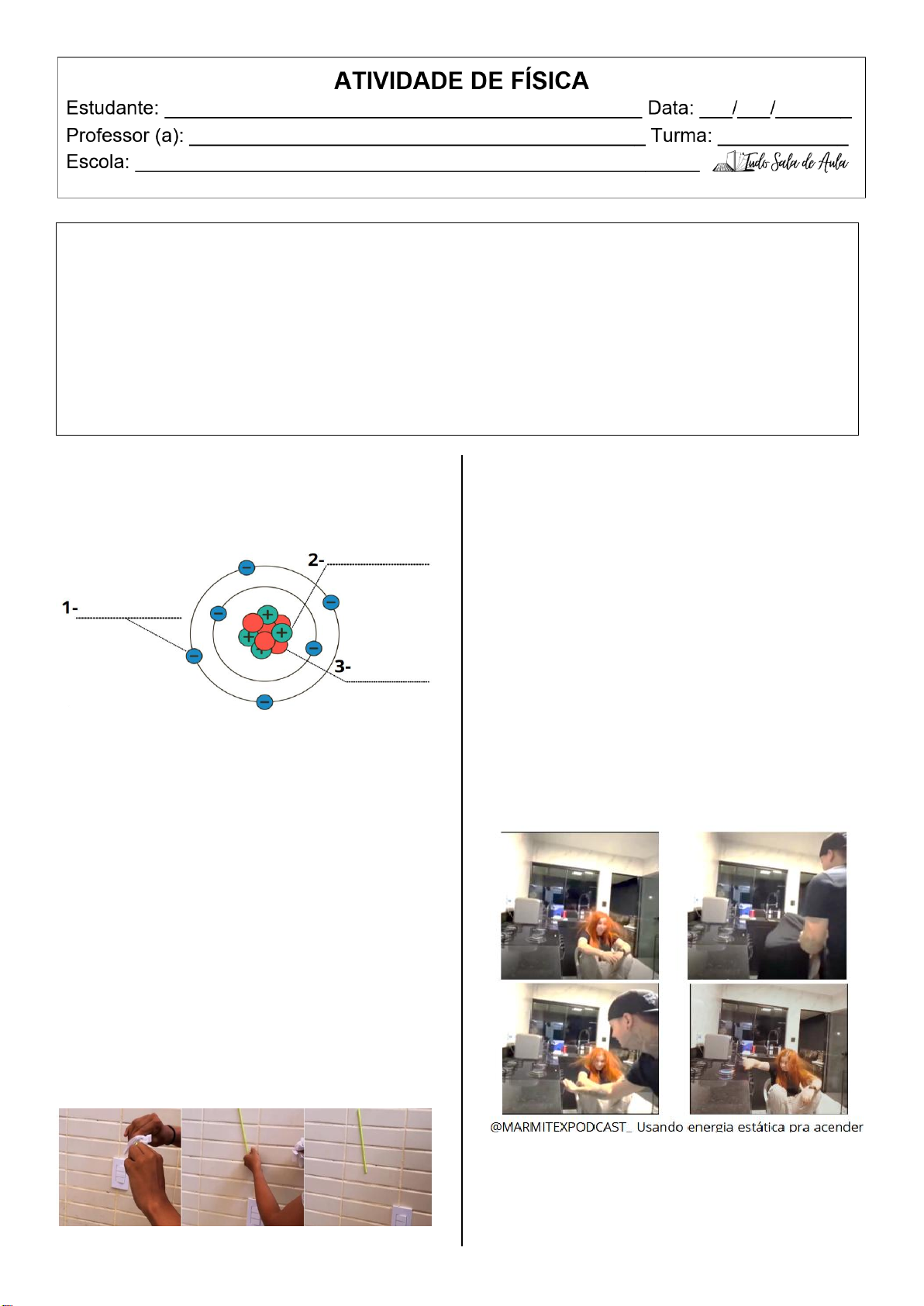 CARGA ELÉTRICA E SUAS PROPRIEDADES A carga elétrica é uma propriedade presente em algumas partículas que formam a matéria. Os prótons, encontrados no núcleo dos átomos, possuem carga positiva (+). Os elétrons, que giram ao redor do núcleo, têm carga negativa (–). Já os nêutrons não possuem carga, sendo partículas neutras. Quando dois corpos possuem cargas de sinais opostos, eles se atraem; quando têm cargas iguais, se repelem. A menor quantidade de carga possível é chamada de carga elementar, representada pela carga do elétron ou do próton que vale 𝑒 = 1,6 . 10−19 A quantidade de carga de um corpo pode ser calculada multiplicando-se o número de cargas elementares pela carga de cada partícula. Esses conceitos ajudam a entender fenômenos elétricos presentes no cotidiano, como eletrização, descargas elétricas e funcionamento de aparelhos eletrônicos. Atividade________________________________________ 1. Com base no texto e na imagem abaixo, identifique e nomeie cada partícula (prótons, elétrons e nêutrons) de acordo com sua localização no átomo e sua carga. 2. Conforme as propriedades das cargas elétricas, corpos eletrizados podem se atrair ou se repelir conforme o tipo de carga que possuem. Assinale a alternativa que descreve corretamente esse comportamento. a) Corpos com cargas positivas sempre se atraem, independentemente do tipo de carga presente no outro corpo. b) Corpos eletrizados negativamente repelem corpos neutros e atraem corpos positivamente carregados. c) Cargas de sinais opostos se atraem, enquanto cargas de mesmo sinal se repelem. d) Cargas positivas atraem outras cargas positivas, mas repelem cargas negativas. e) Corpos neutros nunca sofrem atração elétrica, pois não possuem carga. 3. Durante uma atividade experimental, uma professora de Física utiliza um papel-toalha para esfregar repetidas vezes um canudo de plástico. Depois disso, ela encosta o canudo na parede e percebe que ele fica grudado na superfície. Fonte: @prof.fisicaalana Com base nos conceitos de eletrização, assinale a alternativa que explica corretamente o fenômeno observado. a) O atrito aquece o canudo, fazendo com que ele derreta levemente e se prenda mecanicamente à parede. b) O canudo adquire carga elétrica por atrito e, ao se aproximar da parede neutra, induz a separação de cargas, gerando atração eletrostática. c) A fricção gera um campo magnético no canudo, que interage com materiais ferromagnéticos presentes na tinta da parede. d) O papel-toalha libera partículas adesivas microscópicas que fazem o canudo colar temporariamente na superfície. e) O canudo torna-se eletricamente neutro após o atrito e, por isso, atrai corpos carregados ao seu redor. 4. Em um vídeo popular nas redes sociais, um homem esfrega repetidas vezes uma toalha de algodão nos cabelos da mulher. Depois disso, ela encosta o dedo no queimador do fogão e a chama acende apenas com o toque. Com base nos conceitos de eletrização, explique por que isso acontece. Assinale a alternativa correta. a) A fricção da toalha com os cabelos aquece o ar ao redor, permitindo que o fogão detecte a presença de calor e, assim, acenda a chama. https://www.tudosaladeaula.com/ https://www.tudosaladeaula.com/ https://www.tudosaladeaula.com/ https://www.tudosaladeaula.com/ b) Ao esfregar a toalha nos cabelos, ocorre eletrização por contato, fazendo com que o dedo da mulher fique carregado positivamente, acionando o sensor térmico do fogão. c) A toalha cria um campo magnético temporário, ativando o sistema de acendimento automático, que funciona por indução magnética. d) O fogão acende porque a toalha libera íons no ar, que viajam até o queimador, sendo reconhecidos pelo sensor químico do aparelho. e) A fricção entre a toalha de algodão e os cabelos provoca eletrização por atrito, carregando o corpo da mulher com excesso de elétrons. Quando ela toca no fogão, ocorre uma descarga elétrica detectada pelo acendedor eletrônico, gerando a faísca. Leia para responder às questões 5 e 6. Um experimento é realizando em sala utilizando materiais de baixo custo, seguem as seguintes etapas: EXPERIMENTO SOBRE ELETRIZAÇÃO 1º Etapa: Faça um furo no fundo de um copo descartável de forma a caber um palito de dente. 2ª Etapa: Pegue um canudo dobre ao meio e outro deixe normal, em seguida atrite os dois com ajuda de um papel toalha. 3ª Etapa: Coloque o canudo dobrado sobre o palito preso ao copo. 4º Etapa: Aproxime o canudo reto (eletrizado) do canudo dobrado (também eletrizado) e veja ambos de repelindo. Fonte: @prof.fisicaalana 5. Na natureza, a eletrização pode ocorrer por atrito, contato ou indução. Observe a situação representada no experimento e na imagem, em seguida, identifique qual processo de eletrização está sendo demonstrado. a) Eletrização por atrito. b) Eletrização por indução. c) Eletrização por atrito e indução. d) Eletrização por atrito e contato. e) Eletrização por contato e indução. 6. Qual é a condição física fundamental que permite a observação da repulsão entre os dois canudos neste experimento? a) O atrito dos canudos com o papel toalha garante que a massa de um é maior que a massa do outro. b) O palito de dente serve apenas como um ponto de apoio móvel (eixo) para que um dos canudos possa girar livremente. c) O papel toalha é um material isolante, garantindo que os canudos percam todos os seus elétrons. d) O fato de os dois canudos terem sido atritados com o mesmo material isolante e sob as mesmas condições, resultando em ambos com cargas elétricas de mesmo sinal (positiva ou negativa). e) A força gravitacional entre os dois canudos torna-se maior do que a força de atração eletrostática após o atrito. Leia a descrição abaixo e observe as imagens. Um trabalhador está carregando um caminhão com grandes novelos de tecidos de algodão. Após organizar a carga, ele salta de cima dos tecidos, e, ao tocar 