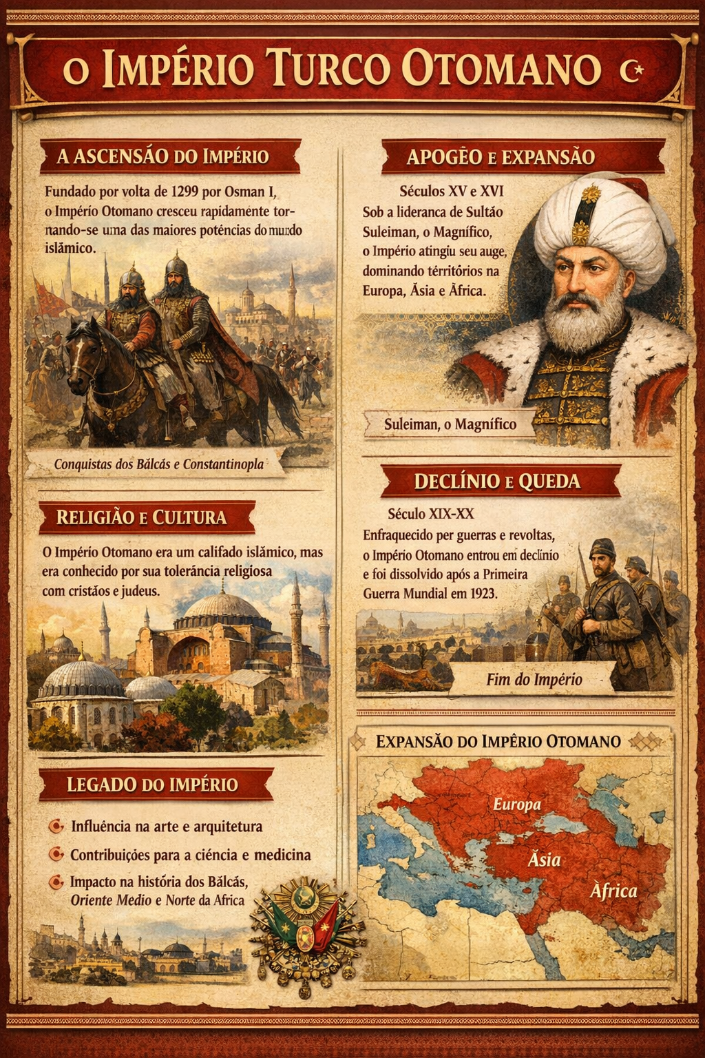 IMPÉRIO TURCO OTOMANO C* A DO IMPÉRIO E EXPANSÃO Fundado por volta de 1299 por Osman I, Séculos XV e XVI 0 Otomano cresceu tor- Sob a lideranca de Sultão nando-se uma das maiores poténcias do murdo Suleiman, Magnífico, 0 Império atingiu seu auge, dominando térritórios na Europa, Ásia e Suleiman, Magnífico Conquistas dos Bălcás e Constantinopla DECLÍNIO E QUEDA RELIGIÃO E CULTURA Século XIX-XX Enfraquecido per guerras e revoltas, 0 Império Otomano era um califado islămico, mas 0 Império Otomano entrou em era conhecido por sua toleráncia religiosa e foi dissolvido após a Primeira com cristãos e judeus. Guerra Mundial em 1923. Fim do Império EXPANSÃO DO IMPÊRIO OTOMANO LEGADO DO IMPÉRIO Europa na arte e arquitetura Contribuições para a ciéncia e medicina Ásia Impacto na história dos Oriente Medio e Norte da Africa