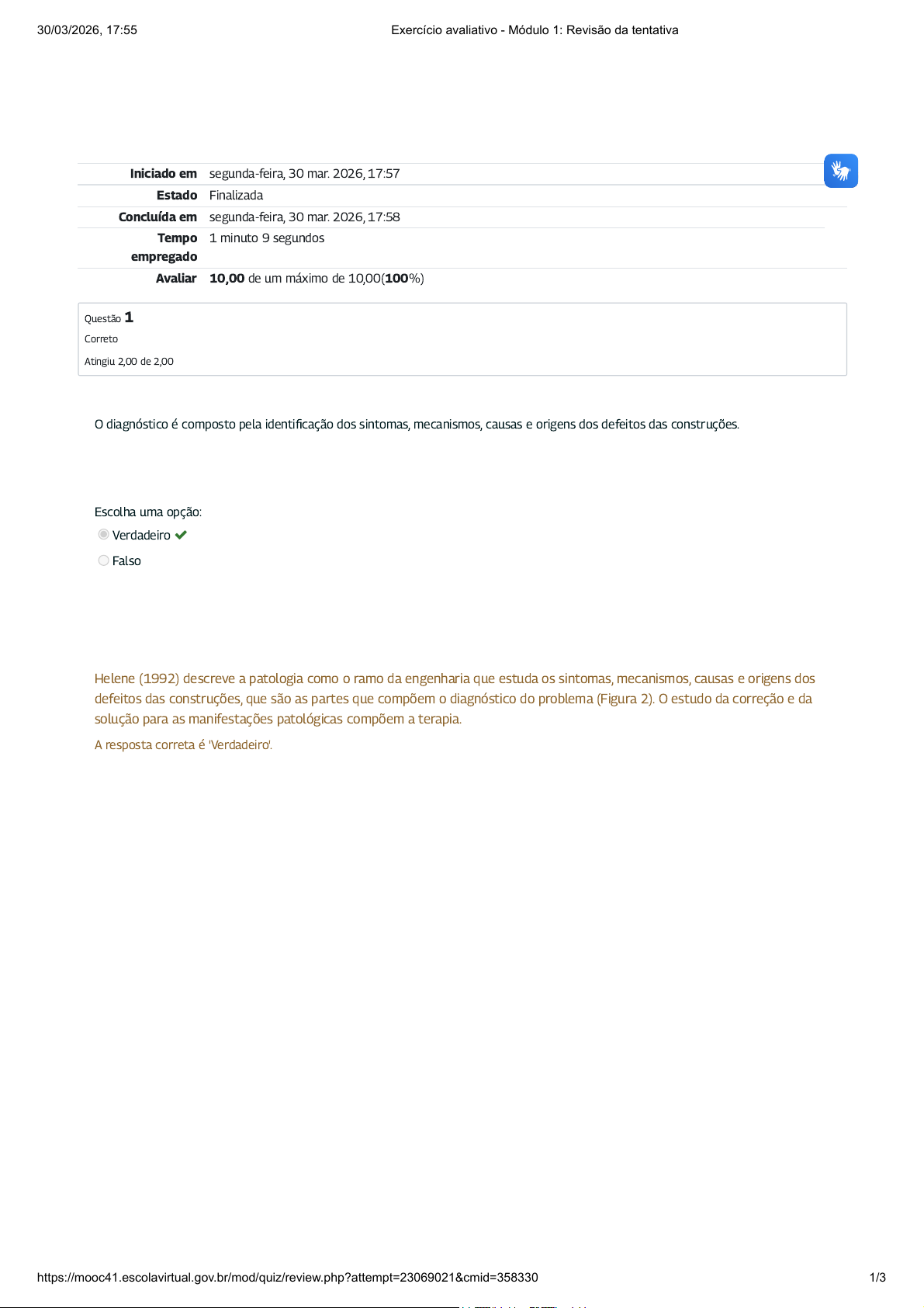 Iniciado em segunda-feira, 30 mar. 2026, 17:57 Estado Finalizada Concluída em segunda-feira, 30 mar. 2026, 17:58 Tempo empregado 1 minuto 9 segundos Avaliar 10,00 de um máximo de 10,00(100%) Questão 1 Correto Atingiu 2,00 de 2,00 O diagnóstico é composto pela identificação dos sintomas, mecanismos, causas e origens dos defeitos das construções. Escolha uma opção: Verdadeiro Falso Helene (1992) descreve a patologia como o ramo da engenharia que estuda os sintomas, mecanismos, causas e origens dos defeitos das construções, que são as partes que compõem o diagnóstico do problema (Figura 2). O estudo da correção e da solução para as manifestações patológicas compõem a terapia. A resposta correta é 'Verdadeiro'. 30/03/2026, 17:55 Exercício avaliativo - Módulo 1: Revisão da tentativa https://mooc41.escolavirtual.gov.br/mod/quiz/review.php?attempt=23069021&cmid=358330 1/3 Questão 2 Correto Atingiu 2,00 de 2,00 Questão 3 Correto Atingiu 2,00 de 2,00 As inspeções visuais são a principal fonte de informações para a composição do diagnóstico das estruturas, devendo ser complementada por testes e medições em alguns casos. Escolha uma opção: Verdadeiro Falso As inspeções visuais retornam 80 % das informações relevantes para a gestão das estruturas com apenas 20 % dos custos de inspeção. Mas há a necessidade de complementações dessas informações em alguns casos. Esses procedimentos, por serem mais onerosos, devem ser realizados em casos e momentos específicos (CEB-FIB, 2002). A resposta correta é 'Verdadeiro'. O ultrassom é utilizado para detecção de vazios, fissuras e vazios no interior do concreto. Além dessas funcionalidades, também pode ser correlacionado com algumas propriedades do concreto, como a resistência. Escolha uma opção: Verdadeiro Falso O que ocorre é a correlação com a resistência do concreto, necessitando da extração de amostras da estrutura para o estabelecimento desta correlação. A resposta correta é 'Verdadeiro'. 30/03/2026, 17:55 Exercício avaliativo - Módulo 1: Revisão da tentativa https://mooc41.escolavirtual.gov.br/mod/quiz/review.php?attempt=23069021&cmid=358330 2/3 Questão 4 Correto Atingiu 2,00 de 2,00 Questão 5 Correto Atingiu 2,00 de 2,00 Os ensaios pullout e pulloff, embora possuam nomes distintos, são exatamente iguais e medem a resistência superficial do concreto. Escolha uma opção: Verdadeiro Falso Resposta correta: Falso. Os ensaios são diferentes e medem propriedades distintas, em especial pela forma como as tensões são mobilizadas. Resposta correta: Falso. Os ensaios são diferentes e medem propriedades distintas, em especial pela forma como as tensões são mobilizadas. A resposta correta é 'Falso'. Os testes e medições realizados em estruturas de concreto, embora sejam altamente especializados, podem retornar mais de uma informação. Exemplo disso é o ultrassom, que fornece informações sobre a existência de falhas e sobre a profundidade das fissuras. Escolha uma opção: Verdadeiro Falso Um mesmo tipo de equipamento ou metodologia pode ser usado para se obter diferentes informações. Um exemplo é a observação da profundidade das fissuras por meio do ultrassom ou impacto-eco, já apresentados anteriormente para avaliação da existência de falhas ou vazios no concreto. A resposta correta é 'Verdadeiro'. 30/03/2026, 17:55 Exercício avaliativo - Módulo 1: Revisão da tentativa https://mooc41.escolavirtual.gov.br/mod/quiz/review.php?attempt=23069021&cmid=358330 3/3