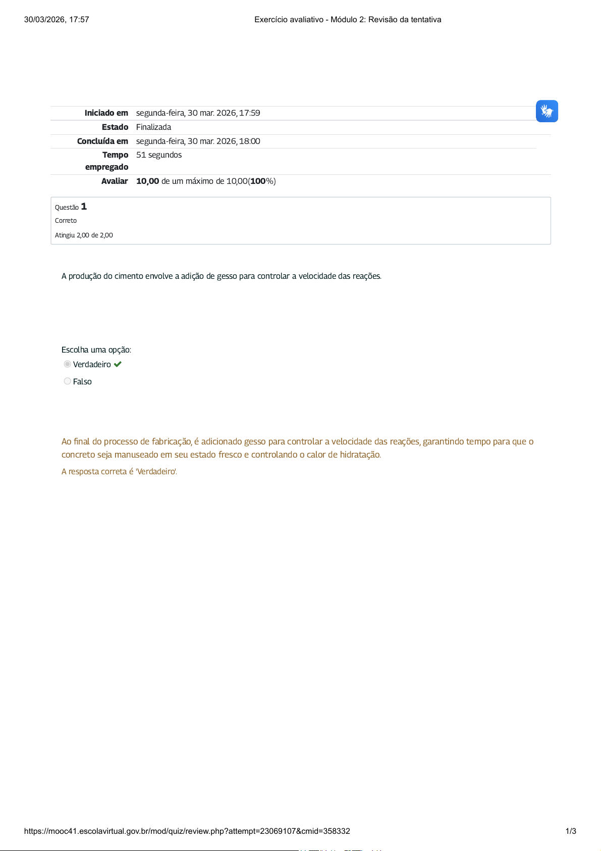 Iniciado em segunda-feira, 30 mar. 2026, 17:59 Estado Finalizada Concluída em segunda-feira, 30 mar. 2026, 18:00 Tempo empregado 51 segundos Avaliar 10,00 de um máximo de 10,00(100%) Questão 1 Correto Atingiu 2,00 de 2,00 A produção do cimento envolve a adição de gesso para controlar a velocidade das reações. Escolha uma opção: Verdadeiro Falso Ao final do processo de fabricação, é adicionado gesso para controlar a velocidade das reações, garantindo tempo para que o concreto seja manuseado em seu estado fresco e controlando o calor de hidratação. A resposta correta é 'Verdadeiro'. 30/03/2026, 17:57 Exercício avaliativo - Módulo 2: Revisão da tentativa https://mooc41.escolavirtual.gov.br/mod/quiz/review.php?attempt=23069107&cmid=358332 1/3 Questão 2 Correto Atingiu 2,00 de 2,00 Questão 3 Correto Atingiu 2,00 de 2,00 Sem a adição de sulfatos ao cimento haveria o rápido enrijecimento do concreto e a grande liberação de calor em pouco tempo, inviabilizariam a utilização do cimento para aplicações práticas. Escolha uma opção: Verdadeiro Falso Resposta correta: Verdadeiro. A elevada solubilidade do gesso reduz a solubilidade dos aluminatos, dando tempo para que o concreto seja trabalhado (transportado, lançado e adensado). Resposta correta: Verdadeiro. A elevada solubilidade do gesso reduz a solubilidade dos aluminatos, dando tempo para que o concreto seja trabalhado (transportado, lançado e adensado). A resposta correta é 'Verdadeiro'. A retração química, também denominada contração Le Chatelier, ocorre enquanto o concreto ainda se comporta como um fluido, de forma que as fissuras são formadas nessa fase. Escolha uma opção: Verdadeiro Falso A retração química, também denominada contração Le Chatelier, ocorre enquanto não são formados produtos suficientes para estabelecer um “esqueleto” que imponha restrição à redução de volume. Isso implica em dizer que não são formadas fissuras no concreto nessa fase, uma vez que não há restrição à deformação e, por consequência, não são gerados esforços internos. A resposta correta é 'Falso'. 30/03/2026, 17:57 Exercício avaliativo - Módulo 2: Revisão da tentativa https://mooc41.escolavirtual.gov.br/mod/quiz/review.php?attempt=23069107&cmid=358332 2/3 Questão 4 Correto Atingiu 2,00 de 2,00 Questão 5 Correto Atingiu 2,00 de 2,00 De acordo com o texto apresentado, a retração autógena ocorre pelo consumo de água pelas reações de hidratação e a retração por secagem pela perda da água evaporável para o ambiente. Escolha uma opção: Verdadeiro Falso A autodessecação pode ser entendida como o consumo da água evaporável pela reação de hidratação do cimento. Com o passar do tempo, e com o consequente ganho de resistência do concreto, ocorre a retração por secagem. Neste caso, a variação ocorre pela perda de água para o ambiente, e não para a hidratação do cimento. A resposta correta é 'Verdadeiro'. Os meniscos formados pela interface ar-água dentro dos poros do concreto exercem esforço suficiente para a retração do concreto. Após o concreto ser novamente saturado pela água, suas dimensões sempre voltam ao tamanho original. Escolha uma opção: Verdadeiro Falso Conforme apresentado no Módulo 2, fica evidente que a motivação principal para a ocorrência da retração por secagem é a perda de água para o ambiente, por evaporação, sendo esperado que o concreto retorne à sua dimensão original quando for novamente saturado e os meniscos desaparecerem. Mas, não é o que ocorre, ficando uma deformação residual, como mostrado na Figura 6 do Módulo 2. A resposta correta é 'Falso'. 30/03/2026, 17:57 Exercício avaliativo - Módulo 2: Revisão da tentativa https://mooc41.escolavirtual.gov.br/mod/quiz/review.php?attempt=23069107&cmid=358332 3/3