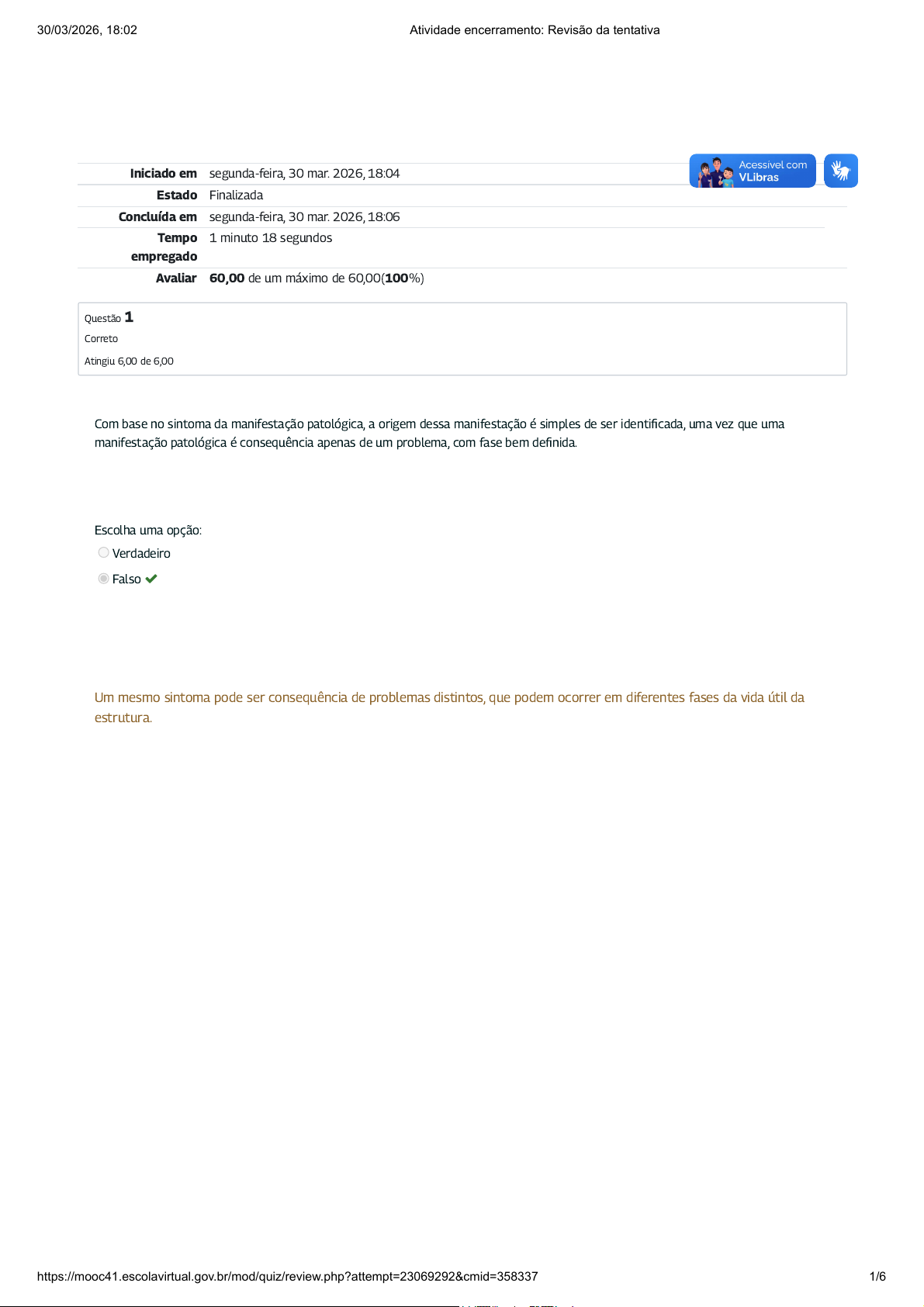 Iniciado em segunda-feira, 30 mar. 2026, 18:04 Estado Finalizada Concluída em segunda-feira, 30 mar. 2026, 18:06 Tempo empregado 1 minuto 18 segundos Avaliar 60,00 de um máximo de 60,00(100%) Questão 1 Correto Atingiu 6,00 de 6,00 Com base no sintoma da manifestação patológica, a origem dessa manifestação é simples de ser identificada, uma vez que uma manifestação patológica é consequência apenas de um problema, com fase bem definida. Escolha uma opção: Verdadeiro Falso Um mesmo sintoma pode ser consequência de problemas distintos, que podem ocorrer em diferentes fases da vida útil da estrutura. 30/03/2026, 18:02 Atividade encerramento: Revisão da tentativa https://mooc41.escolavirtual.gov.br/mod/quiz/review.php?attempt=23069292&cmid=358337 1/6 Questão 2 Correto Atingiu 6,00 de 6,00 Questão 3 Correto Atingiu 6,00 de 6,00 Suponha um caso em que foi constatada a abertura exagerada de uma fissura durante a passagem de um veículo. Nesse caso pode ser afirmado que a causa foi a baixa capacidade de carga da estrutura. Escolha uma opção: Verdadeiro Falso O agente causador (causa) foi o veículo. A baixa capacidade de carga da estrutura frente ao carregamento aplicado é uma falha que pode ter origem em diferentes fases. No caso em estudo, podem ter ocorrido falhas em qualquer uma das fases, inclusive na fase de uso, com a passagem de um veículo não previsto no projeto. A avaliação da resistência do concreto pode ser feita pela medição em amostras extraídas da estrutura (método direto) ou pode ser determinada de forma não destrutiva (método indireto). Um método indireto é o esclerômetro, que mede a dureza superficial do concreto e é correlacionada com a resistência à compressão de amostras extraídas da estrutura. Escolha uma opção: Verdadeiro Falso As medidas indiretas podem ser correlacionadas com propriedades mecânicas do concreto, desde que sejam extraídas amostras da estrutura para o estabelecimento da correlação. 30/03/2026, 18:02 Atividade encerramento: Revisão da tentativa https://mooc41.escolavirtual.gov.br/mod/quiz/review.php?attempt=23069292&cmid=358337 2/6 Questão 4 Correto Atingiu 6,00 de 6,00 Questão 5 Correto Atingiu 6,00 de 6,00 Os silicatos (alita e belita) possuem estruturas semelhantes, por isso resultam em produtos semelhantes e com proporções também semelhantes. Escolha uma opção: Verdadeiro Falso Essas duas reações resultam em produtos semelhantes, mas com proporções diferentes, e ocorrem com velocidades distintas. Cimentos com maiores teores de C S (alita) apresentam maiores resistências iniciais que os cimentos com maiores teores de C S (belita). Escolha uma opção: Verdadeiro Falso 3 2 A maior parte dos cimentos comercializados atualmente possuem maior proporção de C S pelo fato de ganharem resistência mais rapidamente que o C S (Ver Figura 2 da apostila). 3 2 30/03/2026, 18:02 Atividade encerramento: Revisão da tentativa https://mooc41.escolavirtual.gov.br/mod/quiz/review.php?attempt=23069292&cmid=358337 3/6 Questão 6 Correto Atingiu 6,00 de 6,00 Questão 7 Correto Atingiu 6,00 de 6,00 Tanto a retração por secagem quanto a deformação por fluência ocorrem pela perda de água, o que as difere é que na fluência a remoção da água ocorre pela aplicação de carga e a retração por secagem, a água é perdida pela evaporação. Escolha uma opção: Verdadeiro Falso A fluência ocorre também por perda de água, mas se trata da água fisicamente adsorvida ao C-S-H. Essa perda ocorre quando a pasta de cimento hidratada fica submetida à pressão por algum tempo. Dependendo da idade, da resistência do concreto quando colocado em carga, umidade relativa do ar e de outros fatores, a redução de volume pode ser maior ou menor (Mehta e Monteiro, 2008). Enquanto a retração por secagem é provocada pela perda de água para o ambiente, por diferença na umidade relativa, a perda de água por fluência é provocada por tensão. As fissuras provocadas por esforço cortante em uma viga biapoiada são inclinadas de aproximadamente 45º e são localizadas nas proximidades dos apoios. Escolha uma opção: Verdadeiro Falso As fissuras formadas pela ação de esforço cortante possuem inclinação próxima a 45º. Geralmente aparecem nas proximidades dos apoios, onde o esforço cortante é maior. As fissuras provocadas por momento fletor são verticais e são encontradas próximas ao meio do vão (tracionando fibras inferiores da viga) ou nos pontos de momento fletor negativo (tracionando fibras superiores da viga). 30/03/2026, 18:02 Atividade encerramento: Revisão da tentativa https://mooc41.escolavirtual.gov.br/mod/quiz/review.php?attempt=23069292&cmid=358337 4/6 Questão 8 Correto Atingiu 6,00 de 6,00 Questão 9 Correto Atingiu 6,00 de 6,00 Os recalques de apoio não introduzem esforços adicionais nas estruturas de forma que nunca dão origem a fissuras. Escolha uma opção: Verdadeiro Falso Os recalques de apoio são um tipo de movimentação imposta aos elementos estruturais e introduzem esforços adicionais não previstos no dimensionamento das estruturas. O ataque por sulfatos não requer a interação com produtos de hidratação do cimento, bastando o acesso à estrutura porosa do concreto para se expandir sob ação da água. Escolha uma opção: Verdadeiro Falso As reações envolvem os sulfatos e produtos de hidratação do cimento, em especial o hidróxido de cálcio e as fases que contêm alumina. 30/03/2026, 18:02 Atividade encerramento: Revisão da tentativa https://mooc41.escolavirtual.gov.br/mod/quiz/review.php?attempt=23069292&cmid=358337 5/6 Questão 10 Correto Atingiu 6,00 de 6,00 Quando falamos em ataque por sulfatos, a formação de etringita tardia se difere dos demais casos pelo fato da fonte de sulfatos ser interna, e não externa. Escolha uma opção: Verdadeiro Falso A utilização de cura térmica acima de 65 ºC torna a etringita instável, promovendo sua decomposição em monossul