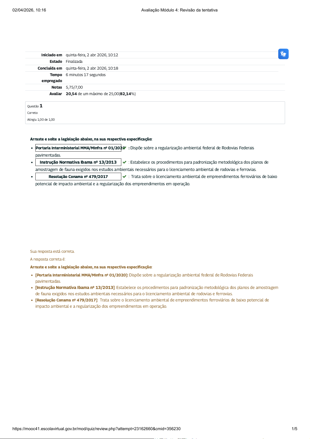 Iniciado em quinta-feira, 2 abr. 2026, 10:12 Estado Finalizada Concluída em quinta-feira, 2 abr. 2026, 10:18 Tempo empregado 6 minutos 17 segundos Notas 5,75/7,00 Avaliar 20,54 de um máximo de 25,00(82,14%) Questão 1 Correto Atingiu 1,00 de 1,00 Arraste e solte a legislação abaixo, na sua respectiva especificação: Portaria Interministerial MMA/MInfra nº 01/2020 : Dispõe sobre a regularização ambiental federal de Rodovias Federais pavimentadas. Instrução Normativa Ibama nº 13/2013 : Estabelece os procedimentos para padronização metodológica dos planos de amostragem de fauna exigidos nos estudos ambientais necessários para o licenciamento ambiental de rodovias e ferrovias. Resolução Conama nº 479/2017 : Trata sobre o licenciamento ambiental de empreendimentos ferroviários de baixo potencial de impacto ambiental e a regularização dos empreendimentos em operação. Sua resposta está correta. A resposta correta é: Arraste e solte a legislação abaixo, na sua respectiva especificação: [Portaria Interministerial MMA/MInfra nº 01/2020]: Dispõe sobre a regularização ambiental federal de Rodovias Federais pavimentadas. [Instrução Normativa Ibama nº 13/2013]: Estabelece os procedimentos para padronização metodológica dos planos de amostragem de fauna exigidos nos estudos ambientais necessários para o licenciamento ambiental de rodovias e ferrovias. [Resolução Conama nº 479/2017]: Trata sobre o licenciamento ambiental de empreendimentos ferroviários de baixo potencial de impacto ambiental e a regularização dos empreendimentos em operação. 02/04/2026, 10:16 Avaliação Módulo 4: Revisão da tentativa https://mooc41.escolavirtual.gov.br/mod/quiz/review.php?attempt=23162660&cmid=356230 1/5 Questão 2 Correto Atingiu 1,00 de 1,00 Questão 3 Correto Atingiu 1,00 de 1,00 Com relação a Autorização de Operação - AO definida na Portaria MMA/MINFRA nº 01/2020, marque a opção correta: Escolha uma opção: a. Substitui permanentemente a Licença de Operação na regularização de rodovias. b. A Autorização de Operação é o ato autorizativo precário e transitório da operação de empreendimento ou atividade e que estabelece as medidas necessárias à expedição de Licença de Operação (LO). c. A Autorização de Operação desobriga a execução doe Programas Ambientais para operação da rodovia e atividades rodoviária. d. Todas os itens acimas estão errados. Sua resposta está correta. A resposta correta é: A Autorização de Operação é o ato autorizativo precário e transitório da operação de empreendimento ou atividade e que estabelece as medidas necessárias à expedição de Licença de Operação (LO). O procedimento simplificado de licenciamento ambiental de Ferrovias será iniciado pela apresentação do requerimento de . O requerimento deverá ser acompanhado das seguintes informações: Documentos e/ou autorizações legais exigidos, conforme o caso, por força de normas federais, estaduais e municipais aplicáveis; e – elaborado com base em dados secundários e de monitoramento existentes, a partir de termo de referência padrão estabelecido pelo órgão ambiental competente. O prazo para análise dos estudos ambientais é de dias. Nesse prazo, poderão ser realizadas , solicitações de esclarecimentos e complementações de informações ao empreendedor, caso necessário. Ao final da análise, deverá ser emitido um , de forma a subsidiar a tomada de decisão. Licença de Instalação Relatório ambiental simplificado – RAS 90 (noventa) vistorias técnicas parecer técnico conclusivo Sua resposta está correta. A resposta correta é: O procedimento simplificado de licenciamento ambiental de Ferrovias será iniciado pela apresentação do requerimento de [Licença de Instalação]. O requerimento deverá ser acompanhado das seguintes informações: Documentos e/ou autorizações legais exigidos, conforme o caso, por força de normas federais, estaduais e municipais aplicáveis; e [Relatório ambiental simplificado – RAS] – elaborado com base em dados secundários e de monitoramento existentes, a partir de termo de referência padrão estabelecido pelo órgão ambiental competente. O prazo para análise dos estudos ambientais é de [90 (noventa) ]dias. Nesse prazo, poderão ser realizadas [vistorias técnicas], solicitações de esclarecimentos e complementações de informações ao empreendedor, caso necessário. Ao final da análise, deverá ser emitido um [parecer técnico conclusivo], de forma a subsidiar a tomada de decisão. 02/04/2026, 10:16 Avaliação Módulo 4: Revisão da tentativa https://mooc41.escolavirtual.gov.br/mod/quiz/review.php?attempt=23162660&cmid=356230 2/5 Questão 4 Incorreto Atingiu 0,00 de 1,00 Clique e arraste a legislação abaixo para cada especificação: Resolução Conama nº 466/2015 : Estabelece critérios e diretrizes para o licenciamento ambiental dos aeroportos regionais. Resolução Conama nº 470/2015 : Estabelece diretrizes e procedimentos para elaboração e autorização do Plano de Manejo de Fauna em Aeródromos (PMFA), definido pela Lei nº 12.725, de 16 de outubro de 2012. Resolução Brasileira da Aviação Civil ‑ RBAC 153 ‑ Subparte H : Estabelece para os operadores de aeródromos civis, os requisitos de elaboração e aplicação do Plano de Zoneamento de Ruído – PZR e define critérios técnicos aplicáveis na análise de questões relacionadas ao ruído aeronáutico na aviação civil. Resolução Brasileira da Aviação Civil ‑ RBAC 161 : Define que o operador de aeródromo deve estabelecer e implementar procedimentos básicos de gerenciamento do risco da fauna que sejam capazes de mitigar o risco de colisão entre aeronaves e a fauna. Sua resposta está incorreta. A resposta correta é: Clique e arraste a legislação abaixo para cada especificação: [Resolução Conama nº 470/2015]: Estabelece critérios e diretrizes para o licenciamento ambiental do