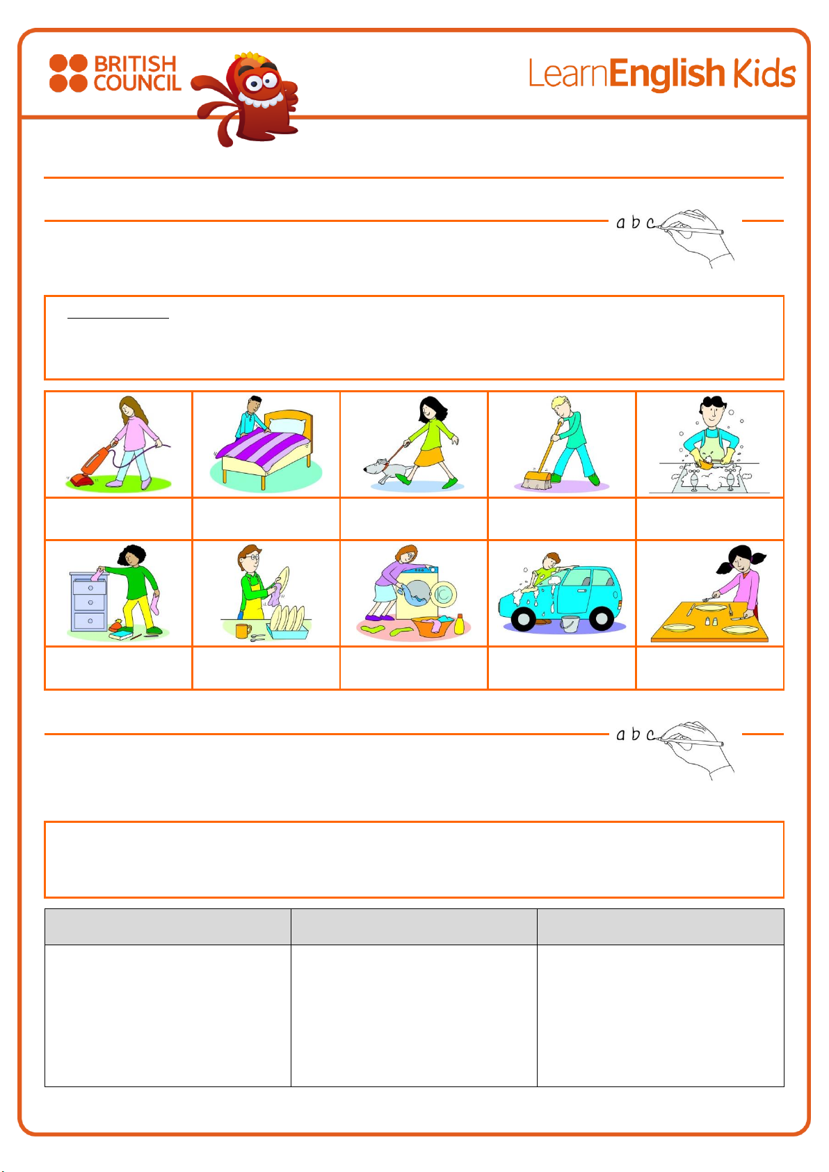 ` www.britishcouncil.org/learnenglishkids © British Council, 2016 The United Kingdom’s international organisation for educational opportunities and cultural relations. We are registered in England as a charity. Doing chores 1. What’s the word? Write the word under the pictures. make the bed do the washing sweep the floor tidy up walk the dog wash the car do the vacuuming lay the table do the washing up dry the dishes make the bed 2. Where does it go? Write the chores in the correct box to show what you like and don’t like doing. If you don’t have to do a chore, cross it out. If you do other chores, write them. making the bed doing the washing sweeping the floor tidying up walking the dog washing the car doing the vacuuming laying the table doing the washing up drying the dishes I like ... I don’t mind ... I hate ... ` www.britishcouncil.org/learnenglishkids © British Council, 2016 The United Kingdom’s international organisation for educational opportunities and cultural relations. We are registered in England as a charity. 3. Write about it! When do you have to do your chores? Write what you have to do on each day! Monday: I have to ............................................................................................................................ Tuesday: ............................................................................................................................................ Wednesday: ....................................................................................................................................... Thursday: ........................................................................................................................................... Friday: ................................................................................................................................................ Saturday: ........................................................................................................................................... Sunday: ............................................................................................................................................. 4. Ask your friends! What chores do you and your friends have to do? Write four more questions. Then ask your friends. If they say yes, put a tick next to the question. How many ticks have you got for each chore? Write the chore, count the ticks and colour that many squares in the line! Do you have to make the bed ? _____________________________________? _____________________________________? _____________________________________? _____________________________________? make the bed: ____________________: ____________________: ____________________: ____________________: