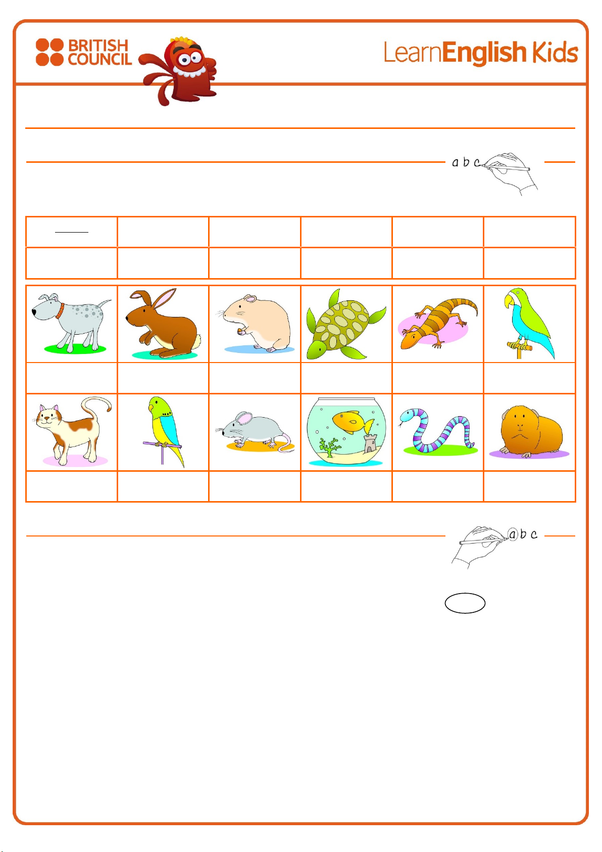 www.britishcouncil.org/learnenglishkids © British Council, 2016 The United Kingdom’s international organisation for educational opportunities and cultural relations. We are registered in England as a charity. Looking after pets 1. What’s the word? Write the word under the pictures. rabbit cat dog mouse budgie parrot hamster guinea pig lizard snake turtle fish rabbit 2. True or false? Circle true or false for these sentences. a. The first domestic cats lived 8,000 years ago. true false b. Dogs are the newest domestic animal. true false c. Hamsters come from Syria. true false d. Goldfish were first kept as pets in Egypt. true false e. Rabbits can have up to 40 babies at one time. true false f. Some parrots can live for more than 100 years. true false g. Cats were very important to the Ancient Egyptians. true false www.britishcouncil.org/learnenglishkids © British Council, 2016 The United Kingdom’s international organisation for educational opportunities and cultural relations. We are registered in England as a charity. 3. Match them up! Match the pets and how to take care of them. fish This pet is a good friend. Microchip and vaccinate it when you get it and also put a collar on it. Take it for long walks twice a day. It needs a bed to sleep on and some toys to play with. You should feed it a good diet of meat and special biscuits. It needs lots of water to drink. dog This pet needs a warm home like its natural habitat. It should live in a large tank with special lights. It needs rocks and plants to climb on. You should feed it insects, spiders, mice or rats. Give it water to drink and also water to have a bath in. cat This pet needs a large tank of water called an aquarium to swim around in. Put some plants and rocks in the tank to make it more interesting. You need to change the water and clean the tank every 3 or 4 weeks. Feed your pet special food once a day. lizard This pet needs a big cage and a wooden perch to sleep on. Clean the cage once a week. Put some toys and a bell in its cage. Let your pet fly outside the cage regularly – but don’t forget to close the windows! Feed your pet seeds and give it water to drink. parrot This pet needs a cage where it can run around. It needs a quiet place and a box to sleep in during the day. Put a wheel in the cage for it to exercise in at night. Feed it seeds, nuts, fruit and vegetables and give it water to drink. hamster This pet is very friendly. Microchip and vaccinate it when you get it. It sleeps a lot so it needs somewhere quiet and warm. You should play with your pet every day with special toys. It likes fish and milk, but you should feed it special meaty food or special biscuits, with water to drink.