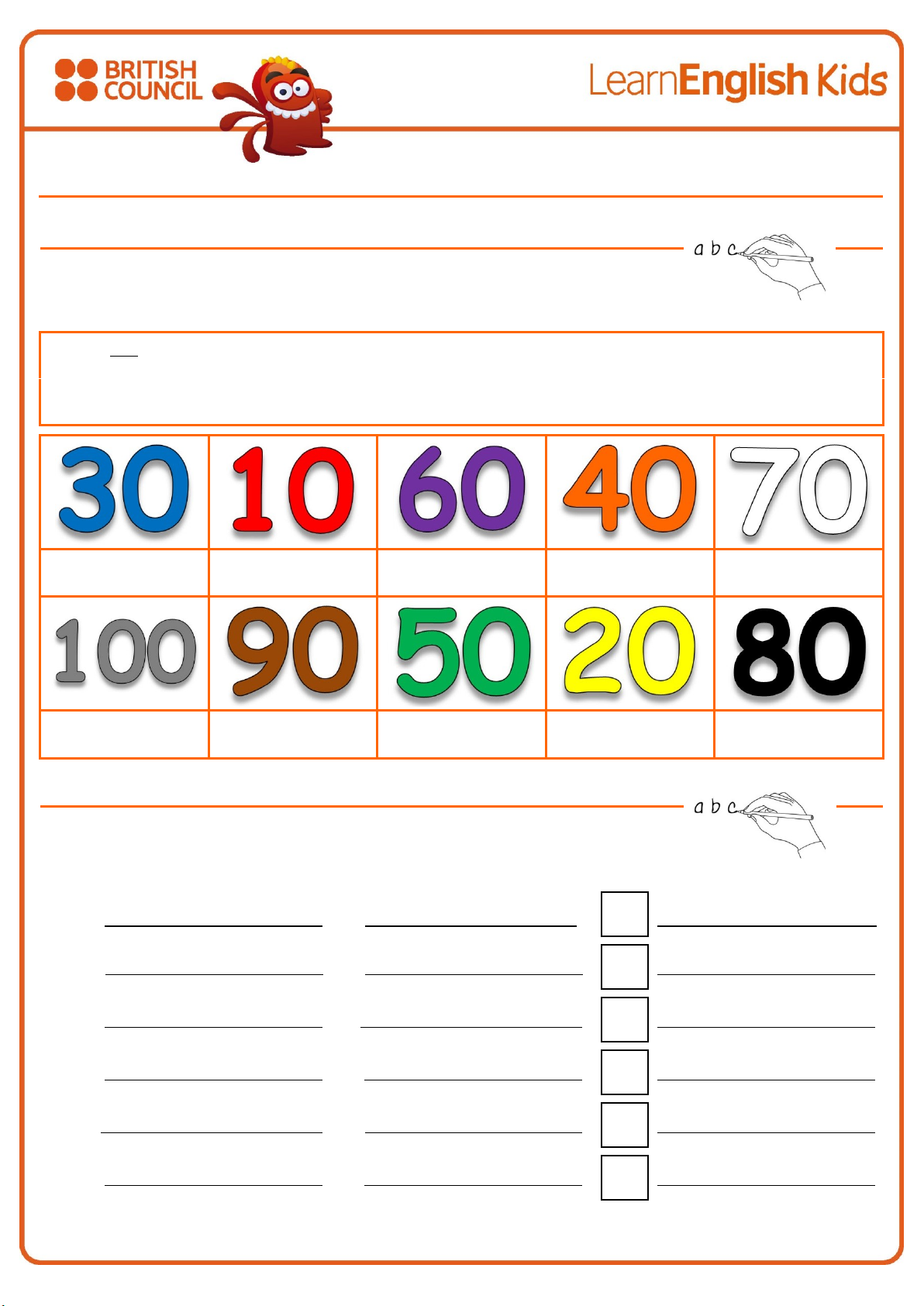 www.britishcouncil.org/learnenglishkids © British Council, 2016 The United Kingdom’s international organisation for educational opportunities and cultural relations. We are registered in England as a charity. Numbers 10–100 1. What’s the number? Write the number under the pictures. ten twenty thirty forty fifty sixty seventy eighty ninety a hundred ten 2. Add them up! Write the numbers and add them up! a. 20 twenty + 30 thirty = fifty b. 30 + 50 = c. 60 + 10 = d. 20 + 40 = e. 10 + 80 = f. 40 + 60 = 50