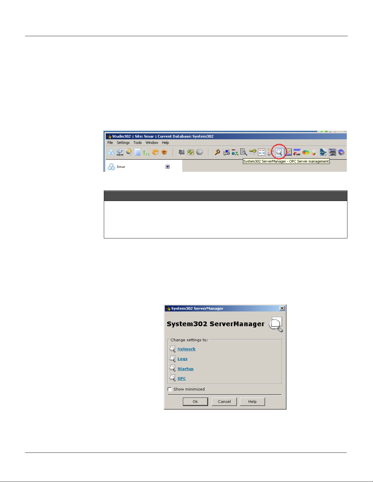 Apêndice A A.1 SYSTEM302 SERVERMANAGER O System302 ServerManager é o aplicativo que configura os parâmetros da rede de comunicação da planta. Os parâmetros podem ser configurados antes de se iniciar a comunicação on-line, sendo que alguns parâmetros podem ser modificados quando o sistema já está em operação. O System302 ServerManager pode ser executado a partir da barra de ferramentas de aplicativos do Studio302. Note também que o System302 ServerManager pode ser configurado para ser executado automaticamente toda vez que um servidor OPC seja acessado. Figura A.1. Iniciando o System302 ServerManager IMPORTANTE Os parâmetros disponíveis a partir do System302 ServerManager pertencem aos arquivos SmarOleServer.ini, IDShell HSE.ini e SnmpOpcServer.ini. Alterações feitas diretamente nesses arquivos, de outros parâmetros que não os que estão acessíveis através do System302 ServerManager, sem prévio conhecimento ou orientação técnica, podem levar a um mau funcionamento do sistema. As seções abaixo descrevem a interface do System302 ServerManager e as características principais deste aplicativo. Interface com o Usuário Clique no botão do System302 ServerManager na barra de ferramentas do Studio302 e a seguinte caixa de diálogo aparecerá: Figura A.2. Iniciando o System302 ServerManager Selecione uma das opções na caixa de diálogo de acordo com a tela de configuração do System302 ServerManager que se deseja editar: Studio302 - Manual do Usuário A.2 • Network: configura os cartões de interfaces de rede que serão usados pelo System302 ServerManager, e disponibiliza opções para redundância, parâmetros avançados para a rede HSE, parâmetros específicos do servidor SNTP e parâmetros para o caso de um sistema composto de RTUs. • Logs: configura as opções para habilitar ou desabilitar o registro de eventos. • Startup: configura o System302 ServerManager para ativar os servidores OPC automaticamente quando o sistema operacional é iniciado. Também disponibiliza uma opção para carregar a lista de tags e assim criar um sistema de cache com o servidor DA (DFI ou HSE). • OPC: configura parâmetros específicos dos servidores OPC da Smar para Alarmes e Eventos, SNMP e HDA. Acesso ao wrapper do padrão OPC UA; Enquanto está sendo executado, o System302 ServerManager avisa o usuário sobre eventos relacionados aos componentes do sistema, através do seu ícone na barra de tarefas do Windows. São quatro os possíveis eventos relacionados à sinalização do ícone do System302 ServerManager: • Erro na configuração do COM/DCOM; • Evento gerado por algum aplicativo, através do arquivo de registro de eventos *.sml; • A base de dados do Servidor OPC de Alarme e Eventos precisa ser atualizada; • Um novo arquivo de dump (a partir de uma exceção fatal de um dos componentes relacionados aos servidores OPC) foi gerado pelo sistema (veja a seção Visualização de Mensagens para mais detalhes). Veja o exemplo da figura abaixo: Figura A.3. Sinalização de Evento no System302 ServerManager Quando um servidor OPC está ativo, o ícone do System302 ServerManager muda para a cor verde ( ) na barra de tarefas do Windows. Se o servidor não estiver ativo, o ícone do System302 ServerManager mudará para a cor vermelha ( ) na barra de tarefas do Windows. A figura seguinte mostra a interface do System302 ServerManager: Apêndice A: System302 ServerManager A.3 Figura A.4. Janela do System302 ServerManager O painel à esquerda mostra as opções de configuração do System302 ServerManager e os relatórios gerados durante a execução dos servidores de comunicação. O painel à direita mostrará os parâmetros relacionados à opção de configuração selecionada no menu à esquerda. Note que ao passar o ponteiro do mouse sobre cada parâmetro disponível, um pequeno texto de ajuda ou a descrição (tooltip) do parâmetro serão mostrados. No painel na parte inferior da janela do System302 ServerManager são mostradas informações relacionadas às bases de dados dos Servidores OPC DFI e HSE, indicando quais servidores estão no estado não válido ou ativo, e o número total de servidores. Neste painel também são mostrados os servidores OPC que estão sendo executados no momento. Figura A.5. Detalhe da Janela dos Servidores OPC Depois de editar os parâmetros de configuração, clique Apply All para confirmar as alterações e feche o System302 ServerManager. Dependendo do parâmetro que foi configurado, poderá ser necessário reiniciar o System302 ServerManager para que as alterações sejam aplicadas. Studio302 - Manual do Usuário A.4 Para fechar o System302 ServerManager e finalizar sua execução, selecione o menu Application e clique na opção Exit, ou clique com o botão direito no ícone do System302 ServerManager na barra de tarefas e clique Exit. O botão de fechar na janela do System302 ServerManager apenas minimiza a janela do aplicativo. Figura A.6. Finalizando a Execução do System302 ServerManager O System302 ServerManager só será finalizado se não houver nenhum servidor OPC sendo executado. Se mesmo depois de fechar todos os clientes OPC ainda existirem servidores OPC sendo executados, pode ser que o próprio System302 ServerManager seja considerado como um cliente OPC. Para desconectar o System302 ServerManager como cliente OPC, selecione o menu Application e clique na opção Disconnect OPC Servers. Ou, ainda, utilize os botões da barra OPC para desconectar um servidor OPC. Quando o botão referente ao servidor está selecionado na barra OPC, isto indica que o servidor está conectado a partir do System302 ServerManager. Veja a seção Configurações de Início para mais detalhes. Figura A.7. Barra de Ferramentas OPC IMPORTANTE Ao encerrar a execução do aplicativo System302 ServerManager, aguarde alguns segundos antes de executá-lo novamente, para que haja tempo suficiente para a lista de processos do Windows ser atualizada
