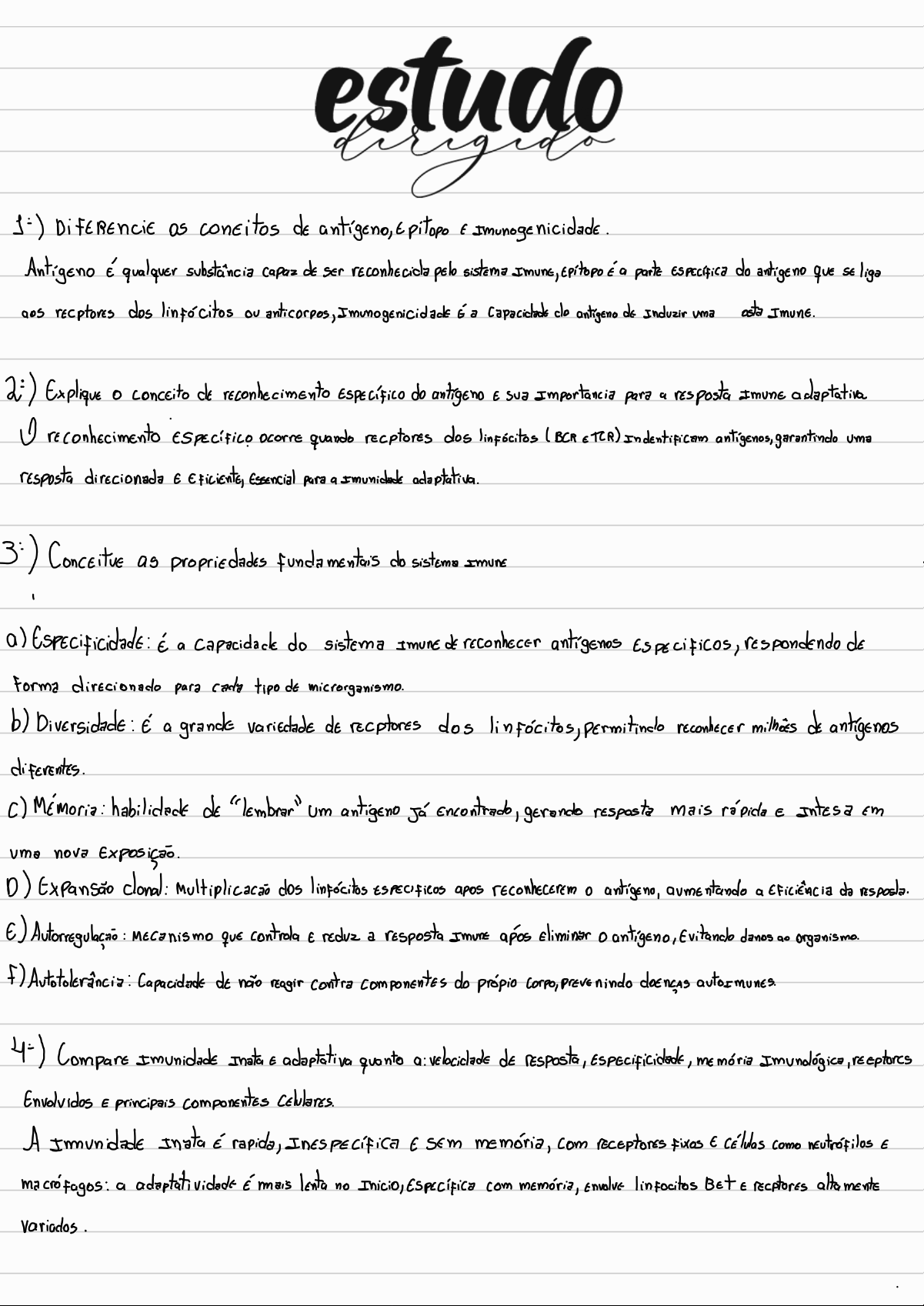 estudo as de antigeno, E pitopo E Antigeno qualquer de reconhecida pelo sistema parte do antigeno que SE liga aos recptores dos linfócitos ou anticorpos, Immogenicidade a do antigeno de Induzir uma osta Explique conceito de reconhecimento do antigeno E sua Importancia para a resposta Imune adaptativa I reconhecimento ocorre quando recptores dos linfócitos (BCR E TCR) Indentificam antigenos, garantindo resposta direcionada E Essencial para a adaptativa. Conceitue as propriedades fundamentais do sistema Imune a) Especificidade: É a do sistema IMUNE reconhecer antigenos Especificos, respondendo de Forma direcionado para cady tipo de microrganismo. b) Diversidade: É a grande variedade de recptores dos linfócitos, reconhecer milhões de antigenos diferentes. C) habilidade de "lembrar" Um antigeno Já resposta mais rápida E Intesa nova Exposição. D) Expansão clonal: dos linfócitos ESPECIFICOS apos reconhecerem 0 antigeno, aumentando a da E) Autorregulação Mecanismo que controla E reduz a resposta Imune Eliminar antigeno, danos organismo. Capacidade de não reagir contra componentes do própio doenças autormunes. Compare Imunidade Inata E adaptativa quanto a:velociclade de resposta, Imunológico, Envolvidos E principais componentes A Immunidade Inata É rapida, E SEM receptores E Como E a adaptatividade É mais lenta no Inicio, Específica com Envolve linfocitos E recptores alta menteDiscuta a Imunidade Inata Influencia a ativação da Imunidade adaptativa. A Imunidade Inata a ativa adaptativa por da de antigenos dendriticas) E liberação de citocinas que Estimulam linfócitos. a linhagem mieloide E linhagem linfoide, Suas principais celulas. A linhagem mieloide origina basófilos, E a linfoide origina linfócitos B,Tc NK. 7-) Compare as de macrófagos E células dendriticas na defsa contra atvam na fagecitose rápida, macrófagos fagocitam E apresentam antigenos, células dendriticas as principais apresentadoras de E ativadoras de linfócitos 8-) Compare estrutura E dos linfoide primário E secundário orgãos linfoides primarios (medula são locais de maturação dos baço, tecidos linfoides) Sao locais de E resposta Explique papel das cilocinas quimiocinas na células do Citocinas São proteinas que regulam a resposta quimiocinas atraem células para locais de Comunicação E coordenação Entre células. Diferencie Imunidade Inata celular quanto 005 mecanismos E patógenos combatidos. Imunidade humoral linfócitos B E contra patógenos Imunidade celular linfócitos T, atuando contra patógenos Descreva as da resposta Imune contra microorganismos Primeiro ocorre reconhecimento do antigeno, seguido da ativação dos linfócitos, depois a Eliminação do pelos Em da resposta) por a Formação de de memória respostas Futuras mais rápidasQuestões Contextualizadas a função do sistema complementos? A do sistema complemento É defesa do organismo contra microorganismos, promovendo a a fagocitose) a lise celular por da do complexo de ataque á membrana (MAC) a ativação da resposta Inflamatoria, além auxiliar na de complexos Imunes 2:) Diferencie as vias clássica, MBL E alternativa, quanto ativação. A via classica É ativada pela ligação de anticorpos (IgG ou IgM) ao antigeno, Iniciando a cascata do complemento, a via das (MBL) a atividade pela da lectina ligadora de manose E carboidratos presentes na Superfície dos patogenos, Ja a via alternativa É diretamente na superficie do microrganismo, de forma Independente de anticorpo, Por da C3 3) Um apresenta defeitos genéticos na das da (3 convertase na alternativa E clássica, quale a consequencia patológica condição Imune? Defeitos genéticos na da C3 convertase comprometem a do sistema Complemento, reduzindo a opsonização, a E a lise de Como consequencia, paciente apresenta maior a recorrentes, por bactérias, além de acúmulo de complexos Imunes E mento de a relacão do sistema com a reacão de Está á pois SEUS fragmentos Como E como mediadores promovendo permeabilidade Vascular recrutamento de Inflamatórias (como para local da a as que É Quais fragmentos do sistema complemento realizam Evento? E qual a sua na resposta do sistema Imune Inato? A opsonização proesso qual microorganismos são revestidos por uma moleculas que No sistema comple to (principa) E tambem ic3b. Eles SE ligam do E reconhecidos por recptores nos aumentanclo a da resposta Imune Inata promover a rapida Eliminação dos agentesEstudo dirigido 1:) Qual conceito de Imunidade aclaptativa E quais São Suas Principais A adaptativa É a clefesa do organismo contra antigenos caracterizada por alta Especificidade, memória Imunológica E capacidade do diferenciar própio donão próprio, sendo medida cipalmente por Por que a Imunidade adaptativa apresenta maior contra Ela apresenta maior porque SEUS receptores reconhecem antígenos de altamente direcionodas contra cada patógeno. 3) Quais as principais células Envolvidas na Imunidade adaptativa E Suas As Principais linfócitos B, que produzem anticorpos, E linfócitos auxiliares E citotóxicos), que coordenam E a resposta celular. 4) a Entre linfócitos T E Us atvam auxiliando E coordenando a resposta Imune por da liberação de citocinas, Enquanto os TCD8+ atvam diretamente destruindo células Como linfócitos avxiliares contribuem para a da resposta Us liberando citocinas que ativam outras células do sistema linfócitos B, E linfócitos organizando a DE que forma tcitotoxicos, Eliminam células Infectadas? Us linfócitos t citotoxicos Eliminam celulas Infectadas por meio da de perforinas E granzimas, que Induzem a morte Qual a funcão do complexo principal de histocompatibilidade (MHC) na resposta adaptativa?V Complexo principal de histocompatibilidade (MHC) tem a funcajo de apresentar fragmentos de antige hos as células T, reconhecimento do patógeno 8) Quais São para a ativação completa dos linfócitos T? I MHC classe I apresenta para linfócitos T CD8+ E presente Em quase todas as célula