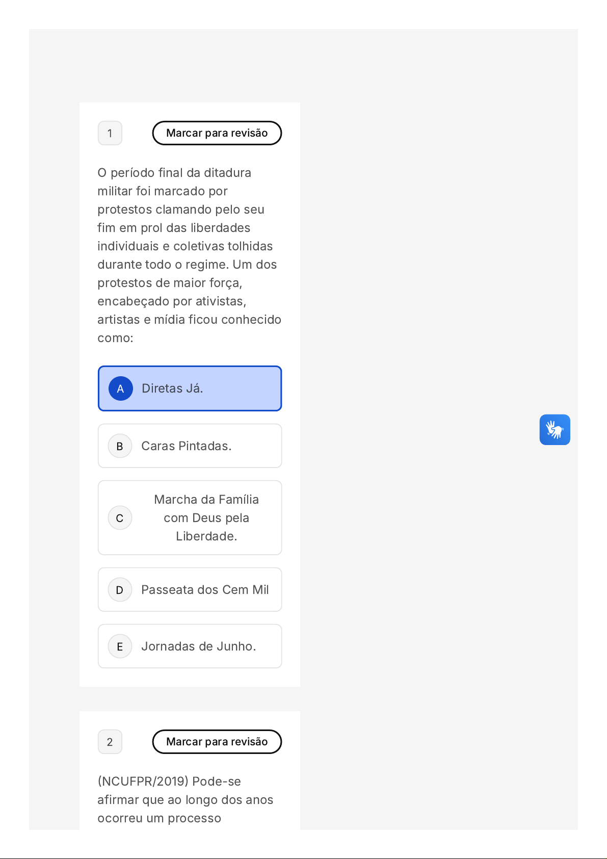 A B C D E 1 Marcar para revisão O período final da ditadura militar foi marcado por protestos clamando pelo seu fim em prol das liberdades individuais e coletivas tolhidas durante todo o regime. Um dos protestos de maior força, encabeçado por ativistas, artistas e mídia ficou conhecido como: Diretas Já. Caras Pintadas. Marcha da Família com Deus pela Liberdade. Passeata dos Cem Mil Jornadas de Junho. 2 Marcar para revisão (NCUFPR/2019) Pode-se afirmar que ao longo dos anos ocorreu um processo A B C D E expansivo de proteção dos direitos dos homens, as chamadas gerações ou dimensões de direitos fundamentais. Nesse sentido, é considerado um direito fundamental de primeira geração: o meio ambiente saudável. a liberdade. a solidariedade. a saúde. a convivência harmoniosa entre os povos. 3 Marcar para revisão A Declaração de Direitos do Homem e do Cidadão escrita na França é considerada uma das principais declarações de direitos do período contemporâneo. É correto afirmar que: A B C Foi produzida em cima da Declaração de Independência americana e possui muitas características em comum, mudando somente a grafia do texto. Essa declaração teve como principal objetivo apontar a violação de direitos cometidos pela Inglaterra e justificar o início de uma guerra contra os ingleses; Ela foi resultado de uma reunião consultiva do rei com a participação da população, que identificou e resolveu os principais problemas vividos pelos franceses; D E Ela foi escrita durante um período revolucionário da França e tinha como objetivo defender direitos naturais do homem; Ela foi resultado da luta da Igreja pelo reconhecimento do direito à dignidade humana. 4 Marcar para revisão Em seus trabalhos a respeito dos Direitos Humanos a filósofa Hannah Arendt deu especial atenção à situação de um grupo de indivíduos que perdem tudo, inclusive sua nacionalidade. Sobre os apátridas, é correto afirmar que: A B C D E São os que mais precisam de atenção, pois estão sem a proteção do Estado e, por isso, não conseguem acessar seus direitos; São considerados os culpados pelos conflitos europeus, pois a crise migratória causada por eles deu origem às duas guerras mundiais; Eles possuem uma situação legal confortável, pois ao sair de seus países são assistidos pelas Nações Unidas e têm seus direitos garantidos; Eles perderam seus direitos políticos depois de organizarem golpes de Estados ou conspirarem contra as leis dos seus países; São os defensores do fim das fronteiras nacionais e da criação de uma aldeia efetivamente global; A B C 5 Marcar para revisão Sueli Carneiro, em sua obra "Escritos de uma Vida" abordas a violência sexual dos senhores brancos sobre negras e indígenas e o papel dessa violência na formação da sociedade brasileira. Sobre o tema, assinale a alternativa correta. CARNEIRO, A. S. Escritos de uma vida. São Paulo: Pólen Livros, 2018. O estupro colonial não teve influência na construção das identidades brasileiras. A construção das identidades brasileiras não está relacionada com o estupro colonial. O estupro colonial influenciou apenas a construção das identidades de gênero no Brasil. D E O estupro colonial perpetuado pelos senhores brancos portugueses contribuiu para as hierarquias de gênero e raça existentes na sociedade brasileira. O estupro colonial foi uma prática comum entre as diferentes camadas sociais no Brasil. 6 Marcar para revisão (CESPE-CEBRASPE/2022) O estudo dos princípios que regem a interpretação constitucional, em especial os da razoabilidade e da proporcionalidade, estabelece que as normas da Constituição Federal de 1988 devem ser analisadas e aplicadas de modo a permitir que os meios utilizados estejam adequados aos fins pretendidos, devendo o intérprete buscar conceder aos bens jurídicos tutelados uma aplicação justa. Considerando isso, assinale a opção correta. 00 hora : 39 min : 13 seg Ocultar Questão 10 de 10 Respondidas (10) Em branco (0) Finalizar prova 1 2 3 4 5 6 7 8 9 10 Prova AV Educacao e Direitos Humanos A B Com base nos princípios que dão sustentação a uma interpretação sistemática do texto constitucional, é correto afirmar que os direitos e garantias constitucionais devem ser considerados absolutos, sendo possível invocar a norma de maneira irrestrita, em razão do que dispõe a dignidade da pessoa humana, um dos fundamentos da República Federativa do Brasil. O princípio da harmonização tem por objetivo promover a harmonia entre os Poderes Legislativo, Executivo e Judiciário. Apesar dos Poderes serem independentes, a harmonia entre eles é de fundamental importância para que o Estado brasileiro realize seus objetivos, na forma do que estabelece o art. 3.º da Constituição Federal de 1988. C D Em razão do que preceitua o princípio da concordância prática, pode-se dizer que, na ocorrência de conflito entre bens jurídicos garantidos por normas constitucionais, o intérprete deve priorizar a decisão que melhor os harmonize, de forma a conceder a cada um dos direitos a maior amplitude possível, sem que um deles acabe por impor a supressão do outro. O princípio da harmonização permite afirmar que, em razão dos axiomas que fundamentam a República Federativa do Brasil, o intérprete da Constituição deverá sempre observar a supremacia do interesse público, evidenciado, nesse caso específico, o caráter absoluto dos direitos e garantias fundamentais. E Em se tratando de conflito entre a liberdade de expressão na atividade de comunicação e a inviolabilidade da intimidade da vida privada, da honra e da imagem das pessoas, como quando um jornal impresso publica notícias que são de interesse público, mas que acabam por invadir a esfera privada de alguém, o intérprete do texto constitucional deverá sempre optar pelo interesse público, descartando o interesse privado. 7 Marcar para revisão A partir da Declaração Universal dos Dir