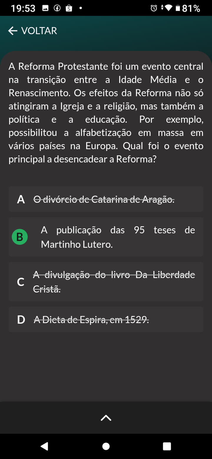 19:53 f 81% VOLTAR A Reforma Protestante foi um evento central na transição entre a Idade Média e o Renascimento. Os efeitos da Reforma não só atingiram a Igreja e a religião, mas também a política e a educação. Por exemplo, possibilitou a alfabetização em massa em vários países na Europa. Qual foi o evento principal a desencadear a Reforma? divórcio de Catarina de Aragão. A publicação das 95 teses de B Martinho Lutero. A divulgação do livro Da Liberdade c Cristã. D A de Espira, cm 1529.