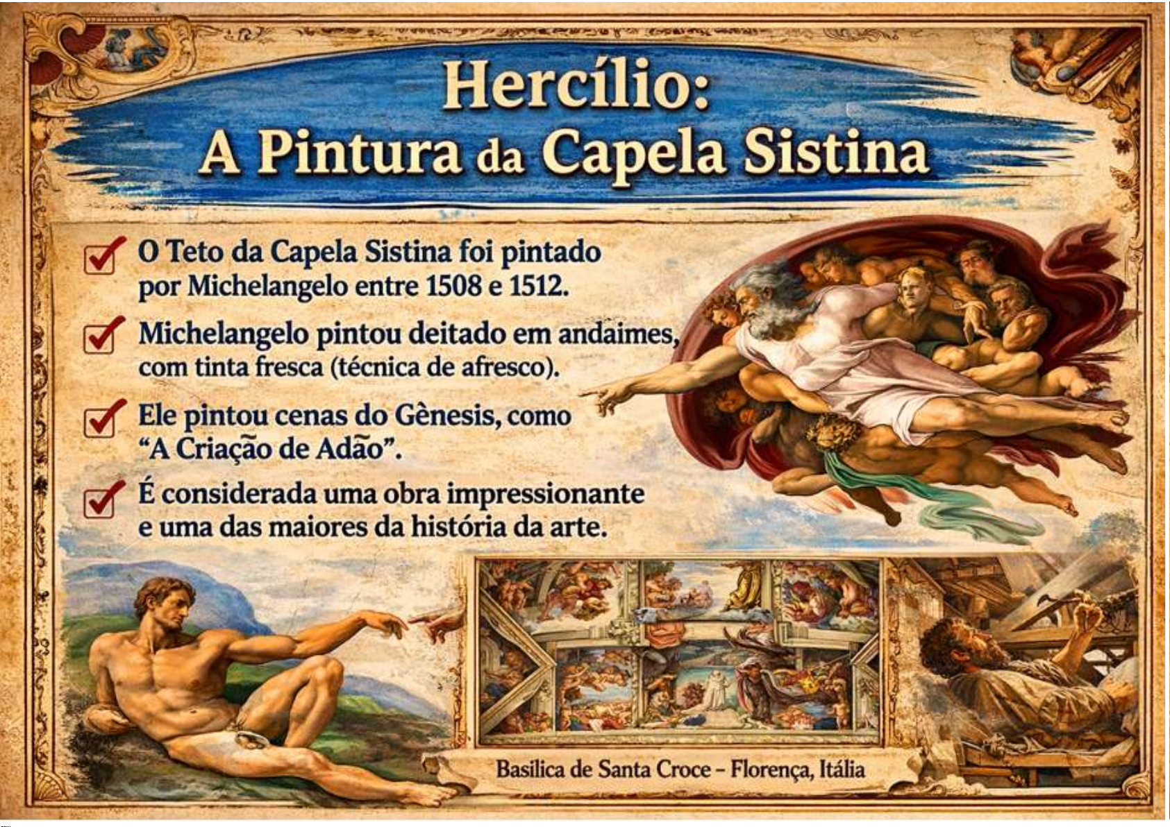 Hercílio: A Pintura da Capela Sistina Teto da Capela Sistina foi pintado por Michelangelo entre 1508 e 1512. Michelangelo pintou deitado em andaimes, com tinta fresca (técnica de afresco). Ele pintou cenas do Gènesis, como "A Criação de Adão". É considerada uma obra impressionante e uma das maiores da história da arte. Basilica de Santa Croce - Florença, Itália