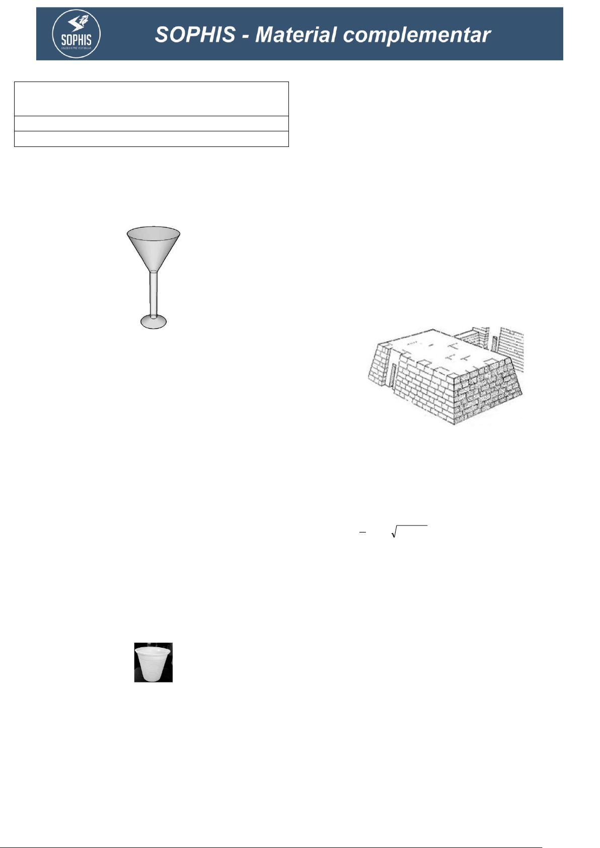 01) A figura apresenta um esboço de uma taça confeccionada apenas com formas geométricas espaciais regulares. Quais formas espaciais regulares estão presentes no cálice? a) Cilindro e cone. b) Cone, cubo e pirâmide. c) Tronco de cone e cilindro. d) Cilindro, paralelepípedo e pirâmide. e) Tronco de pirâmide e paralelepípedo. 02) Copos Plásticos Descartáveis [...] O copo plástico descartável é um produto muito consumido pela população devido à sua praticidade e ao seu baixo custo para o consumidor. É muito utilizado em escritórios, festas infantis e eventos diversos, tendo ainda a vantagem de ser um produto que não provoca acidentes, como os copos de vidro. [...] Disponível em: . Acesso em: 25 out. 2015. A superfície lateral de um copo descartável como o da figura tem a forma da superfície lateral de um a) tronco de cone. b) paralelepípedo. c) cilindro. d) prisma. e) cubo. 03) Uma mastaba é um túmulo egípcio, uma capela, com a forma de um tronco de pirâmide (paredes inclinadas em direção a um topo plano de menores dimensões que a base). Por todo o Egito existem milhares de mastabas com uma grande variedade de pinturas murais, algumas com valor artístico inestimável. Essas imagens retratam, geralmente, atividades do cotidiano no antigo Egito. Desse modo, esses monumentos funerários revelam-se uma fonte importantíssima de informação sobre esse período da história da humanidade, no que diz respeito à vida das classes mais modestas (ainda que fossem túmulos de luxo de personalidades eminentes). As pinturas que ornamentam as mastabas contrastam com as das pirâmides que representam, essencialmente, a vida na corte e as atividades no palácio do faraó. Disponivel em: http://pt.wikipedia.org/wiki/Mastaba Fonte: http://pyramidengeheimnisse.de/index.php?top=pyr_e&page=bare Suponha que uma mastaba tenha como bases dois quadrados de lados 30 m e 40 m, respectivamente. Marque a alternativa que representa a altura da mastaba, considerando seu volume igual a 18.500 m3. Utilize: ( )bbBB AAAA 3 h V ++= a) 5 m b) 10 m c) 15 m d) 20 m e) 30 m LISTA DE EXERCÍCIOS – GEOMETRIA ESPACIAL, TRONCOS de PIRÂMIDES e CONES Disciplina: Matemática Professor: Augusto 04) Um recipiente cônico foi projetado de acordo com o desenho ao lado, no qual o tronco do cone foi obtido de um cone de altura igual a 18cm. O volume desse recipiente, em cm3 , é igual a: a) 216 b) 208 c) 224 d) 200 05) O cone e o cilindro da figura têm base comum, de raio 2. A altura do cilindro é 2 e a do cone é 4. O volume do tronco de cone que corresponde à interseção entre os dois é igual a: a) 14 /3; b) 2 /3; c) 8 ; d) 8 /3; e) 16 /3. 06) Populariza-se, na região da seca no nordeste do Brasil, a construção de cisternas que armazenam as águas das chuvas. Uma vez tratada, a água abastecerá as famílias que ali vivem. (Texto adaptado de Discutindo Geografia. Ano 1 nº 3. 2005) Considere os três recipientes a seguir que podem ser usados para carregar água das cisternas. O recipiente I tem a forma de um cilindro circular reto, de raio da base igual a L e altura igual a 2L. O recipiente II tem a forma de um tronco de cone com raio da base maior igual a 2L, raio da base menor igual a L e altura igual a L. O recipiente III tem a forma de um paralelepípedo de base quadrada de lado igual a L e altura igual a 2L Considerando VI, VII e VIII os volumes dos recipientes I, II e III, respectivamente, pode-se afirmar que: a) VI > VII > VIII b) VI > VIII > VII c) VII > VI > VIII d) VII > VIII > VI e) VIII > VI > VII 07) Na figura a seguir, AD mede 12 cm, BD mede 4 cm, BC mede 12 cm, o ângulo B mede 90º e DE é paralelo a BC. Ao rotacionarmos o trapézio BCED em torno do lado BD, produzimos um tronco de cone cujo volume é a) 144 cm3 b) 256 cm3 c) 324 cm3 d) 444 cm3 e) 768 cm3 08) Mulher recebe 1º transplante de pele fabricada com as próprias células Uma jovem com 70% do corpo queimado foi submetida com sucesso na Espanha ao primeiro transplante no mundo de pele humana fabricada com suas próprias células, uma técnica pioneira que combina engenharia de tecidos e nanoestruturas para dar mais elasticidade e permitir tratar a pele. [...] No transplante, a equipe utilizou duas lâminas de pele da jovem, de quatro centímetros quadrados cada, para fabricar 5,9 mil centímetros [quadrados] que, em duas intervenções, foram implantados em seu corpo. (Disponível em: http://g1.globo.com. Acesso em 13.05.19) Suponha que a mesma equipe esteja planejando um novo transplante de pele em um paciente que teve parte de sua perna queimada. Para estimar a área S de pele que deverá ser fabricada para o transplante, a parte atingida da perna do paciente foi equiparada a um tronco de cone circular reto com altura de 39,9 cm e diâmetros das bases medindo 12 cm e 18 cm, como indicado na figura. Na estimativa de S, tomou-se um valor 20% maior do que a área da superfície lateral desse tronco. Considerando = 3 e (39,9)2 = 1591, o valor estimado para S, em cm2, foi de a) 2,16 mil. b) 2,25 mil. c) 2,56 mil. d) 2,88 mil. e) 3,24 mil. 09) Em uma padaria são produzidos bombons em formato de tronco de cone, conforme a figura a seguir: Considerando R1 = 2 cm, R2 = 3 cm e H = 4 cm, qual o volume de cada bombom? a) 3 100 cm3. b) 3 52 cm3. c) 3 76 cm3. d) 3 65 cm3. e) 3 95 cm3. 10) Em uma comunidade no interior do estado do Ceará a prefeitura mandou construir uma caixa d’água para atender a demanda da comunidade local. A caixa d’água construída tem na sua parte inferior um tronco de cone reto cuja altura mede 1m, o raio da base menor mede 2 m e o raio da base maior mede 3 m. Na parte intermediária tem um cilindro circular reto com altura medindo 2 m e raio da base medindo 3 m, conforme ilustrado na figura abaixo. Quando o reservatório está cheio, a água ocupa todo o cone inferior e o cilindro da parte intermediária. Para abastecer a comunidade é suficiente encher o reservatório uma vez por dia. Considerando 3,