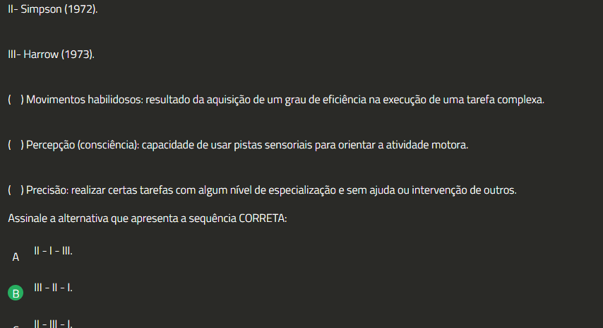 II- Simpson (1972). III- Harrow (1973). Movimentos habilidosos: resultado da aquisição de um grau de eficiência na execução de uma tarefa complexa. Percepção (consciência): capacidade de usar pistas sensoriais para orientar a atividade motora. Precisão: realizar certas tarefas com algum nível de especialização e sem ajuda ou intervenção de outros. Assinale a alternativa que apresenta a sequência CORRETA: II I III. A III I. III I.