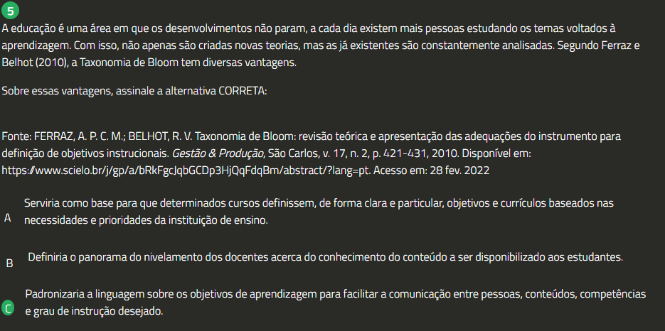 5 A educação é uma área em que desenvolvimentos não param, a cada dia existem mais pessoas estudando temas voltados à aprendizagem. Com isso, não apenas são criadas novas teorias, mas as já existentes são constantemente analisadas. Segundo Ferraz e Belhot (2010), a Taxonomia de Bloom tem diversas vantagens. Sobre essas vantagens, assinale a alternativa CORRETA: Fonte: FERRAZ, A. P.C. M.; BELHOT, R. V. Taxonomia de Bloom: revisão teórica e apresentação das adequações do instrumento para definição de objetivos instrucionais. Gestão & Produção, São Carlos, V. 17, n. 2, 421-431, 2010. Disponível em: em: 28 fev. 2022 Serviria como base para que determinados cursos definissem, de forma clara e particular, objetivos e currículos baseados nas A necessidades e prioridades da instituição de ensino. B Definiria panorama do nivelamento dos docentes acerca do conhecimento do conteúdo a ser disponibilizado aos estudantes. Padronizaria a linguagem sobre objetivos de aprendizagem para facilitar a comunicação entre pessoas, conteúdos, competências e grau de instrução desejado.