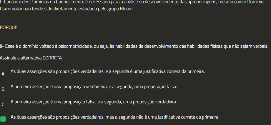 Cada um dos Dominios do Conhecimento para a analise do desenvolvimento das aprendizagens, mesmo com 0 Dominio Psicomotor não tendo sido diretamente estudado pelo grupo Bloom. PORQUE II- Esse é 0 domínio voltado à psicomotricidade, ou seja, às habilidades de desenvolvimento das habilidades físicas que não sejam verbais. Assinale a alternativa CORRETA: A As duas asserções são proposições verdadeiras, e a segunda é uma justificativa correta da primeira. B A primeira asserção é uma proposição verdadeira, e a segunda, uma proposição falsa. A primeira asserção é uma proposição falsa, e a segunda, uma proposição verdadeira. D As duas asserções são proposições verdadeiras, mas a segunda não é uma justificativa correta da primeira.