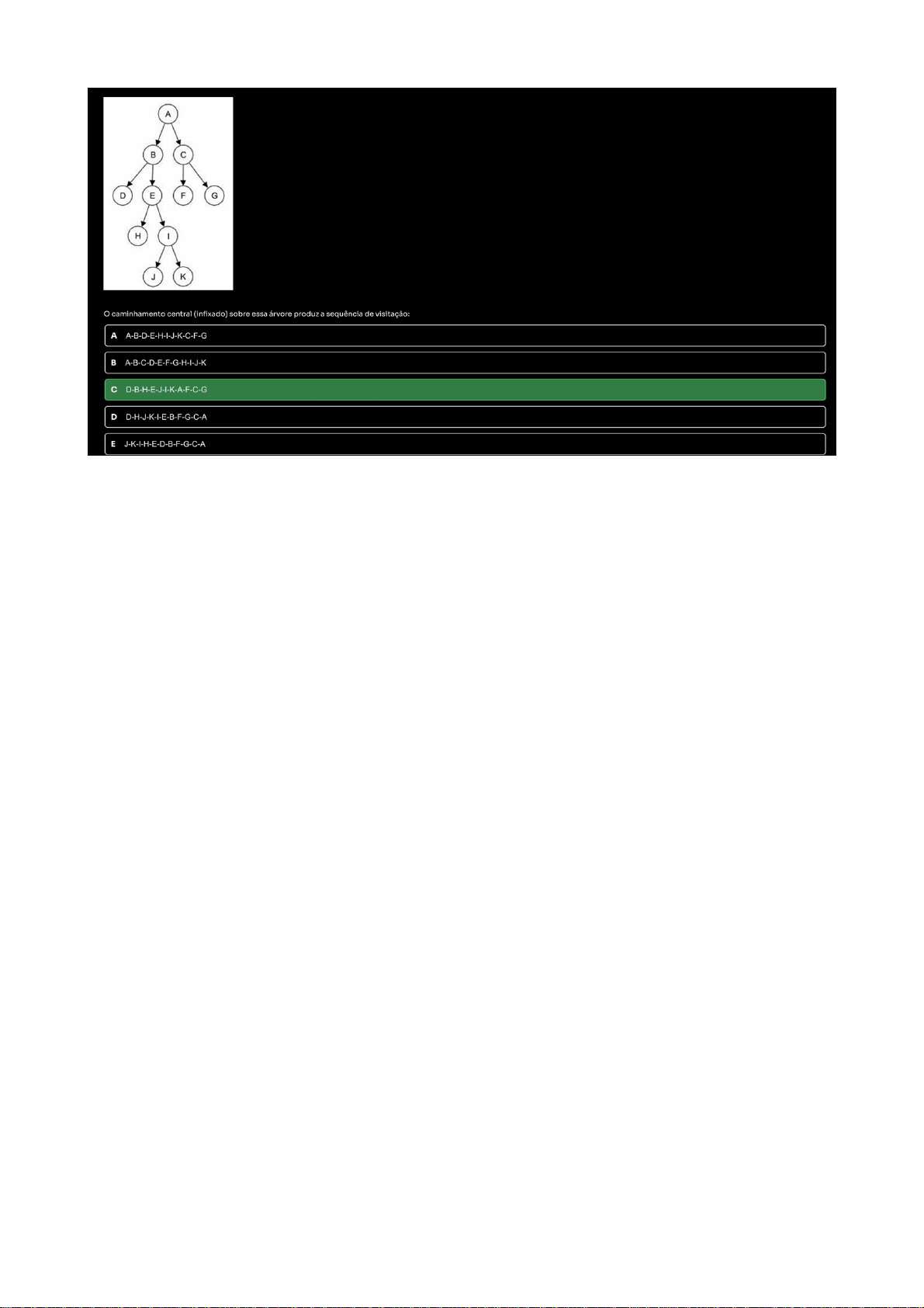 A C D E F G H J K caminhamento central (infixado) sobre essa árvore produz a sequência de visitação: A A-B-C-D-E-F-G-H-I-J-K D-B-H-E-J-I-K-A-F-C-G D D-H-J-K-I-E-B-F-G-C-A E