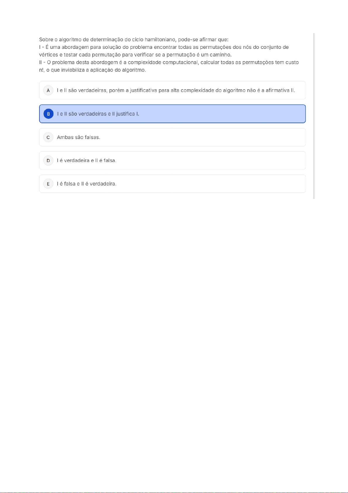 Sobre o algoritmo de determinação do ciclo hamiltoniano, pode-se afirmar que: É uma abordagem para solução do problema encontrar todas as permutações dos nós do conjunto de vértices e testar cada permutação para verificar se a permutação é um caminho. problema desta abordagem é a complexidade computacional, calcular todas as permutações tem custo n!, o que inviabiliza a aplicação do algoritmo. A le são verdadeiras, porém a justificativa para alta complexidade do algoritmo não é a afirmativa II. le são verdadeiras e justifica I. Ambas são falsas. D é verdadeira e é falsa. E I é falsa e é verdadeira.