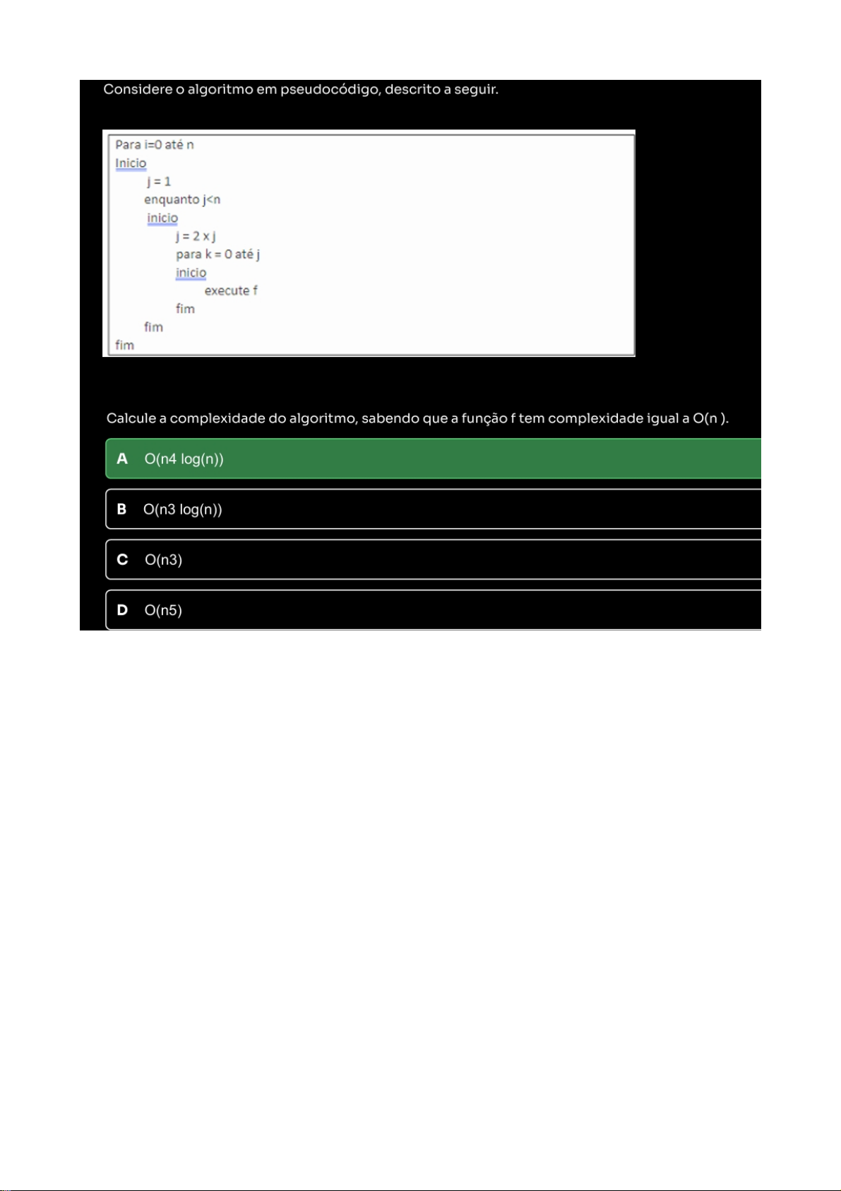 Considere algoritmo em pseudocódigo, descrito a seguir. Para i=0 até n Inicio j=1 enquanto j