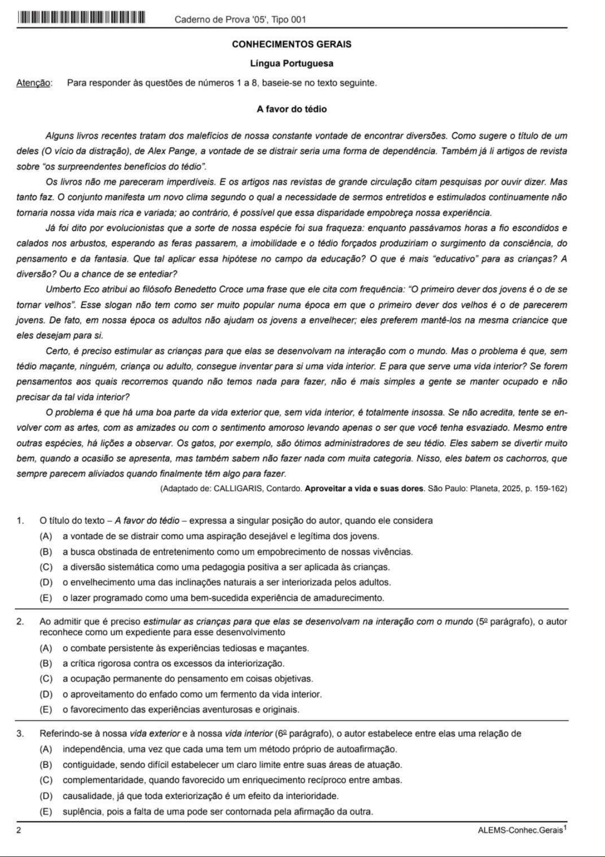 Caderno de Prova '05', Tipo 001 CONHECIMENTOS GERAIS Língua Portuguesa Atenção: Para responder às questões de números 1 a 8, baseie-se no texto seguinte. A favor do tédio Alguns livros recentes tratam dos malefícios de nossa constante vontade de encontrar diversões. Como sugere título de um deles (O vício da distração), de Alex Pange, a vontade de se distrair seria uma forma de dependência. Também já li artigos de revista sobre "os surpreendentes benefícios do Os livros não me pareceram imperdiveis. E artigos nas revistas de grande circulação citam pesquisas por ouvir dizer. Mas tanto faz. conjunto manifesta um novo clima segundo qual a necessidade de sermos entretidos e estimulados continuamente não tornaria nossa vida mais rica e variada; ao contrário, é possível que essa disparidade empobreça nossa experiência. Já foi dito por evolucionistas que a sorte de nossa espécie foi sua fraqueza: enquanto passávamos horas a fio escondidos e calados nos arbustos, esperando as feras passarem, a imobilidade e tédio forçados produziriam surgimento da consciência, do pensamento e da fantasia. Que tal aplicar essa hipótese no campo da educação? que é mais "educativo" para as crianças? A diversão? Ou a chance de se entediar? Umberto Eco atribui ao filósofo Benedetto Croce uma frase que ele cita com frequência: "O primeiro dever dos jovens é de se tornar velhos". Esse slogan não tem como ser muito popular numa época em que primeiro dever dos velhos é de parecerem jovens. De fato, em nossa época adultos não ajudam jovens a envelhecer; eles preferem mantê-los na mesma criancice que eles desejam para si. Certo, é preciso estimular as crianças para que elas se desenvolvam na interação com mundo. Mas problema é que, sem tédio maçante, ninguém, criança ou adulto, consegue inventar para si uma vida interior. E para que serve uma vida interior? Se forem pensamentos aos quais recorremos quando não temos nada para fazer, não é mais simples a gente se manter ocupado e não precisar da tal vida interior? problema é que há uma boa parte da vida exterior que, sem vida interior, é totalmente insossa. Se não acredita, tente se en- volver com as artes, com as amizades ou com sentimento amoroso levando apenas ser que você tenha esvaziado. Mesmo entre outras espécies, há lições a observar. Os gatos, por exemplo, são ótimos administradores de seu tédio. Eles sabem se divertir muito bem, quando a ocasião se apresenta, mas também sabem não fazer nada com muita categoria. Nisso, eles batem cachorros, que sempre parecem aliviados quando finalmente têm algo para fazer. (Adaptado de: CALLIGARIS, Contardo. Aproveitar a vida e suas dores. São Paulo: Planeta, 2025, p. 159-162) 1. o título do texto A favor do tédio expressa a singular posição do autor, quando ele considera (A) a vontade de se distrair como uma aspiração desejável e legítima dos jovens. (B) a busca obstinada de entretenimento como um empobrecimento de nossas vivências. (C) a diversão sistemática como uma pedagogia positiva a ser aplicada às crianças. (D) envelhecimento uma das inclinações naturais a ser interiorizada pelos adultos. (E) lazer programado como uma bem-sucedida experiência de amadurecimento. 2. Ao admitir que é preciso estimular as crianças para que elas se desenvolvam na interação com mundo parágrafo), autor reconhece como um expediente para esse desenvolvimento (A) combate persistente às experiências tediosas e maçantes. (B) a crítica rigorosa contra os excessos da interiorização. (C) a ocupação permanente do pensamento em coisas objetivas. (D) aproveitamento do enfado como um fermento da vida interior. (E) favorecimento das experiências aventurosas e originais. 3. Referindo-se à nossa vida exterior e à nossa vida interior parágrafo), autor estabelece entre elas uma relação de (A) independência, uma que cada uma tem um método próprio de autoafirmação. (B) contiguidade, sendo difícil estabelecer um claro limite entre suas áreas de atuação. (C) complementaridade, quando favorecido um enriquecimento recíproco entre ambas. (D) causalidade, já que toda exteriorização é um efeito da interioridade. (E) suplência, pois a falta de uma pode ser contornada pela afirmação da outra. 2Caderno de Prova '05', Tipo 001 4. Se forem pensamentos aos quais recorremos quando não temos nada para fazer, não é mais simples a gente se manter ocu- pado e não precisar de tal vida interior? período acima manterá seu sentido básico e sua correção gramatical caso se substituam os dois elementos sublinhados, respectivamente, por: (A) dos quais nos valemos dispensar (B) pelos quais socorremos desfavorecer (C) em cujos incorremos relutar (D) a que nos pautamos excluir (E) aonde investimos impossibilitar 5. Considerando-se contexto, traduz-se adequadamente sentido de um segmento do texto em: (A) os surpreendentes benefícios do tédio (1º parágrafo) = os improcedentes ganhos da rotina. (B) citam pesquisas por ouvir dizer (2º parágrafo) = glosam estudos de valor irrelevante. (C) Que tal aplicar essa hipótese no campo da educação? (3º parágrafo) = É caso dessa inserção escolástica? (D) levando apenas ser que você tenha esvaziado parágrafo) = conduzindo assim seu vazio original. (E) há lições a observar parágrafo) = há casos instrutivos para se considerar. 6. As normas de concordância verbal estão plenamente observadas na frase: (A) Atribui-se a um filósofo frases que, parecendo incontestáveis, num contexto diferente acaba por ganhar uma acepção con- troversa. (B) Deriva das argumentações do autor a de que ao tédio cabem operações capazes de resgatar nossas experiên- cias profundas. (C) autor acredita que se reservou ao gato, mas não ao cachorro, propriedades que lhe permite extrair algum prazer dos momentos maçantes. (D) Não devem existir entre o prazer da diversão e momento do tédio uma polarização absoluta, a se