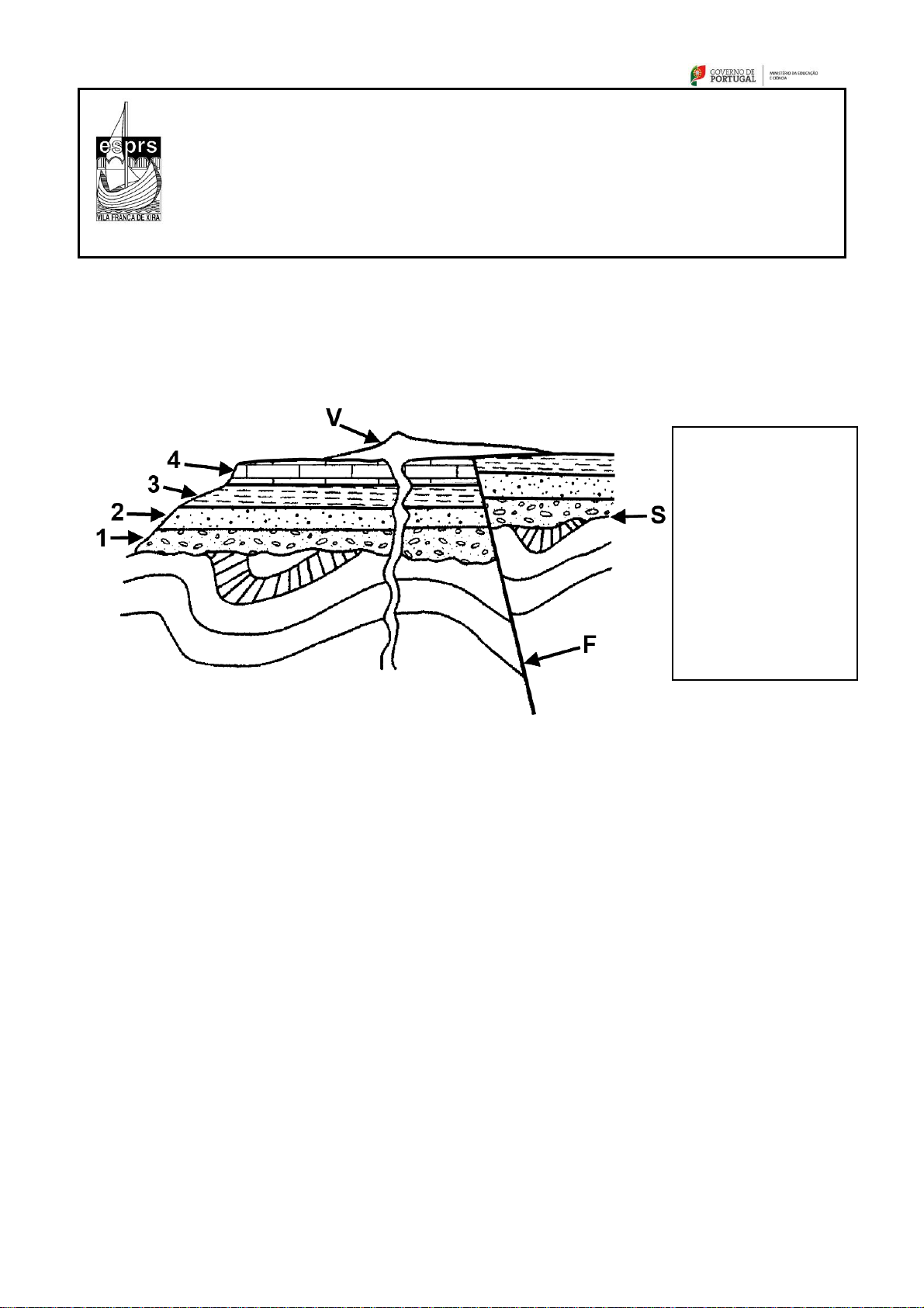 Prova Global de Biologia e Geologia– 10º Ano - Página 1 de 9 Agrupamento Professor Reynaldo dos Santos Ano Letivo 2012/2013 Prova Global de Biologia e Geologia 10º Ano Ensino Secundário Duração: 110 minutos Grupo I 1. O perfil geológico representado na figura 1, extraído de um artigo científico, permite identificar, segundo os seus autores, além de outros eventos, uma série sedimentar dobrada que contém restos de Trilobites e uma série sedimentar não dobrada com Amonites. Figura 1 1.1. De acordo com os dados podemos afirmar que a série sedimentar dobrada ser formou em ambiente ____________, durante a Era _____________. a) ….terrestre….Paleozoica b) ….terrestre….Cenozoica c) ….marinho….Paleozoica d) ….marinho….Cenozoica (Transcreva a opção que preenche correta e sequencialmente os espaços em falta) 1.2. Indique o tipo de forças estão na origem do acidente assinalado pelo F ? 1.3. Coloque por ordem cronológica, começando pelo mais antigo, os seguintes eventos geológicos representados na figura 1: Falha; Superfície de erosão; Depósitos Vulcânicos; Série sedimentar dobrada; Série sedimentar não dobrada; 1.4. As Amonites são consideradas fósseis de idade e são caracterizados por… a) existirem num espaço de tempo relativamente curto e com pequena distribuição geográfica. b) existirem num espaço de tempo relativamente curto e com grande distribuição geográfica. c) existirem num espaço de tempo relativamente longo e com grande distribuição geográfica. d) existirem num espaço de tempo relativamente longo e com pequena distribuição geográfica. (Transcreva a opção que preenche correta e sequencialmente os espaços em falta) Legenda 1 – Conglomerados 2 – Arenitos 3 – Argilas 4 – Calcários F – Falha S – Superfície de erosão V – Depósitos vulcânicos Prova Global de Biologia e Geologia– 10º Ano - Página 2 de 9 1.5. A análise radiométrica da rocha de um estrato localizado por baixo daquele que continha Trilobites, revelou a presença de 25% de U235 e 75% de Pb207. Considerando os dados da tabela ao lado que apresenta dados relativos a alguns isótopos usados em radiometria, calcule a idade absoluta da rocha analisada. Apresente os cálculos efetuados. 2. “Enquanto observavam o recém-descoberto 2003 UB313 a partir do Hawaii o mês passado, a equipa de astrónomos liderada por Michael Brown do Instituto de Tecnologia da Califórnia avistou um ténue objecto seguindo o maior. Dado que se movia, os astrónomos descobriram que era uma lua e não uma estrela de fundo, que deveria ser estacionária. A descoberta desta lua é importante pois pode ajudar os cientistas a determinar a massa do novo "planeta". Em Julho, Brown anunciou a descoberta de um corpo gelado e rochoso, maior que Plutão, na Cintura de Kuiper, um disco de objectos gelados para lá de Neptuno. Brown classificou 2003 UB313 de "planeta" e deu-lhe a alcunha de Xena, em homenagem à personagem principal da série televisiva "Xena: A Princesa Guerreira". A lua foi denominada Gabrielle, a sua fiel parceira nas aventuras. A União Astronómica Internacional, um grupo de cientistas responsáveis pela nomeação dos planetas, está decidindo os nomes formais para Xena e Gabrielle.” Noticia publicada em 4 de Outubro de 2005 no site “Astronomia Online” do Centro Ciência Viva do Algarve Nota: 2003 UB313 é hoje formalmente conhecido como o planeta-anão Eris 2.1. Segundo a Teoria Nebular Reformulada, os planetas do Sistema Solar formaram-se por … a) Rotação e acreção de gases e poeiras que giravam em torno do Sol b) Colisão de uma estrela com o Sol c) Matéria arrancada pela aproximação duma estrela ao sol d) Materiais emitidos a partir de uma grande explosão do Sol (Transcreva a opção correta) 2.2. O que distingue um planeta do chamado planeta-anão? a) O planeta-anão não têm satélites b) O planeta tem uma forma arredondada c) O planeta não tem asteroides na sua órbita d) O planeta tem um maior número de satélites naturais (Transcreva a opção correta) 2.3. Classifica de Verdadeiras (V) ou Falsas (F) as seguintes afirmações relativas a corpos do Sistema Solar. A. Marte, Júpiter e Saturno são planetas gasosos. B. Júpiter é o primeiro planeta exterior à Cintura de Asteroides. C. Os “mares” da Lua são essencialmente formados por basalto. D. Mercúrio e Vénus são planetas telúricos, praticamente sem atmosfera. E. Os cometas do sistema solar não possuem uma órbita em torno do Sol. F. O Sol é essencialmente formado por hidrogénio e oxigénio. G. Ao contrário da Lua a Terra pode considerar-se um planeta “geologicamente ativo”. a.= anos Ma= milhões de anos Nota: período de semitransformação é o intervalo de tempo em que um isótopo, por desintegração radioactiva, se transfor- ma noutro, reduzindo a metade a sua quantidade inicial Prova Global de Biologia e Geologia– 10º Ano - Página 3 de 9 3. A imagem ao lado (fig. 2) representa um perfil dum zona costeira e do fundo dos oceanos. 3.1. Identifica as zonas assinaladas na figura pelas letras A, B, C e D. 3.2. No planeta Terra as áreas oceânicas cobrem aproximadamente: a) 40% da superfície do planeta b) 50% da superficie do planeta c) 60% da superfície do planeta d) 70% da superfície do planeta (Transcreva a opção correta) 3.3. A ocupação humana das zonas costeiras nem sempre respeita as regras da sustentabilidade e do ordenamento do território, acarretando muitas vezes riscos geológicos desnecessários. 3.3.1. Refira um exemplo de ocupação que contrarie estes aspetos do ordenamento do litoral. 3.3.2. Identifique riscos associados à ocupação referida em 3.3.1. 3.3.3. Identifique uma forma de corrigir ou evitar essa situação. 4. O Kilauea: o vulcão mais ativo do mundo O arquipélago do Havai (fig. 3) é constituído por uma cadeia de ilhas vulcânicas, com mais de 200 km de extensão formado a partir de uma pluma mantélica, num fenómeno