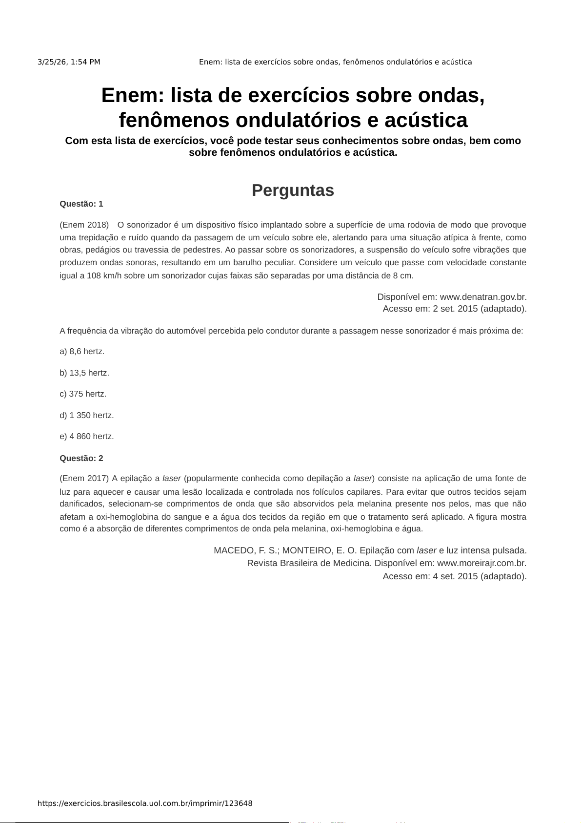 Impresso por Denis Contente, E-mail dcontente@uoledtech.com para uso pessoal e privado. Este material pode ser protegido por direitos autorais e não pode ser reproduzido ou repassado para terceiros. 07/04/2026, 14:50:58 Enem: lista de exercícios sobre ondas, fenômenos ondulatórios e acústica Com esta lista de exercícios, você pode testar seus conhecimentos sobre ondas, bem como sobre fenômenos ondulatórios e acústica. Perguntas Questão: 1 (Enem 2018) O sonorizador é um dispositivo físico implantado sobre a superfície de uma rodovia de modo que provoque uma trepidação e ruído quando da passagem de um veículo sobre ele, alertando para uma situação atípica à frente, como obras, pedágios ou travessia de pedestres. Ao passar sobre os sonorizadores, a suspensão do veículo sofre vibrações que produzem ondas sonoras, resultando em um barulho peculiar. Considere um veículo que passe com velocidade constante igual a 108 km/h sobre um sonorizador cujas faixas são separadas por uma distância de 8 cm. Disponível em: www.denatran.gov.br. Acesso em: 2 set. 2015 (adaptado). A frequência da vibração do automóvel percebida pelo condutor durante a passagem nesse sonorizador é mais próxima de: a) 8,6 hertz. b) 13,5 hertz. c) 375 hertz. d) 1 350 hertz. e) 4 860 hertz. Questão: 2 (Enem 2017) A epilação a (popularmente conhecida como depilação a ) consiste na aplicação de uma fonte de laser laser luz para aquecer e causar uma lesão localizada e controlada nos folículos capilares. Para evitar que outros tecidos sejam danificados, selecionam-se comprimentos de onda que são absorvidos pela melanina presente nos pelos, mas que não afetam a oxi-hemoglobina do sangue e a água dos tecidos da região em que o tratamento será aplicado. A figura mostra como é a absorção de diferentes comprimentos de onda pela melanina, oxi-hemoglobina e água. MACEDO, F. S.; MONTEIRO, E. O. Epilação com e luz intensa pulsada.laser Revista Brasileira de Medicina. Disponível em: www.moreirajr.com.br. Acesso em: 4 set. 2015 (adaptado). 3/25/26, 1:54 PM Enem: lista de exercícios sobre ondas, fenômenos ondulatórios e acústica https://exercicios.brasilescola.uol.com.br/imprimir/123648 1/15