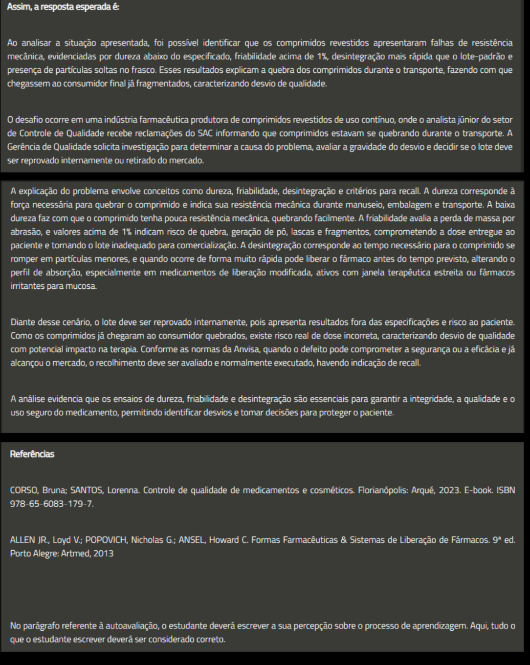 Assim, a resposta esperada é: Ao analisar a situação apresentada, foi possível identificar que comprimidos revestidos apresentaram falhas de resistência mecânica, evidenciadas por dureza abaixo do especificado, friabilidade acima de 1%, desintegração mais rápida que 0 lote-padrão e presença de partículas soltas no frasco. Esses resultados explicam a quebra dos comprimidos durante 0 transporte, fazendo com que chegassem ao consumidor final já fragmentados, caracterizando desvio de qualidade. 0 desafio ocorre em uma indústria farmacêutica produtora de comprimidos revestidos de contínuo, onde 0 analista júnior do setor de Controle de Qualidade recebe reclamações do SAC informando que comprimidos estavam se quebrando durante 0 transporte. A Gerência de Qualidade solicita investigação para determinar a causa do problema, avaliar a gravidade do desvio e decidir se 0 lote deve ser reprovado internamente ou retirado do mercado. A explicação do problema envolve conceitos como dureza, friabilidade, desintegração e critérios para recall. A dureza corresponde à força necessária para quebrar comprimido e indica sua resistência mecânica durante manuseio, embalagem e transporte. A baixa dureza faz com que 0 comprimido tenha pouca resistência mecânica, quebrando facilmente. A friabilidade avalia a perda de massa por abrasão, e valores acima de 1% indicam risco de quebra, geração de pó, lascas e fragmentos, comprometendo a dose entregue ao paciente e tornando 0 lote inadequado para comercialização. A desintegração corresponde ao tempo necessário para comprimido se romper em partículas menores, e quando ocorre de forma muito rápida pode liberar 0 fármaco antes do tempo previsto, alterando 0 perfil de absorção, especialmente em medicamentos de liberação modificada, ativos com janela terapêutica estreita ou fármacos irritantes para mucosa. Diante desse cenário, 0 lote deve ser reprovado internamente, pois apresenta resultados fora das especificações e risco ao paciente. Como comprimidos já chegaram ao consumidor quebrados, existe risco real de dose incorreta, caracterizando desvio de qualidade com potencial impacto na terapia. Conforme as normas da Anvisa, quando 0 defeito pode comprometer a segurança ou a eficácia e já alcançou 0 mercado, 0 recolhimento deve ser avaliado e normalmente executado, havendo indicação de recall. A análise evidencia que ensaios de dureza, friabilidade e desintegração são essenciais para garantir a integridade, a qualidade e 0 seguro do medicamento, permitindo identificar desvios e tomar decisões para proteger 0 paciente. Referências CORSO, Bruna; SANTOS, Lorenna. Controle de qualidade de medicamentos e cosméticos. Florianópolis: Arqué, 2023. E-book. ISBN 978-65-6083-179-7. ALLEN JR., Loyd V.; POPOVICH, Nicholas G.; ANSEL, Howard C. Formas Farmacêuticas & Sistemas de Liberação de Fármacos. ed. Porto Alegre: Artmed, 2013 No parágrafo referente à autoavaliação, 0 estudante deverá escrever a sua percepção sobre 0 processo de aprendizagem. Aqui, tudo que 0 estudante escrever deverá ser considerado correto.