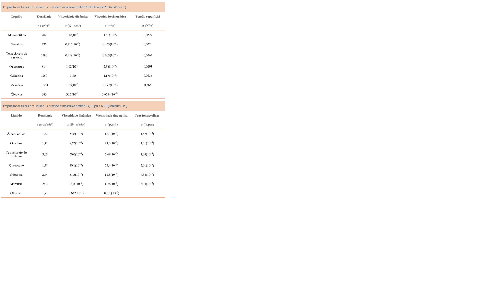 Propriedades físicas dos à pressão atmosférica padrão 101,3 kPa e 20°C (unidades Líquido Densidade Viscosidade Viscosidade cinematica Tensão superficial (N (m²/s) (N/m) Álcool 789 Gasolina 726 Tetracloreto de 1590 carbono Querosene 814 Glicerina 1260 1,50 0,0633 13550 0,177(10 0,466 Óleo cru 880 Propriedades físicas dos líquidos à pressão atmosférica padrão 14,70 psi e 68°F (unidades FPS) Líquido Densidade Viscosidade dinâmica Viscosidade cinematica Tensão superficial (lb Álcool 1,53 Gasolina 1,41 Tetracloreto de 3,09 carbono Querosene 1,58 Glicerina 2,44 26,3 Óleo cru 1,71
