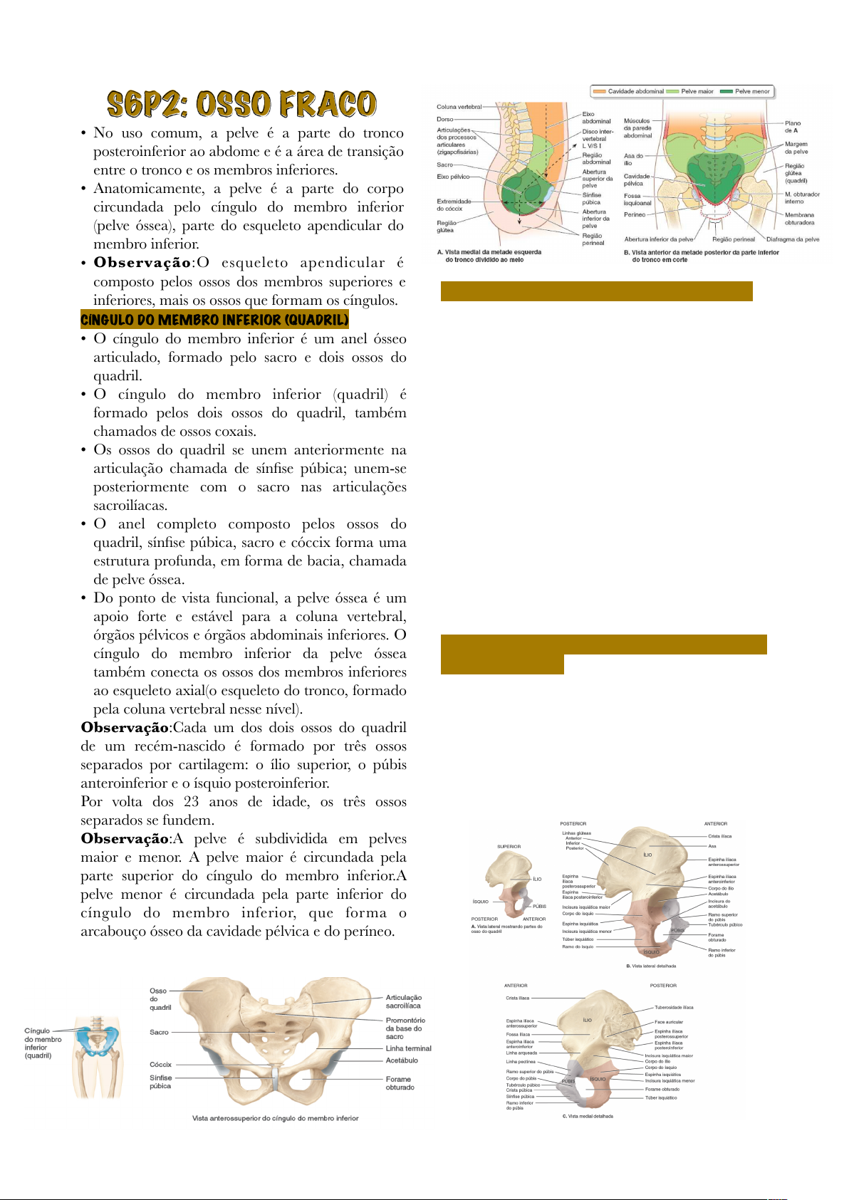 S6P2: OSSO FRACO • No uso comum, a pelve é a parte do tronco posteroinferior ao abdome e é a área de transição entre o tronco e os membros inferiores. • Anatomicamente, a pelve é a parte do corpo circundada pelo cíngulo do membro inferior (pelve óssea), parte do esqueleto apendicular do membro inferior. • Observação:O esqueleto apendicular é composto pelos ossos dos membros superiores e inferiores, mais os ossos que formam os cíngulos. CÍNGULO DO MEMBRO INFERIOR (QUADRIL) • O cíngulo do membro inferior é um anel ósseo articulado, formado pelo sacro e dois ossos do quadril. • O cíngulo do membro inferior (quadril) é formado pelos dois ossos do quadril, também chamados de ossos coxais. • Os ossos do quadril se unem anteriormente na articulação chamada de sínfise púbica; unem-se posteriormente com o sacro nas articulações sacroilíacas. • O anel completo composto pelos ossos do quadril, sínfise púbica, sacro e cóccix forma uma estrutura profunda, em forma de bacia, chamada de pelve óssea. • Do ponto de vista funcional, a pelve óssea é um apoio forte e estável para a coluna vertebral, órgãos pélvicos e órgãos abdominais inferiores. O cíngulo do membro inferior da pelve óssea também conecta os ossos dos membros inferiores ao esqueleto axial(o esqueleto do tronco, formado pela coluna vertebral nesse nível). Observação:Cada um dos dois ossos do quadril de um recém-nascido é formado por três ossos separados por cartilagem: o ílio superior, o púbis anteroinferior e o ísquio posteroinferior. Por volta dos 23 anos de idade, os três ossos separados se fundem. Observação:A pelve é subdividida em pelves maior e menor. A pelve maior é circundada pela parte superior do cíngulo do membro inferior.A pelve menor é circundada pela parte inferior do cíngulo do membro inferior, que forma o arcabouço ósseo da cavidade pélvica e do períneo. FUNÇÕES DO GIRO DO CÍNGULO INFERIOR(QUADRIL) • Sustentação do peso da parte superior do corpo nas posições sentada e ortostática. • Transferência do peso do esqueleto axial para o esqueleto apendicular inferior em posição ortostática e durante a deambulação. • Conter e proteger as vísceras pélvicas (partes inferiores do sistema urinário e dos órgãos genitais internos) e as vísceras abdominais inferiores (p. ex., intestinos) e, ao mesmo tempo, permitir a passagem de suas partes terminais (e, nas mulheres, de um feto a termo) via períneo. • Proporcionar sustentação para as vísceras abdominopélvicas e o útero grávido. • Proporcionar fixação para os músculos e membranas que auxiliam as funções citadas anteriormente, formando o assoalho pélvico e preenchendo espaços existentes nele ou ao seu redor. OSSOS E CARACTERÍSTICAS DO CÍNGULO DO MEMBRO INFERIOR • No indivíduo maduro, o cíngulo do membro inferior é formado por três ossos: • Ossos do quadril direito e esquerdo: ossos grandes, de formato irregular; cada um deles é formado pela fusão de três ossos, ílio, ísquio e púbis Maria Vitória de Sousa Santos - MED 35 • Sacro: formado pela fusão de cinco vértebras sacrais, originalmente separadas(também faz parte do esqueleto axial). 1-ÍLIO • O ílio, o maior dos três componentes do osso do quadril, é composto por uma asa superior e um corpo inferior. • O corpo é um dos integrantes do acetábulo, o encaixe para a cabeça do fêmur. • A margem superior do ílio, a crista ilíaca, termina anter ior mente em uma esp inha i l íaca anterossuperior romba. • Abaixo da espinha ilíaca anterossuperior encontramos a espinha ilíaca anteroinferior. Posteriormente, a crista ilíaca termina em uma crista ilíaca posterossuperior aguda. • As espinhas servem de pontos de inserção dos tendões dos músculos do tronco, quadril e coxas. Abaixo da espinha ilíaca posteroinferior está a incisura isquiática maior, pela qual passa o nervo isquiático, o nervo mais longo do corpo, juntamente com outros nervos e músculos. • A face medial do ílio contém a fossa ilíaca, uma concavidade onde está fixado o tendão do músculo ilíaco. • Posteriormente a essa fossa se encontra a tuberosidade ilíaca, um ponto de fixação para o ligamento sacroilíaco, e a face auricular, que se articula com o sacro para formar a articulação sacroilíaca. • Projetando-se anterior e inferiormente a partir da face auricular, há uma crista chamada de linha arqueada. 2-ÍSQUIO • O ísquio, a parte posteroinferior do osso do quadril, compreende um corpo superior e um ramo inferior. O ramo é a parte do ísquio que se funde com o púbis. • Os acidentes anatômicos do ísquio englobam a proeminente espinha isquiática, a incisura isquiática menor abaixo da espinha e um túber isquiático rugoso e espesso. Uma vez que essa tuberosidade proeminente se encontra logo abaixo da pele, é comum que comece a doer após um tempo relativamente curto na posição sentada sobre uma superfície dura. • Juntos, o ramo e o púbis circundam o forame obturado, o maior forame do esqueleto. O forame é assim chamado porque, mesmo que vasos sanguíneos e nervos passem por ele, ele é quase que completamente fechado pela fibrosa membrana obturadora. 3-PÚBIS • O púbis, que significa osso púbico, é a parte anteroinferior do osso do quadril. • Um ramo superior, um ramo inferior e um corpo entre os ramos compõem o púbis. A margem anterossuperior do corpo é a crista púbica e em sua extremidade lateral há uma projeção chamada de tubérculo púbico. • Esse tubérculo é o começo de uma linha elevada, a linha pectínea, a qual se estende superior e lateralmente ao longo do ramo superior para se fundir com a linha arqueada do ílio. • A sínfise púbica é a articulação entre os dois púbis dos ossos do quadril e consiste em um disco de fibrocartilagem. • Inferiormente a essa articulação, os ramos inferiores dos dois ossos púbicos convergem para formar o arco pú