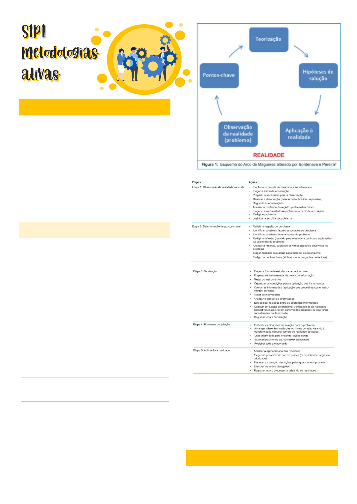 Sistemas Orgânicos Integrados João Victor S. Lima – Medicina – UNINOVAFAPI – 1ºP 1 COMO FUNCIONA Essa metodologia insere o estudante como agente principal responsável pela sua aprendizagem, comprometendo-se com seu aprendizado Professor e estudante agora ficam lado a lado, em parceria para o desenvolvimento e assimilação eficaz do conteúdo Utiliza-se de experiências reais ou simuladas, visando as condições de resolução de problemas, de modo satisfatório, desafios oriundos das atividades essenciais da prática social, em diferentes contextos Enfatiza a importância da experiência para o aprendizado, de modo que a vivência traga a eficiência do que chamamos de aprender na prática MÉTODO DO ARCO 1. Observação da realidade concreta: os estudantes são orientados a observar uma determinada realidade a partir de um tema ou conteúdo, registrando suas percepções com foco no tema 2. Determinação de pontos chaves: os estudantes refletem sobre a gênese do problema, buscando, em uma análise mais criteriosa, soluções para resolvê-lo. O professor orienta os estudantes para uma produção de uma nova síntese e a seleção dos pontos-chave 3. Teorização: os estudantes se organizam para buscar conhecimento e informações sobre o problema em diversas fontes 4. Hipótese de solução: a partir do estudo realizado, são buscados os elementos para a elaboração de possíveis soluções, de forma criativa e crítica. 5. Aplicação prática à realidade Principais objetivos da Metodologia da Problematização (MP): Desencadear o pensamento reflexivo Mobilizar o potencial social e político do estudante Estimular o raciocínio e o desenvolvimento de habilidades intelectuais O trabalho em grupo contribui para o desenvolvimento de habilidades importantes para conviver, cooperar, comunicar-se, planejar A problematização leva ao desenvolvimento de atividades que permitem ao estudante pensar para além da sua área de formação e especialidade, possibilitando múltiplas abordagens conceituais e o exercício da interdisciplinaridade BENEFÍCIOS Sistemas Orgânicos Integrados João Victor S. Lima – Medicina – UNINOVAFAPI – 1ºP 2 A busca pelo conhecimento proporciona um maior domínio do conteúdo estudado Proporciona a construção de um conhecimento dinâmico que considera o contexto cultural e as experiências individuais Proporciona autonomia ao estudante Busca de informações para o próprio conhecimento, assim o estudante pode conhecer a partir dessa pesquisa, os problemas reais e cotidianos do mundo atual Contribui para uma rotina de estudos ao buscar uma determinada informação, pois não a receberá pronta do professor O contato direto com a realidade de uma população favorece a construção de um vínculo e o entendimento dos alunos sobre a importância da relação médico-paciente Vivenciar a teoria nos cenários de prática significa capacitar os estudantes para a resolução de problemas reais e, por conseguinte, prepará-los para atuação profissional Possibilidade de relacionar o novo e o que foi aprendido anteriormente (revisitar os assuntos nos períodos futuros) Proporciona ao estudante oportunidades de intervenção na realidade concreta, seja individualmente ou coletivamente, proporcionando solidificação do seu conhecimento Desenvolve habilidades como: trabalho em equipe, fazer e receber críticas, auxilia na tomada de decisões, melhora a comunicação com outras pessoas Estimula troca e a construção de ideias por meio do trabalho em grupo (o aluno ensina e aprende ao mesmo tempo) Encoraja o aprendizado crítico-reflexivo, onde o participante tem uma maior aproximação com a realidade Desenvolvimento da autonomia do educando Rompimento com o método tradicional, onde as informações mastigadas são entregues ao aluno e esperado que ele só memorize isso e utilize quando for testado Trabalho em equipe Integração entre prática e teoria Desenvolvimento de uma visão crítica da realidade Favorecimento de uma avaliação formativa Proporciona ao estudante oportunidades de intervenção na realidade concreta, seja individualmente ou coletivamente, proporcionando solidificação do seu conhecimento Desenvolve habilidades como: trabalho em equipe, fazer e receber críticas, auxilia na tomada de decisões, melhora a comunicação com outras pessoas Estimula troca e a construção de ideias por meio do trabalho em grupo (o aluno ensina e aprende ao mesmo tempo) Encoraja o aprendizado crítico-reflexivo, onde o participante tem uma maior aproximação com a realidade Desenvolvimento da autonomia do educando Rompimento com o método tradicional, onde as informações mastigadas são entregues ao aluno e esperado que ele só memorize isso e utilize quando for testado RETENÇÃO DO APRENDIZADO DESAFIOS A MAE não é o suficiente para concretizar o aprendizado de algumas disciplinas básicas do currículo (Anatomia, patologia, histologia...), os alunos relataram que talvez as aulas expositivas dessas matérias poderiam ter sido mais proveitosas Resistência inicial com a MAE, devido a uma dificuldade de entender como se dá o processo de ensino-aprendizagem (alunos não conseguiram se adaptar ao método no primeiro momento) A resistência se deu, pois, os alunos estão acostumados a aulas expositivas desde a educação primária Alguns professores são intolerantes em relação às mudanças na metodologia de ensino e que isso não enriquece o processo de aprendizagem Falta de capacitação de alguns docentes para o método Alguns professores se recusam a sanar dúvidas dos estudantes, alegando que eles deveriam saná-las na literatura Falta de controle e gerenciamento do tempo para a quantidade de atividades e conteúdo, fator que contribui para o estresse e para sintomas de ansiedade Assimetria entre estudantes de uma mesma turma Alunos relataram que não desenvolveram o mínimo de habilidades necessárias para realizar um exame físico Isso se