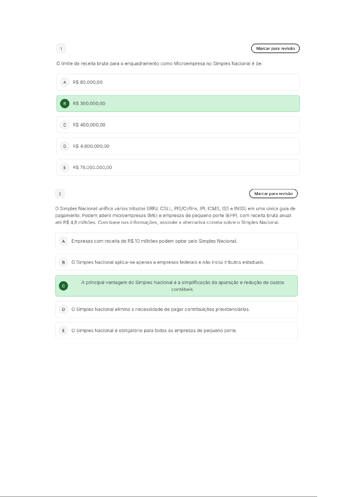 1 Marcar para revisão limite da receita bruta para enquadramento como Microempresa no Simples Nacional é de: A R$ 80.000,00 R$ 360.000,00 C R$ 480.000,00 D R$ 4.800.000,00 E R$ 78.000.000,00 2 Marcar para revisão Simples Nacional unifica vários tributos (IRPJ, CSLL, PIS/Cofins, IPI, ICMS, ISS e INSS) em uma única guia de pagamento. Podem aderir microempresas (ME) e empresas de pequeno porte (EPP), com receita bruta anual até R$ 4,8 milhões. Com base nas informações, assinale a alternativa correta sobre o Simples Nacional. A Empresas com receita de R$ 10 milhões podem optar pelo Simples Nacional. Simples Nacional aplica-se apenas a empresas federais e não inclui tributos estaduais. A principal vantagem do Simples Nacional é a simplificação da apuração e redução de custos contábeis. D Simples Nacional elimina a necessidade de pagar contribuições previdenciárias. E Simples Nacional é obrigatório para todas as empresas de pequeno porte.3 Marcar para revisão Simples Nacional é um regime que unifica diversos tributos e reduz a burocracia para Microempresas (ME) e Empresas de Pequeno Porte (EPP). Contudo, há limites de faturamento e restrições de atividade econômica que determinam quem pode aderir ao regime. Analise as afirmações a seguir sobre enquadramento no Simples Nacional: I. Microempresas podem ter receita bruta anual de até R$ 360.000,00. II. Empresas de pequeno porte podem faturar até R$ 4.800.000,00 por ano. III. Simples Nacional inclui tributos federais, estaduais e municipais em uma única guia. IV. Qualquer empresa, independentemente da atividade, pode aderir ao Simples Nacional. Assinale a alternativa correta: A Apenas e III estão corretas. Apenas e IV estão corretas. c Apenas I, e III estão corretas. D Apenas III e IV estão corretas. E Todas estão corretas. 4 Marcar para revisão Uma forma de se fazer um planejamento tributário com ICMS é: A Vender produtos sem recolhimento de impostos Vender produtos sem notas fiscais c Mudar de estado a fim de obter benefícios fiscais estaduais D Mudar de município a fim de obter benefícios fiscais municipais E Incorrer em despesas dedutíveis, tais como leasing5 Marcar para revisão A escolha do regime tributário é uma decisão crucial para as empresas, uma vez que afeta diretamente a carga fiscal e a forma como os rendimentos são distribuídos aos acionistas. Juros Sobre Capital Próprio como forma de distribuição de rendimento aos acionistas: é mais vantajoso para a empresa do Lucro Real pois gera uma economia de 15% na alíquota do A IR/CSLL é mais vantajoso para a empresa do Lucro Presumido pois gera uma economia de 15% na alíquota do IR/CSLL é mais vantajoso para a empresa do Simples nacional pois gera uma economia de 15% na alíquota do C IR/CSLL é mais vantajoso para a empresa do Lucro Presumido pois gera uma economia de 19% na alíquota do D IR/CSLL é mais vantajoso para a empresa do Lucro Real pois gera uma economia de 19% na alíquota do E IR/CSLL 6 Marcar para revisão Alguns estados brasileiros oferecem incentivos fiscais como redução da base de cálculo, isenção ou diferimento do ICMS para atrair investimentos e impulsionar setores estratégicos. Esses benefícios podem tornar uma localidade mais vantajosa para instalação de empresas, especialmente nos ramos de tecnologia, logística e agroindústria. Com base nas práticas de planejamento tributário estadual, assinale a alternativa correta. A Os incentivos fiscais estaduais são ilegais, pois violam o princípio da isonomia tributária. A escolha do estado com incentivos fiscais não influencia o custo total de operação da empresa. c A adoção de incentivos fiscais deve ser avaliada junto à viabilidade logística e operacional D Os incentivos fiscais estaduais se aplicam apenas às microempresas e empresas de pequeno porte. E A legislação estadual não interfere em estratégias de planejamento tributário.7 Marcar para revisão IRPJ e a CSLL podem ser apurados pelo lucro real ou pelo lucro presumido, dependendo do faturamento e do setor da empresa. Assinale a alternativa que descreve corretamente a diferença entre lucro real e lucro presumido. A No lucro real, aplica-se uma alíquota fixa sobre a receita bruta. No lucro presumido, imposto é calculado sobre o lucro efetivo da empresa. No lucro presumido, uma fração da receita é usada como base de cálculo. D lucro real é permitido apenas para empresas do Simples Nacional. E lucro presumido é obrigatório para empresas com receita acima de R$ 78 milhões. 8 Marcar para revisão Uma empresa pode escolher entre alugar veículos pagando R$ 800.000,00 por ano (totalmente dedutíveis), ou comprar pagando R$ 500.000,00 por ano, porém apenas podendo deduzir o valor de R$ 200.000,00/ano de IRPJ e CSLL. A empresa deve: Optar pela compra tendo em vista que custo do aluguel, considerando o ganho tributário, é de A R$ 528.000,00 Optar pelo aluguel tendo em vista que o custo do aluguel, considerando o ganho tributário, é de R$ 528.000,00 Optar pela compra tendo em vista que custo do aluguel, considerando o ganho tributário é de R$ 432.000,00 Optar pelo aluguel tendo em vista que custo do aluguel, considerando o ganho tributário é de D R$ 432.000,00 E Ambos possuem o mesmo custo para a empresa9 Marcar para revisão Um planejamento tributário eficaz deve respeitar a legislação e a boa-fé, evitando práticas abusivas que simulem operações ou ocultem informações. Quando uma empresa simula operações para reduzir tributos, essa prática caracteriza: A Elisão fiscal legítima. Planejamento tributário eficiente. Evasão fiscal, passível de punição. D Incentivo fiscal autorizado. E Redução fiscal estratégica. 10 Marcar para revisão Processo Administrativo Tributário (PAT) é o procedimento pelo qual a administração fiscal formaliza a cobrança de um tributo devido e assegura ao contribuinte direito de contestar a autuação antes que a cobrança sej