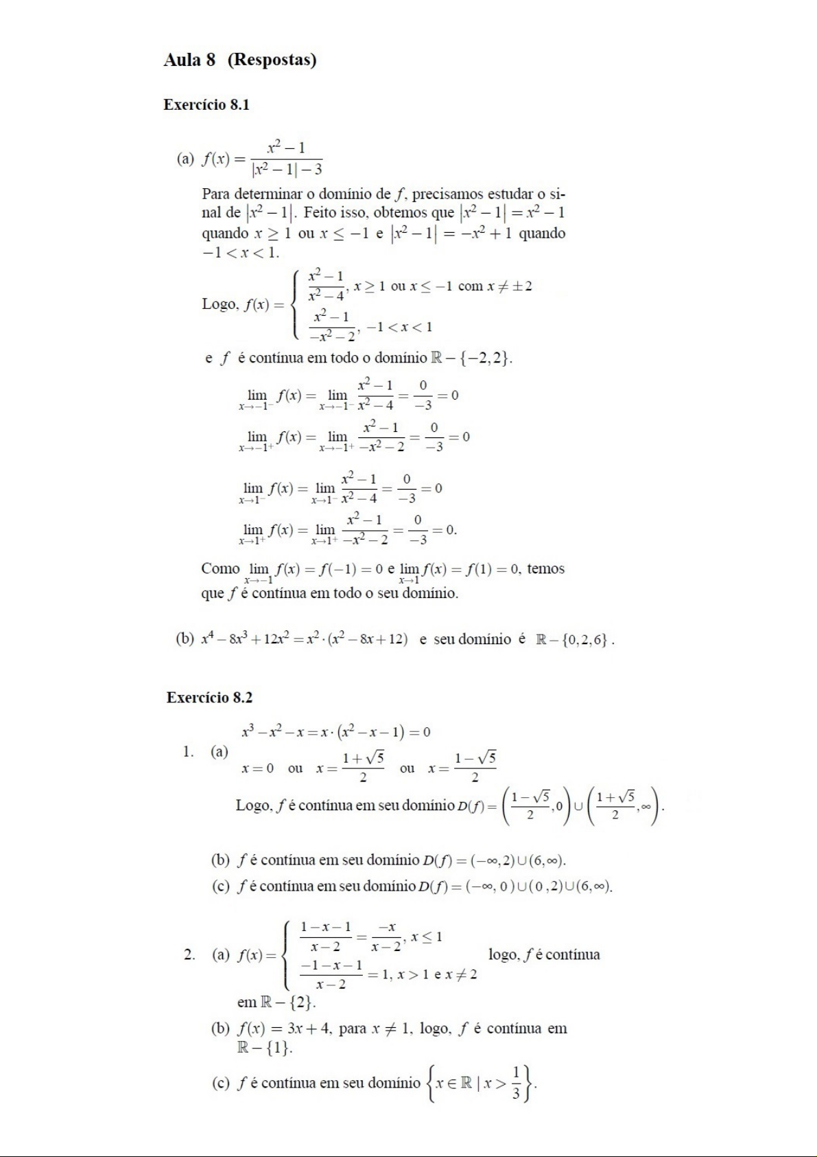 Aula 8 (Respostas) Exercício 8.1 Para determinar o domínio de f, precisamos estudar o si- nal de Feito isso, obtemos que quando ou ≤ +1 quando VI Logo, f(x) e f é contínua em todo o domínio R {-2,2}. Como lim f(x) = = e temos que f é contínua em todo o seu domínio. (b) e seu domínio é -{0,2,6} Exercício 8.2 1. (a) Logo, é contínua em seu domínio D(f) = (b) f é contínua em seu domínio (c) f é contínua em seu domínio D(f) = 2. (a) logo, é contínua (b) = 3x + 4, para x # 1, logo, fé contínua em R-{1}. (c) é contínua em seu domínio