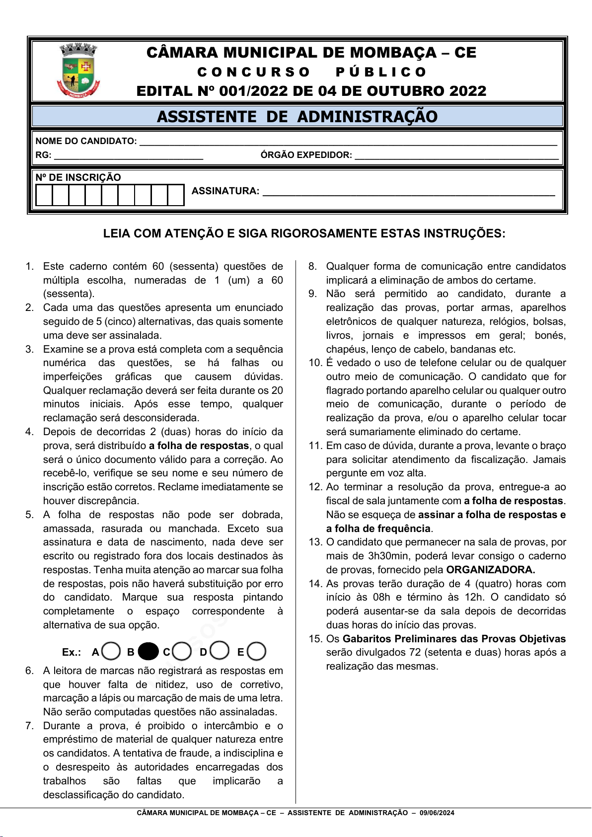 CÂMARA MUNICIPAL DE MOMBAÇA – CE – ASSISTENTE DE ADMINISTRAÇÃO – 09/06/2024