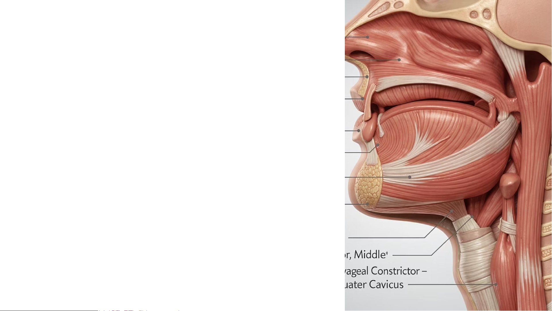 SEÇÃO 3: Músculos e Inserção da Mandíbula, Palato Mole e Faringe CONTEÚDO: Funções muscular da faringe, localização e pintura dos músculos em imagem e elaboração de manual, músculos da mandíbula origem e inserção, músculos do palato mole fisiologia da musculature. DISCIPLINA: DISTÚRBIOS EM MOTRICIDADE OROFACIAL Profa.: Ariani Zampieri Grotti Ito A Faringe: Estrutura e Função A faringe é uma estrutura musculomembranosa que atua como via comum aos sistemas respiratório e digestório, exigindo elevada precisão neuromuscular para garantir segurança e eficiência funcional. Sua musculatura é formada principalmente pelos músculos constritores (superior, médio e inferior) e pelos músculos longitudinais estilofaríngeo, salpingofaríngeo e palatofaríngeo, responsáveis por elevação e encurtamento da faringe durante as funções orais. https://www.youtube.com/watch?v=sV4W156Xc0U https://www.youtube.com/watch?v=sV4W156Xc0U Fase Faríngea da Deglutição Durante a fase faríngea da deglutição, ocorre uma sequência rápida, automática e altamente coordenada de eventos neuromusculares. Os músculos constritores da faringe se contraem de forma peristáltica, promovendo a propulsão do bolo alimentar da orofaringe em direção ao esôfago. Músculos Longitudinais da Faringe Paralelamente a esse movimento, atuam de maneira fundamental os músculos longitudinais da faringe — estilofaríngeo, salpingofaríngeo e palatofaríngeo. Eles são responsáveis pela elevação e encurtamento da faringe, o que facilita a ascensão da laringe e contribui para o deslocamento eficiente do bolo alimentar. Essa elevação reduz a distância entre a orofaringe e o esôfago, tornando o trajeto mais curto e seguro. Além disso, o encurtamento faríngeo melhora o contato entre a base da língua e a parede posterior da faringe, aumentando a eficiência propulsiva. Proteção das Vias Aéreas Simultaneamente, há elevação e anteriorização da laringe, fechamento da glote e adequação do esfíncter esofágico superior, mecanismos essenciais para a proteção das vias aéreas. Esse processo é reflexo e altamente dependente da integridade neuromuscular da faringe. Papel da Faringe na Respiração A faringe desempenha papel essencial na respiração, pois permite a passagem do ar da cavidade nasal e oral em direção à laringe e aos pulmões. Para que essa passagem ocorra de forma eficiente, é necessário que a musculatura faríngea mantenha um calibre adequado, evitando estreitamentos ou colapsos do espaço aéreo. Tônus Muscular Faríngeo Durante o estado de vigília, o tônus da musculatura faríngea é suficiente para manter as paredes da faringe estáveis, assegurando fluxo aéreo contínuo e silencioso. Já durante o sono e em situações de repouso profundo, ocorre uma redução fisiológica do tônus muscular. Nesses momentos, a integridade e o equilíbrio da musculatura faríngea tornam-se ainda mais importantes para evitar o estreitamento das vias aéreas, especialmente na orofaringe favorecendo ronco, respiração oral e distúrbios respiratórios do sono. Faringe e Ressonância Vocal No âmbito da voz e da ressonância, a faringe funciona como uma cavidade de modulação acústica. Ajustes de contração e relaxamento de sua musculatura alteram o espaço ressonantal, influenciando timbre, projeção vocal e qualidade da voz. Disfunções musculares faríngeas podem resultar em voz abafada, hiponasalidade, instabilidade vocal ou esforço excessivo durante a fonação. MM da Faringe Nome: _________________________________ Turma: ___________ MM da Faringe Nome: _________________________________ Turma: ___________ "Apertam" o bolo para baixo. MM DA FARINGE Constritor Superior • Origem: hâmulo pterigóideo , rafe pterigomandibular , posição posterior da mandíbula e lado da língua . • Inserção: rafe faríngea (linha média posterior) e tubérculo faríngeo (osso occipital). "Apertam" o bolo para baixo. MM DA FARINGE Constritor Médio • Origem: corno maior e menor do hióide e ligamento estilo-hióideo . • Inserção: rafe faríngea . "Apertam" o bolo para baixo. MM DA FARINGE Constritor Inferior • Origem: cartilagem tireoide (linha oblíqua) e cartilagem cricoide . • Inserção: rafe faríngea (porção inferior continua com o esôfago). MM DA FARINGE Estilofaríngeo Eleva a laringe e a faringe. • Origem: processo estilóide do osso temporal. • Inserção: parede lateral da faringe e borda posterior da cartilagem tireoide . MM DA FARINGE Salpingofaríngeo Eleva a faringe durante a deglutição, encurtando e alargando a sua luz. • Origem: cartilagem da tuba auditiva . • Inserção: misture-se ao palatofaríngeo na parede lateral da faringe . Palatofaríngeo Eleva a faringe e a laringe durante a deglutição e a fala • Origem: palato duro (porção posterior) e aponeurose palatina . • Inserção: parede lateral da faringe e borda posterior da cartilagem tireoide (mistura- se a constritores). MM DA FARINGE Palato Mole O palato mole é uma estrutura musculomembranosa altamente móvel, localizada posteriormente ao palato duro, cuja fisiologia muscular é essencial para a fala, deglutição, respiração e ressonância vocal. Diferentemente do palato duro, o palato mole não possui suporte ósseo, dependendo exclusivamente da ação coordenada de seus músculos para desempenhar suas funções. Músculos do palate mole A musculatura do palato mole é composta por músculos estriados esqueléticos, capazes de realizar movimentos rápidos e precisos. Fisiologicamente, esses músculos atuam promovendo elevação, abaixamento, tensão e mobilidade lateral do véu palatino, permitindo o ajuste fino entre a cavidade oral e a cavidade nasal conforme a função exercida. O principal mecanismo funcional do palato mole é o fechamento velofaríngeo, que ocorre quando o palato se eleva e entra em contato com a parede posterior da faringe. Durante a deglutição, a 