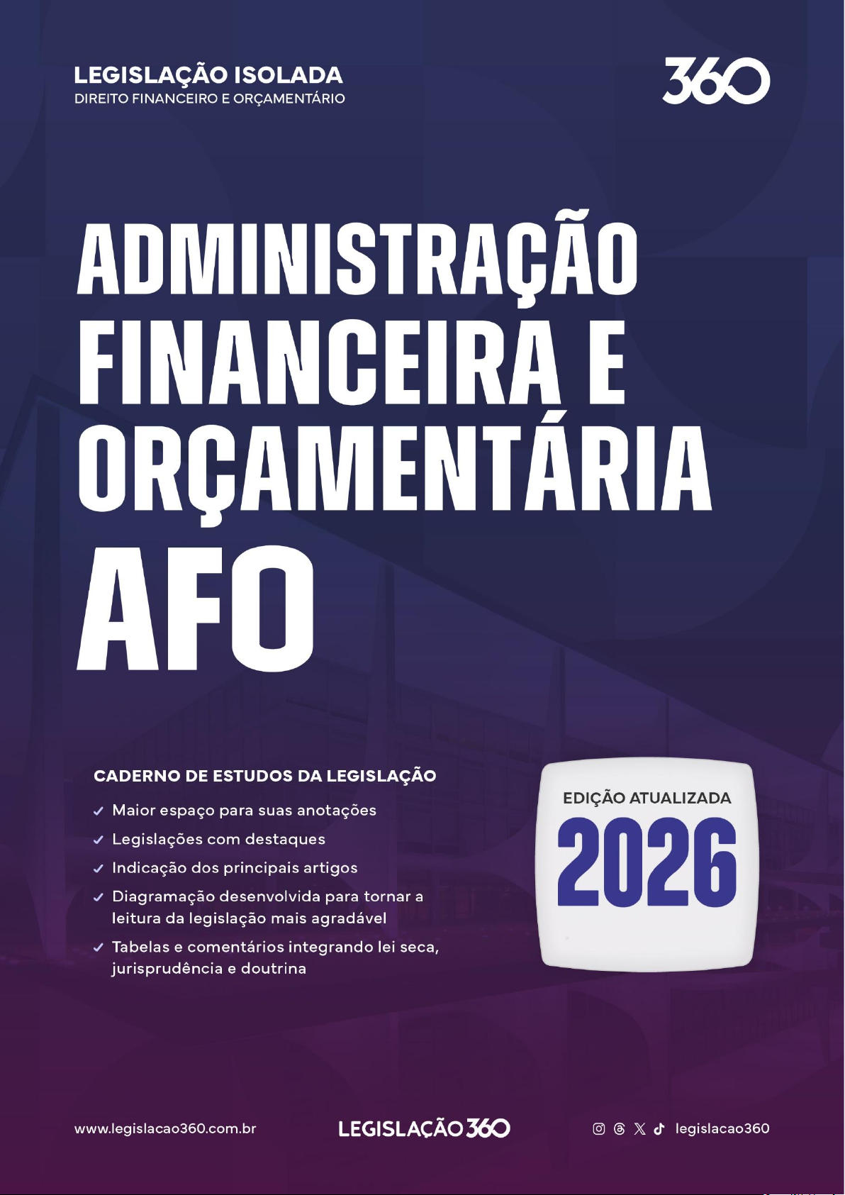 1 2026.1 2 2026.1, 02.01.2026 3 INDICAÇÃO DOS PRINCIPAIS ARTIGOS TABELAS E JURISPRUDÊNCIA REDAÇÃO SIMPLIFICADA LEGISLAÇÃO COM DESTAQUES Avance no estudo das legislações e organize todas as suas anotações em um só lugar. Criamos este formato de caderno de estudos, combinando a letra da lei, jurisprudência, tabelas, comentários e o espaço dedicado para as suas anotações. Além das demais marcações, destacamos com uma estrela os artigos com maior incidência em provas e dispositivos que merecem atenção especial. Para aprofundar seus estudos, incluímos as jurisprudências relacionadas aos dispositivos e tabelas esquematizando a doutrina. Desenvolvemos uma diagramação especial para as legislações, facilitando muito a sua leitura. Além disso, também simplificamos a redação dos dispositivos, especialmente nos números. NEGRITO › ROXO › LARANJA › CINZA SUBLINHADO › Utilizado para realçar termos importantes. Aplicado para destacar números, incluindo datas, prazos, percentuais e outros valores numéricos. Expressões que denotam negação, ressalva ou exceção. Indica vetos e revogações. Dispositivos cuja eficácia está prejudicada, mas não estão revogados expressamente. ESPAÇO PARA ANOTAÇÕES CINZA TACHADO › Desenvolvimento editorial e todos os direitos reservados a 360® Editora Jurídica Ltda. Material protegido por direitos autorais. A aquisição deste produto está vinculada à concessão de licença de uso pessoal. É proibida a reprodução ou a distribuição, ainda que sem fins lucrativos, sem a expressa autorização da 360 Editora Jurídica Ltda., nos termos da Lei nº 9.610/98 (Lei de Direitos Autorais). Todos os materiais da Legislação 360, vendidos exclusivamente pelo site www.legislacao360.com.br, possuem dados de identificação do usuário, incluídos também na codificação não editável de cada arquivo. www.legislacao360.com.br — editora@360.ltda — CNPJ 51.278.476/0001-20 Desde a criação da Legislação 360, em 2018, desenvolvemos materiais que facilitam o estudo da lei seca, o principal pilar para a aprovação em concursos públicos. O formato dos cadernos de estudos, além de integrar legislação, jurisprudência e doutrina, também inclui marcações, organizadas da seguinte forma: 4 SUMÁRIO ÍNDICE DAS TABELAS ...................................................................................................................................................................................... 5 Lei 4.320/64 - Normas Gerais de Direito Financeiro ......................................................................................................................... 7 Disposição Preliminar .............................................................................................................................................................................................. 8 Título I - Da Lei de Orçamento ........................................................................................................................................................................... 12 Título II - Da Proposta Orçamentária .............................................................................................................................................................. 23 Título III - Da elaboração da Lei de Orçamento ........................................................................................................................................... 25 Título IV - Do Exercício Financeiro .................................................................................................................................................................. 26 Título V - Dos Créditos Adicionais ................................................................................................................................................................... 30 Título VI - Da Execução do Orçamento .......................................................................................................................................................... 33 Título VII - Dos Fundos Especiais ...................................................................................................................................................................... 39 Título VIII - Do Controle da Execução Orçamentária................................................................................................................................ 40 Título IX - Da Contabilidade ............................................................................................................................................................................... 42 Título X - Das Autarquias e Outras Entidades .............................................................................................................................................. 47 Título XI - Disposições Finais ............................................................................................................................................................................. 48 LC 101/00 - Lei de Responsabilidade Fiscal (LRF) ............................................................................................................................ 49 Lei 10.180/01 - Sistema de Planejamento e de Orçamento Federal ......................................................................................... 93 Referências ..................................................................................................................................................................................................... 103 5 ÍNDICE DAS TABELAS Lei 4.320/64 - Normas Gerais de Direito Financeiro .................................................................... 7 Finalidades da Atividade Financeira do Estado .................................................................................. 8 Funções do Governo * ..................................