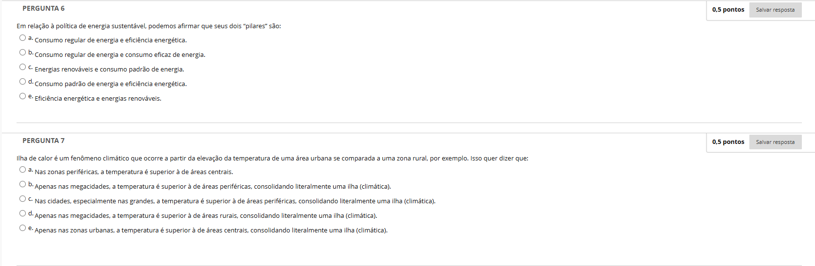 PERGUNTA 6 0,5 pontos Salvar resposta Em relação à política de energia sustentável, podemos afirmar que seus dois "pilares" são: a. Consumo regular de energia e eficiência energética. b. Consumo regular de energia e consumo eficaz de energia. Energias renováveis e consumo padrão de energia. d. Consumo padrão de energia e eficiência energética. e. Eficiência energética e energias renováveis. PERGUNTA 7 0,5 pontos Salvar resposta Ilha de calor é um fenômeno climático que ocorre a partir da elevação da temperatura de uma área urbana se comparada a uma zona rural, por exemplo. Isso quer dizer que: a. Nas zonas periféricas, a temperatura é superior à de áreas centrais. b. Apenas nas megacidades, a temperatura é superior à de áreas periféricas, consolidando literalmente uma ilha (climática). C. Nas cidades, especialmente nas grandes, a temperatura é superior à de áreas periféricas, consolidando literalmente uma ilha (climática). d. Apenas nas megacidades, a temperatura é superior à de áreas rurais, consolidando literalmente uma ilha (climática). e. Apenas nas zonas urbanas, a temperatura é superior à de áreas centrais, consolidando literalmente uma ilha (climática).