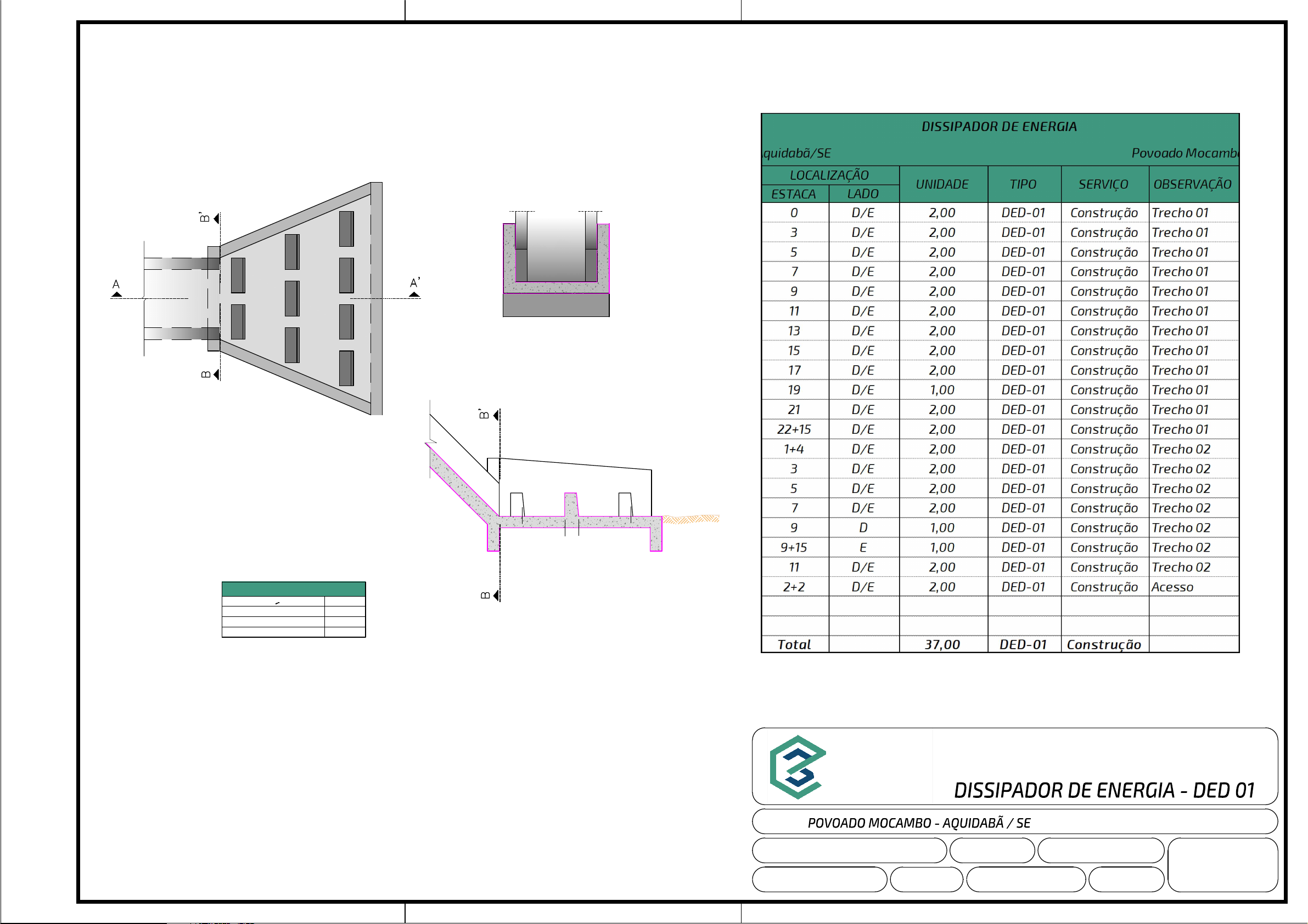 CORTE AA' PLANTA DISSIPADOR DE ENERGIA - DED 01 CORTE BB' CONSUMOS MÉDIOS ESCAVAÇÃO CONCRETO fck > 15 MPa 0,37 m³ FORMAS 4,35 m² 0,70 m³ APILOAMENTO 0,35 m³ 1 - DIMENSÕES EM cm; OBSERVAÇÕES: 2 - OS DENTES SERÃO FUNDIDOS SIMULTANEAMENTE COM A SOLEIRA, FORMANDO CONJUNTO MONOLÍTICO. FORMATO A3 - 420 x 297 mm. E3soluções em engenharia ® E-MAIL: CONTATO.E3@GMAIL.COM CELULAR: 79 9 9991-7102 CELULAR: 79 9 9942-4828 CONTATO: 07/07DATA: 00 REVISÃO: 1:500 ESCALA: DESENHO: 1:1 ESCALA PLOTAGEM: DESENHISTA: ENDEREÇO: FOLHA: SE20230352086 ART: PROJETO DE DRENAGEM ELIAKIM DISSIPADOR DE ENERGIA - DED 01 DEZ/2023 IFR_AQD_DRE_MOC_R0 POVOADO MOCAMBO - AQUIDABÃ / SE AutoCAD SHX Text A AutoCAD SHX Text A' AutoCAD SHX Text B AutoCAD SHX Text B' AutoCAD SHX Text B AutoCAD SHX Text B' Sheets and Views 07_07 2023-12-14T10:01:23-0300 E3 SOLUCOES EM ENGENHARIA LTDA:40950946000133