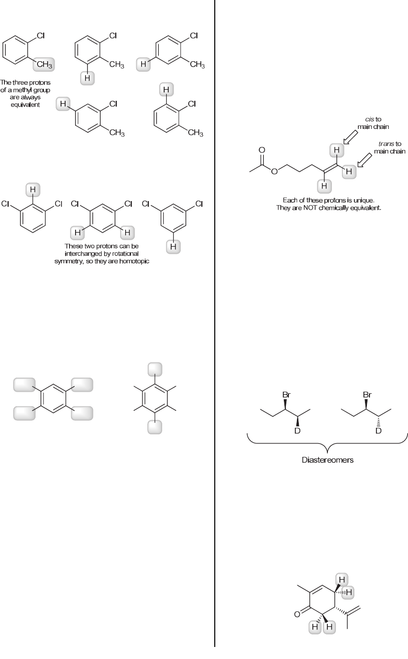 524 CHAPTER 15 (e) This compound has five different kinds of protons (highlighted below), giving rise to five signals. (f) This compound has three different kinds of protons (highlighted below), giving rise to three signals. (g) This compound has four protons and none of them can be interchanged by rotational or reflectional symmetry. Each of the four protons occupies a unique electronic environment, giving rise to four signals. (h) This compound has two different kinds of protons (highlighted below), giving rise to two signals. H3C CH3 H3C CH3 H CH3 H3C H These two protons can be interchanged by rotational symmetry, so they are all equivalent These four methyl groups can be interchanged by rotational symmetry, so all twelve protons are homotopic CH3 H3C (i) Due to the location of the two bromine atoms, each CH2 group occupies a unique electron environment, giving rise to two separate signals (one for each CH2 group). In addition, the two methyl groups are also in different electronic environments, giving two separate signals. In total, we expect four signals. (j) Each of the protons in each CH2 group is in a unique electronic environment, as a result of the presence of a chiral center. That is, each CH2 group gives rise to two separate signals, so the two CH2 groups collectively give rise to four different signals. The two methyl groups are also different from each other (because of their proximity to the bromine atom), giving two more signals. In addition, there is one signal from the proton attached to the carbon bearing the bromine atom. In total, we expect seven signals. (k) As we saw in the solution to Problem 15.2c, pentane is expected to produce three signals in its 1H NMR spectrum. A similar analysis of heptane indicates that its 1H NMR spectrum should contain four signals. (l) Each of the three vinylic protons occupies a unique electronic environment, giving rise to three separate signals: The two vinylic protons at the very end are different from each other because one is cis to the main chain and the other is trans to the main chain, as shown. Each of the CH2 groups provides one signal (because each CH2 group occupies a unique electronic environment), and the CH3 provides one more signal, giving a total of seven signals. 15.6. The presence of the bromine atom does not render C3 a chiral center because there are two ethyl groups connected to C3. Nevertheless, the presence of the bromine atom does prevent the two protons at C2 from being interchangeable by reflection. The replacement test gives a pair of diastereomers, so the protons are diastereotopic (which means that they are not chemically equivalent). 15.7. Each of the protons in the following highlighted CH2 groups is in a unique electronic environment, as a result of the presence of the chiral center. That is, each CH2 group will give rise to two separate signals, because one H is on the same face as (cis to) the propenyl substituent, while the other H is further away from it, on the opposite face as (trans to) the propenyl substituent. Therefore, these two CH2 groups collectively give rise to four different signals: www.MyEbookNiche.eCrater.com