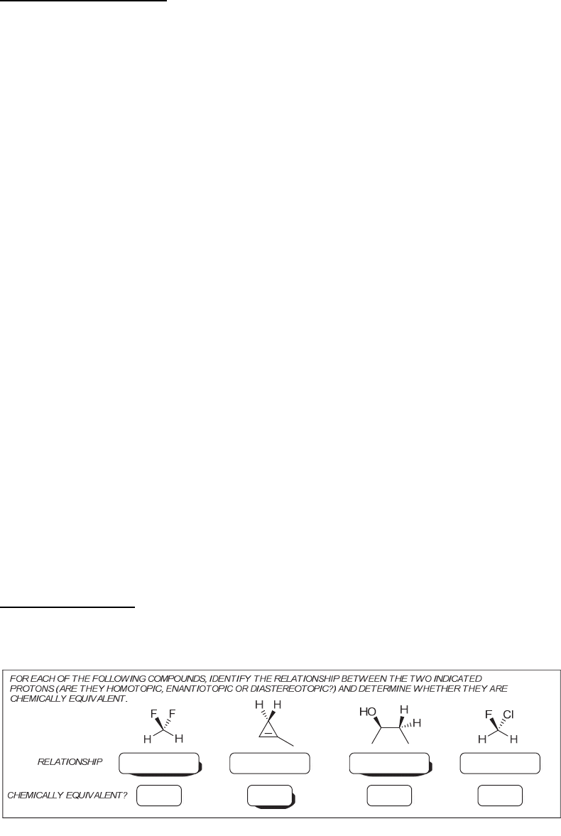 Chapter 15 Nuclear Magnetic Resonance Spectroscopy Review of Concepts Fill in the blanks below. To verify that your answers are correct, look in your textbook at the end of Chapter 15. Each of the sentences below appears verbatim in the section entitled Review of Concepts and Vocabulary. A spinning proton generates a magnetic _____________, which must align either with or against an imposed external magnetic field. All protons do not absorb the same frequency because of __________________, a weak magnetic effect due to the motion of surrounding electrons that either shield or deshield the proton. ________________ solvents are generally used for acquiring NMR spectra. In a 1H NMR spectrum, each signal has three important characteristics: ________, ________ and ___________. When two protons are interchangeable by rotational symmetry, the protons are said to be ___________. When two protons are interchangeable by reflectional symmetry, the protons are said to be ___________. The left side of an NMR spectrum is described as _____field, and the right side is described as _____field. In the absence of inductive effects, a methyl group (CH3) will produce a signal near _____ppm, a methylene group (CH2) will produce a signal near _____, and a __________ group (CH) will produce a signal near _____. The presence of nearby groups increases these values somewhat predictably. The _______________, or area under each signal, indicates the number of protons giving rise to the signal. _______________represents the number of peaks in a signal. A __________has one peak, a __________has two, a __________has three, a __________has four, and a __________has five. Multiplicity is the result of spin-spin splitting, also called __________, which follows the n+1 rule. When signal splitting occurs, the distance between the individual peaks of a signal is called the coupling constant, or _____ value, and is measured in hertz. Complex splitting occurs when a proton has two different kinds of neighbors, often producing a __________. 13C is an __________of carbon, representing _____% of all carbon atoms. All 13C-1H splitting is suppressed with a technique called broadband ______________, causing all of the 13C signals to collapse to ___________. Review of Skills Fill in the blanks and empty boxes below. To verify that your answers are correct, look in your textbook at the end of Chapter 15. The answers appear in the section entitled SkillBuilder Review. 15.1 Determining the Relationship between Two Protons in a Compound www.MyEbookNiche.eCrater.com