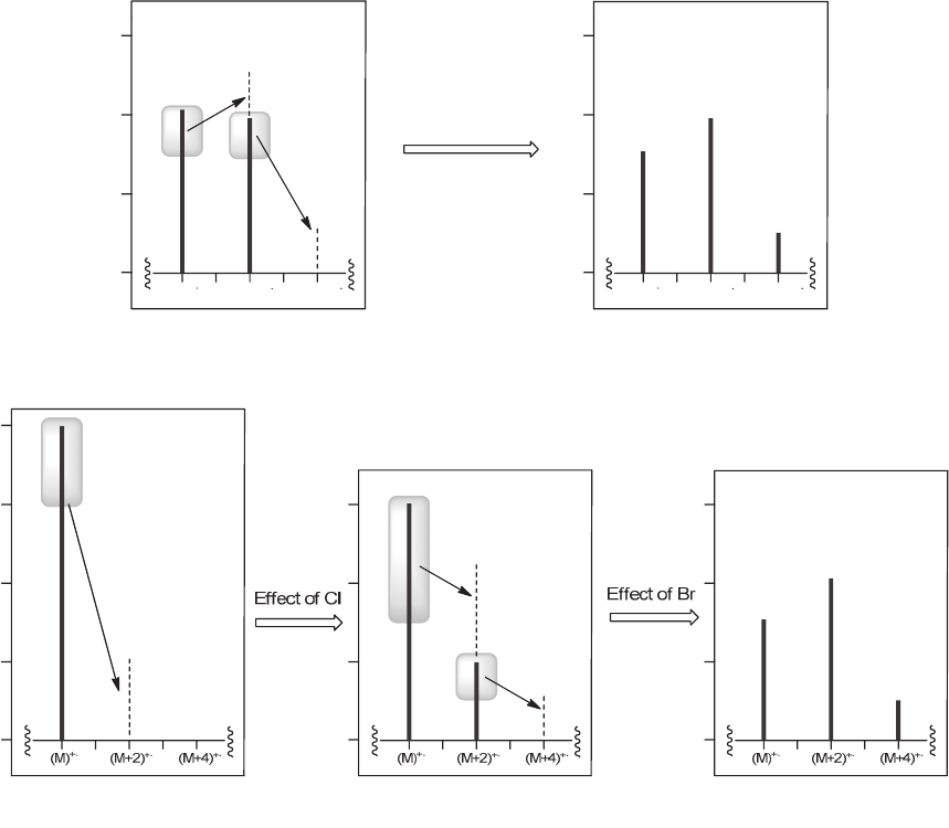 CHAPTER 14 509 (M) (M+2) (M+4)+ + + (M) (M+2) (M+4)+ + + Incidentally, we would arrive at the same characteristic pattern if we had started our analysis by first considering the effect of the chlorine atom and only then considering the effect of the bromine atom, as illustrated here: 14.68. (a) The molecular formula for the dye is C21H15N2O6S-. Using the values in Table 14.5 for C, H, N and O, and the values given in the question for S, we can calculate the expected mass for the parent ion using the most abundant isotope of each element (1H, 12C, 14N, 16O, 32S) as follows. C21H15N2O6S¯ = (21 × 12.000) + (15 × 1.0078) + (2 × 14.0031) + (6 × 15.9949) + (1 × 31.9721) = 423.0647 This is consistent with reported base peak of the spectrum [(M¯), 100% relative intensity]. Now we must consider the other two peaks – the peak at 424.0681 is nominally 1 amu higher than the parent molecular ion, while the peak at 425.0605 is nominally two amu higher. Considering the relative natural isotopic abundances of C, H, N, O and S, the two elements that have the highest percentage of a second isotope are carbon (12C = 98.93%, 13C = 1.07%) and sulfur (32S = 95.02%, 34S = 4.21%). With this in mind, the peak at m/z = 424.0681 is consistent with an ion where one of the 12C atoms is replaced with a 13C. 12C20 13C1H15N2O6S¯ = (20 × 12.000) + (1 × 13.0034) + (15 × 1.0078) + (2 × 14.0031) + (6 × 15.9949) + (1 × 31.9721) = 424.0681 The peak with a nominal mass of 425 is consistent with an ion with one 34S, as demonstrated by the calculation below: C21H15N2O6 34S¯ = (21 × 12.000) + (15 × 1.0078) + (2 × 14.0031) + (6 × 15.9949) + (1 × 33.9679) = 425.0605 www.MyEbookNiche.eCrater.com