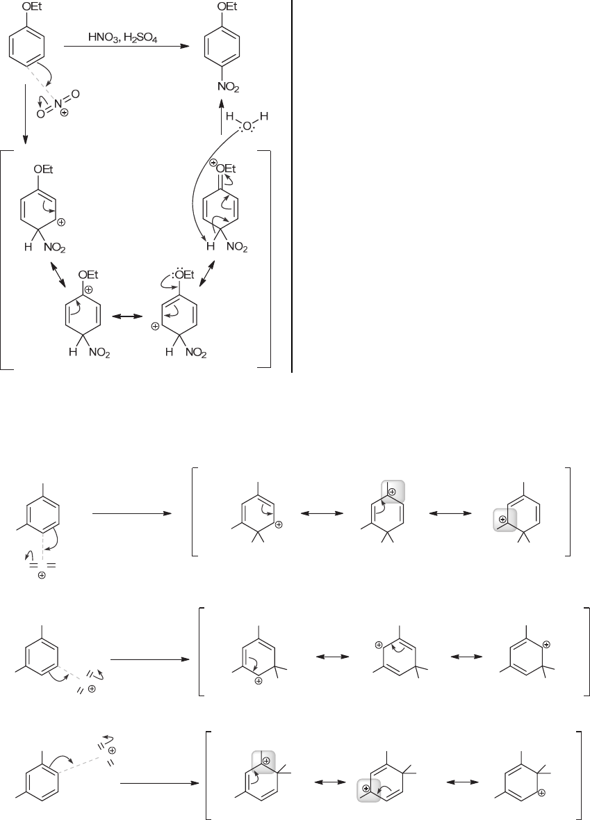 CHAPTER 18 645 Water is the likely base for the final deprotonation step, since water is present (and there are no strong bases present in strongly acidic conditions). 18.13. As shown below, attack at C4 or C6 produces a sigma complex in which two of the resonance structures have a positive charge next to an electron-withdrawing group (NO2). These resonance structures are less contributing to the resonance hybrid, thereby destabilizing the sigma complex. In contrast, attack at C5 produces a sigma complex for which none of the resonance structures have a positive charge next to a nitro group. H NO2 NO2 O2N NO2 H NO2 O2N NO2 N OO O2N NO2 N O O O2N NO2 N O O O2N NO2 H NO2 O2N NO2 H NO2O2N NO2 H NO2O2N H NO2 NO2 O2N NO2 H NO2 O2N NO2 H NO2O2N H NO2 NO2 O2N ATTACK AT C6 ATTACK AT C5 ATTACK AT C4 Attack at C2 is identical to attack at C4 because the starting material has symmetry that renders C2 and C4 identical. 18.14. The chlorine atom in chlorobenzene deactivates the ring relative to benzene. If benzene requires a Lewis acid for chlorination, than chlorobenzene should certainly require a Lewis acid for chlorination. www.MyEbookNiche.eCrater.com