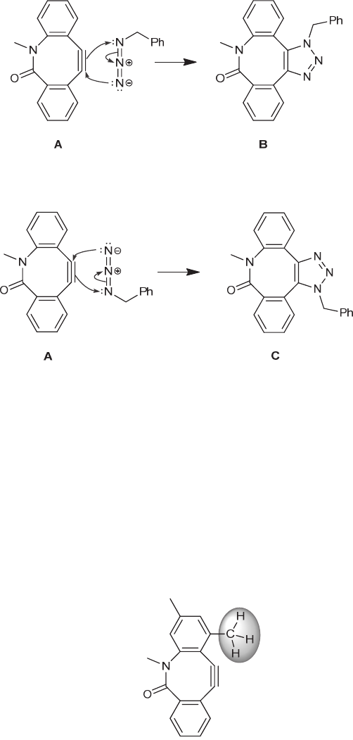 CHAPTER 16 599 16.78. (a) The reaction is a cycloaddition process, so we expect a concerted process. The following curved arrows represent a concerted process that would give the product: (b) Depending on the relative orientation of the azide and alkyne during the reaction, the following compound can also be formed. (c) Recall from Chapter 9 that the smallest isolatable cycloalkyne is cyclooctyne, which experiences significant angle strain due to the incorporation of the two adjacent sp hybridized carbon atoms (that should have linear geometry) into an 8-membered ring. As such, compound A has significant angle strain. We can infer that this strain plays an important role in the click reaction, because alkyne D (which is free of this strain) is unreactive under these conditions. This angle strain increases the energy of the starting alkyne, thus decreasing the activation energy of the reaction (since it is now closer in energy to the transition state). Considering the geometry of the atoms involved in the reaction, the angle strain forces the alkyne to have bond angles closer to the angles required in the transition state leading to the sp2 hybridized carbon atoms in the product. In other words, there is a higher activation energy associated with distorting an unstrained alkyne (180°) to an alkene (120°), compared to the analogous conversion of a strained alkyne (