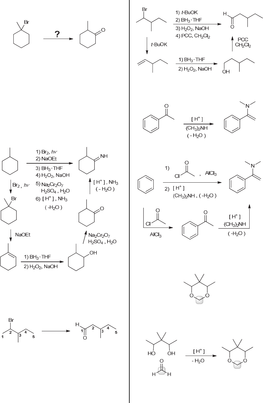 752 CHAPTER 19 With the functional group installed, we must now bridge the gap between the first and last steps of the synthesis: This transformation does not involve a change in the carbon skeleton, but it does involve a change in both the location and the identity of the functional group. This can be achieved in just a few steps: 1) elimination to give an alkene (upon treatment with a strong base), 2) hydroboration-oxidation to convert the alkene into a secondary alcohol via anti-Markovnikov addition of H and OH, and 3) oxidation of the secondary alcohol to a ketone (with chromic acid). The entire synthesis is summarized here: (f) This transformation does not involve a change in the carbon skeleton, but it does involve a change in both the location and the identity of the functional group: This can be achieved in just a few steps: 1) elimination with a strong, sterically hindered base to give the less substituted alkene, 2) hydroboration-oxidation to convert the alkene into a primary alcohol via anti-Markovnikov addition of H and OH, and 3) oxidation of the primary alcohol to an aldehyde (with PCC or DMP or Swern): (g) The product is an enamine, which can be prepared from the corresponding ketone: This ketone can be made from benzene via a Friedel- Crafts acylation: (h) The desired product is an acetal, because the following (highlighted) carbon atom is connected to two oxygen atoms: Therefore, this acetal can be made (via acetal formation) from the following diol and formaldehyde, as shown: So we will need to make this diol from the starting material. This can be achieved in just two steps. First, the starting diyne is treated with sulfuric acid, in the www.MyEbookNiche.eCrater.com