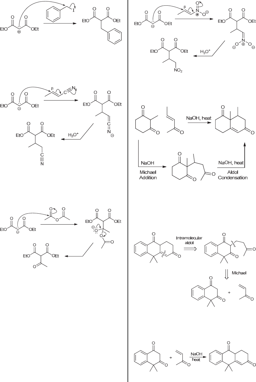 CHAPTER 21 889 (f) The conjugate base of diethyl malonate functions as a nucleophile and attacks the position of the - unsaturated nitrile. The resulting intermediate is converted back into a nitrile upon acid work-up, giving the following product: (g) The conjugate base of diethyl malonate functions as a nucleophile and attacks the acid anhydride to give a tetrahedral intermediate, which expels an acetate ion to reform a carbonyl group (via a nucleophilic acyl substitution reaction): This compound is deprotonated under these conditions (by the acetate ion, which can function as a base), which serves as a driving forced to push the reaction to completion. Then, acid workup gives the proton back, regenerating the product shown above. (h) The conjugate base of diethyl malonate functions as a nucleophile and attacks the position of the - unsaturated nitro compound. The resulting intermediate is converted back into a nitro compound upon acid work- up, giving the following product: 21.85. A Robinson annulation is comprised of a Michael addition, followed by an intramolecular aldol condensation, as shown: 21.86. A Robinson annulation is comprised of a Michael reaction, followed by an intramolecular aldol condensation. To determine the starting materials necessary to prepare the desired product via a Robinson annulation, we draw the following retrosynthetic analysis: These two steps do not represent two separate reactions. A Robinson annulation can be performed in one reaction flask, as shown in the following forward scheme: www.MyEbookNiche.eCrater.com