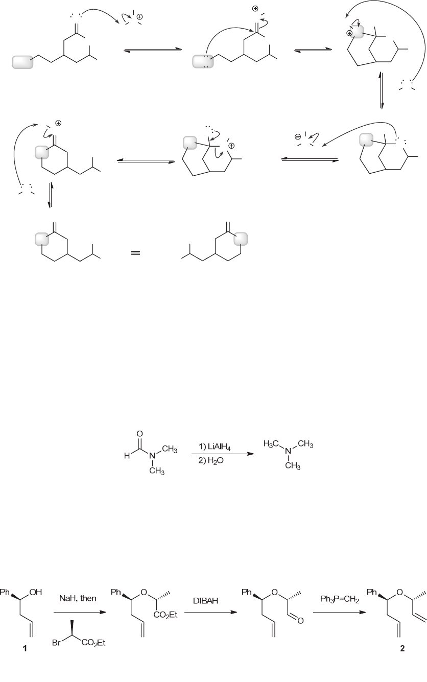 CHAPTER 20 823 O O O O R O O R H O O H HO R O HO R O HO R H HO HO OO O O R OH H O O R OH HO R H O H H H O H H O H H H O H 20.79. The lone pair of the nitrogen atom (of the amide group) is participating in aromaticity and is therefore unavailable to donate electron density into the carbonyl group. As a result, the carbonyl group is more electrophilic than the carbonyl group of a regular amide (where the lone pair contributes significant electron density to the carbonyl group via resonance). Also, when this compound functions as an electrophile in a nucleophilic acyl substitution reaction, the leaving group is particularly stable because it is an aromatic anion in which the negative charge is spread over all five atoms of the aromatic ring. With such a good leaving group, this compound more closely resembles the reactivity of an acid halide than an amide. 20.80. (a) DMF, like most amides, exhibits restricted rotation about the bond between the carbonyl group and the nitrogen atom, due to the significant contribution of the resonance form with a C=N double bond. This restricted rotation causes the methyl groups to be in different electronic environments. They are not chemically equivalent, and will therefore produce two different signals (in addition to the signal from the other proton in the compound). Upon treatment with excess LiAlH4, followed by water work-up, DMF is reduced to an amine: This amine does not exhibit restricted rotation. As such, all of the methyl groups are now chemically equivalent and will together produce only one signal. (b) Restricted rotation causes the methyl groups to be in different electronic environments. As a result, the 13C NMR spectrum of DMF should have three signals. 20.81. The first step of the synthesis involves deprotonation of the alcohol group in compound 1 using NaH, generating an alkoxide ion. This alkoxide ion is then treated with the chiral 2-bromo ethyl ester, to give an SN2 reaction (note the inversion of configuration of the chiral center bearing the methyl group). Reduction of the ester with DIBAH provides an aldehyde, which is transformed into the terminal olefin (compound 2) using a Wittig reaction. www.MyEbookNiche.eCrater.com