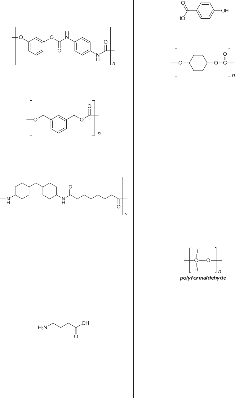 CHAPTER 27 1091 (b) The starting materials are a diol and a diisocyanate, which can be linked together as carbamate groups, giving the following polyurethane: (c) The starting materials are a diol and phosgene, which will react with each other to give carbonate groups, and thus the following polycarbonate: 27.30. (a) The starting materials are a diacid and a diamine, which can be linked together via amide groups, giving the following polymer: (b) Quiana is a polyamide. (c) Quiana is a step-growth polymer, because each of the growing oligomers has two growth points. (d) Quiana is a condensation polymer because it is made via a condensation process (between carboxylic acid and amino groups). 27.31. (a) Each of the amide groups can be made from the reaction between a carboxylic acid and an amino group. Therefore, this polymer can be made from the following monomer, which bears both the amino group and the carboxylic acid group: (b) Each of the ester groups can be made from the reaction between a carboxylic acid and an alcohol. Therefore, this polymer can be made from the following monomer, which bears both a hydroxyl group and a carboxylic acid group: 27.32. The starting materials are a diol and phosgene, which will react with each other to give carbonate groups, and thus the following polycarbonate: 27.33. (a) Each monomer has two growth points, so we expect that polymerization will generate a step-growth polymer. (b) When these monomers react are used to form a copolymer, the growing polymer chain has only one growth point, so we expect that polymerization will generate a chain-growth polymer. 27.34. Nitro groups are among the most powerful electron-withdrawing groups, and a nitro group stabilizes a negative charge on an adjacent carbon atom, thereby facilitating anionic polymerization. 27.35. Shower curtains are made from PVC, which is a thermoplastic polymer. To prevent the polymer from being brittle, the polymer is prepared in the presence of plasticizers which become trapped between the polymer chains where they function as lubricants. Over time, the plasticizers evaporate, and the polymer becomes brittle. 27.36. (a) Polyformaldehyde is a polymer that is assembled from repeating formaldehyde (CH2O) units, as shown: (b) Polyformaldehyde has repeating ether groups, so it is a polyether. (c) The growing polymer chain has only one growth point, so polyformaldehyde is classified as a chain- growth polymer. (d) Polyformaldehyde is an addition polymer, because it is formed via successive addition reactions (involving the bond in each molecule of formaldehyde). 27.37. It bears an electron-withdrawing group (CN) that can stabilize a negative charge via resonance, but it also bears an electron-donating group (OMe) that can stabilize a positive charge via resonance. 27.38. The nitro group serves as a reservoir of electron density that stabilizes a negative charge via resonance (see Chapter 18). www.MyEbookNiche.eCrater.com